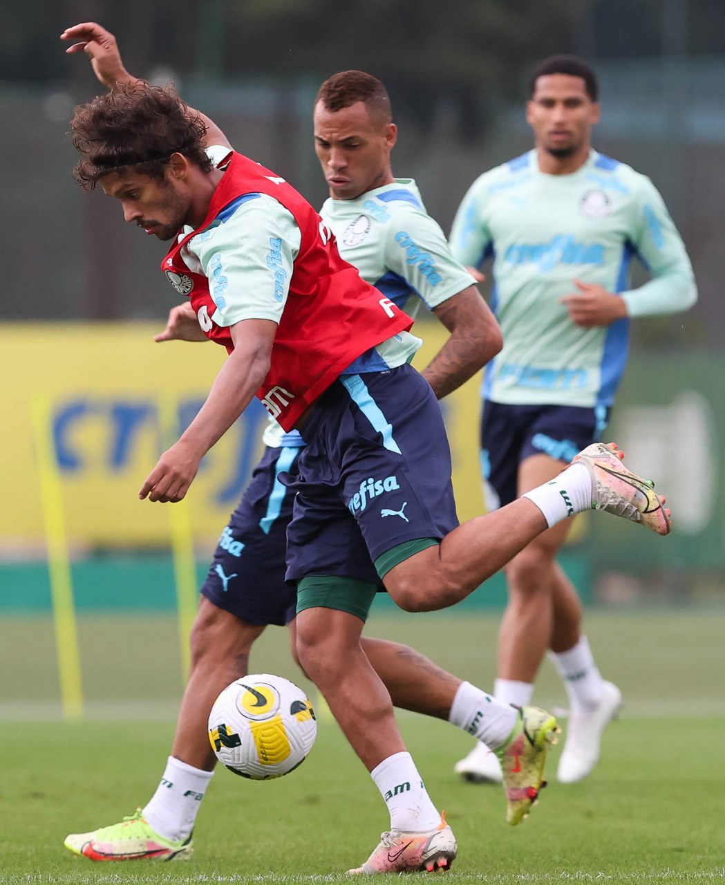Os jogadores Naves, Gustavo Gómez, Rafael Navarro, Fabinho, Vanderlan, Luan e Raphael Veiga (E/D em pé) e Pedro Bicalho, Danilo, Mayke, Jhonatan e Gustavo Scarpa e o goleiro Weverton (E/D agachados), da SE Palmeiras, durante treinamento, na Academia de Futebol. (Foto: Cesar Greco)
