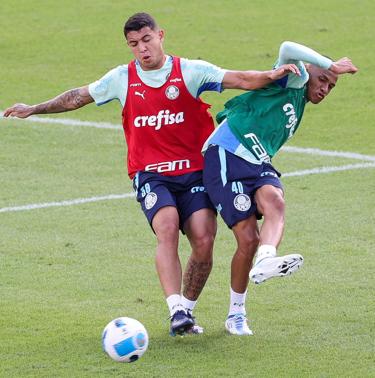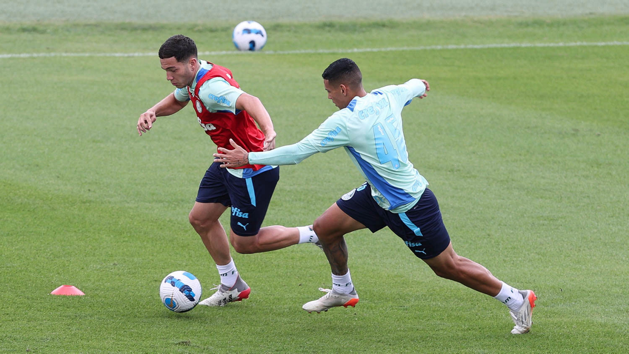 Os jogadores Gabriel Menino e Vanderlan (D), da SE Palmeiras, durante treinamento, na Academia de Futebol. (Foto: Cesar Greco)