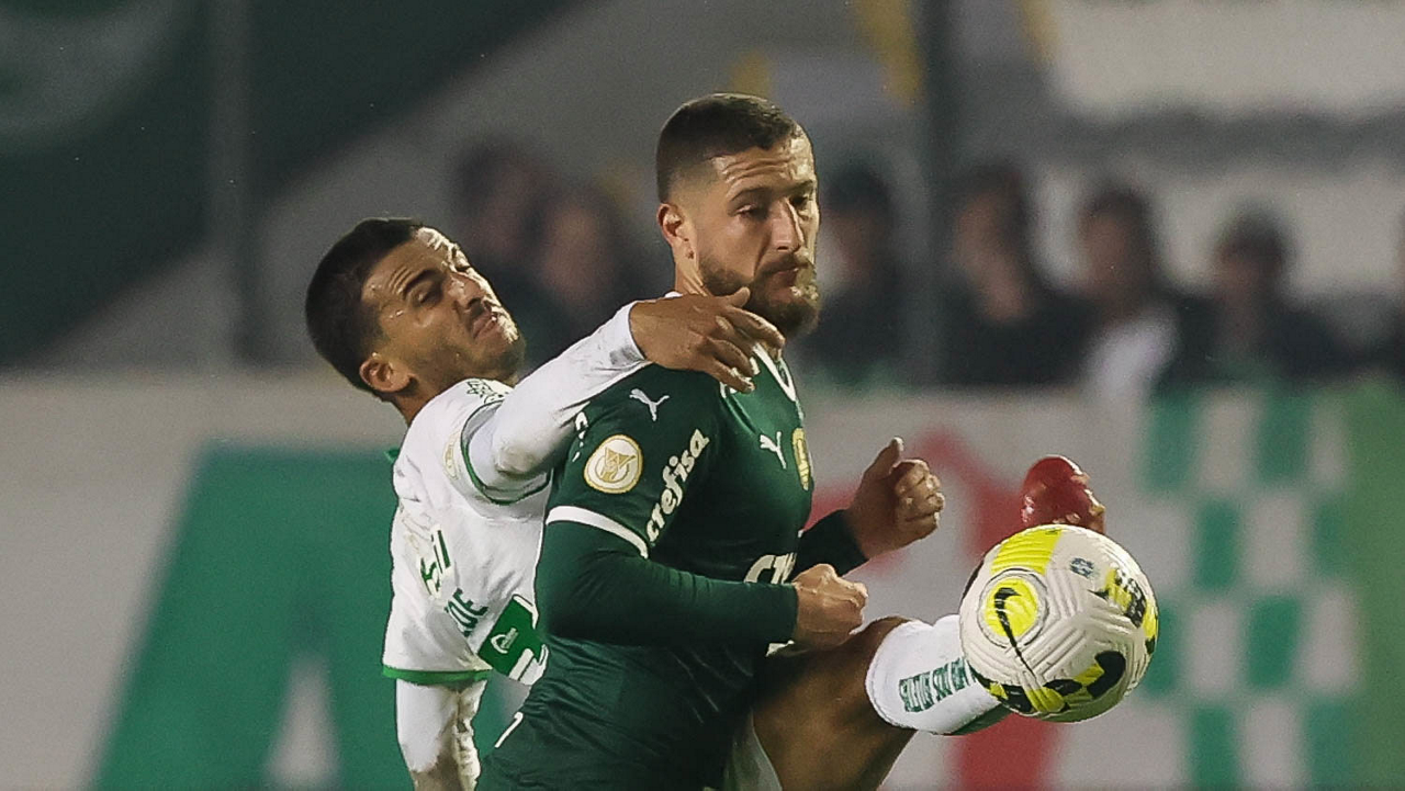 O jogador Danilo, da SE Palmeiras, disputa bola com o jogador Pitta, do EC Juventude, durante partida válida pela sétima rodada, do Campeonato Brasileiro, Série A, no Estádio Alfredo Jaconi. (Foto: Cesar Greco)