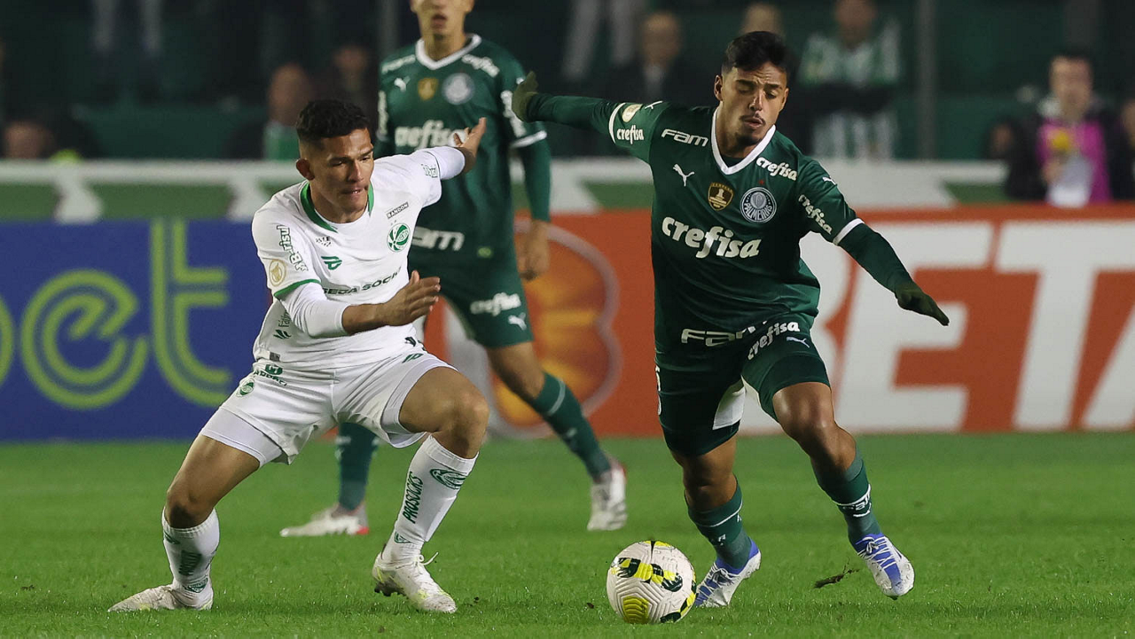 O jogador Gabriel Menino, da SE Palmeiras, disputa bola com o jogador, do EC Juventude, durante partida válida pela sétima rodada, do Campeonato Brasileiro, Série A, no Estádio Alfredo Jaconi. (Foto: Cesar Greco)