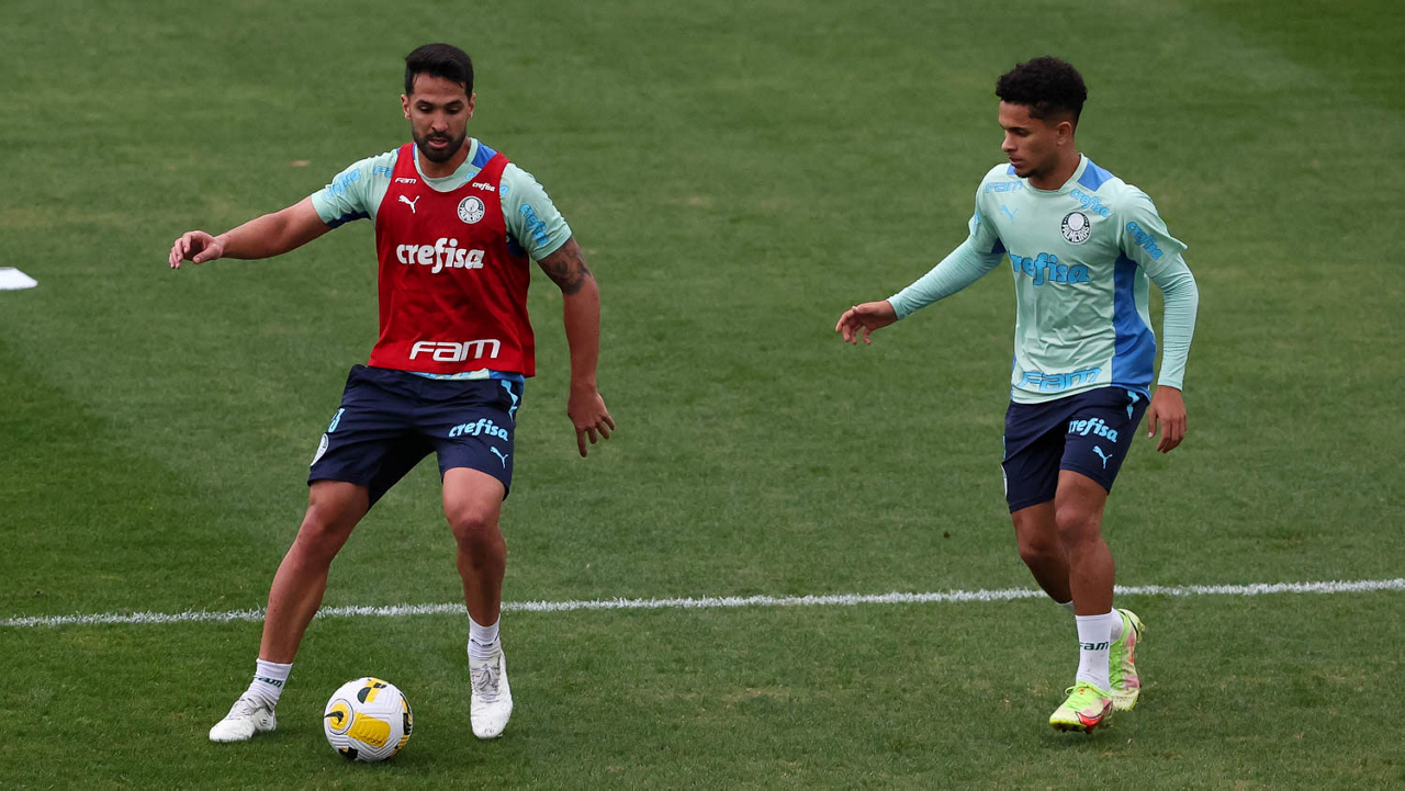 Os jogadores Gabriel Silva e Fabinho (D), da SE Palmeiras, durante treinamento, na Academia de Futebol. (Foto: Cesar Greco)