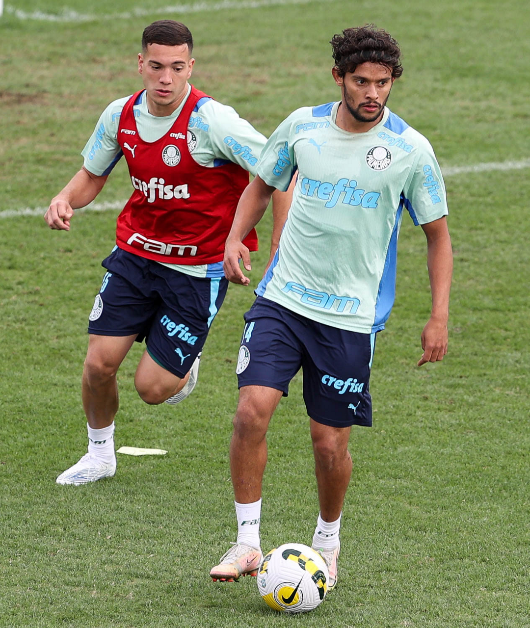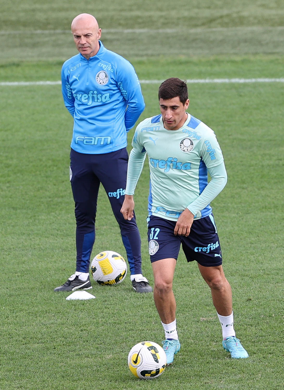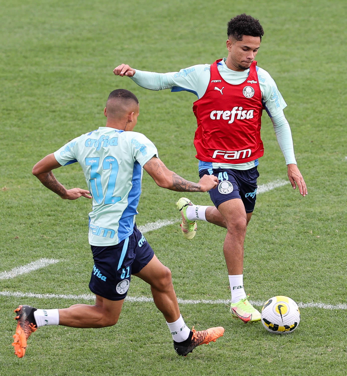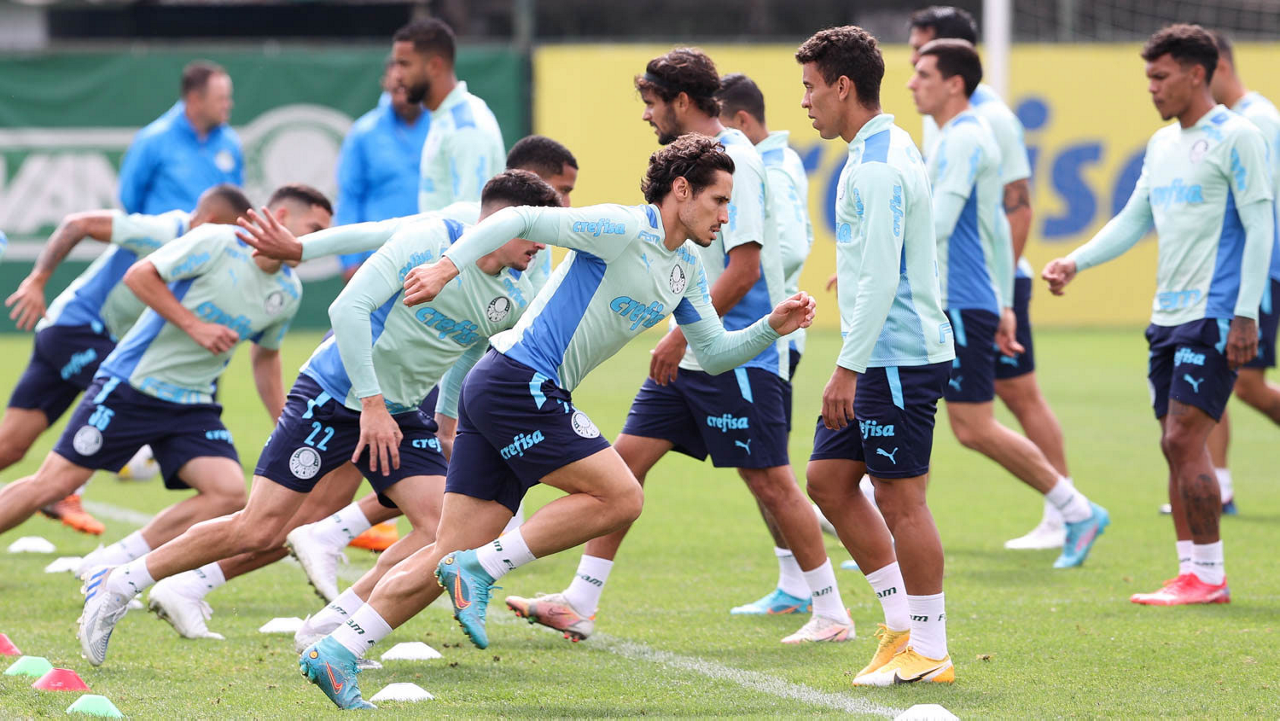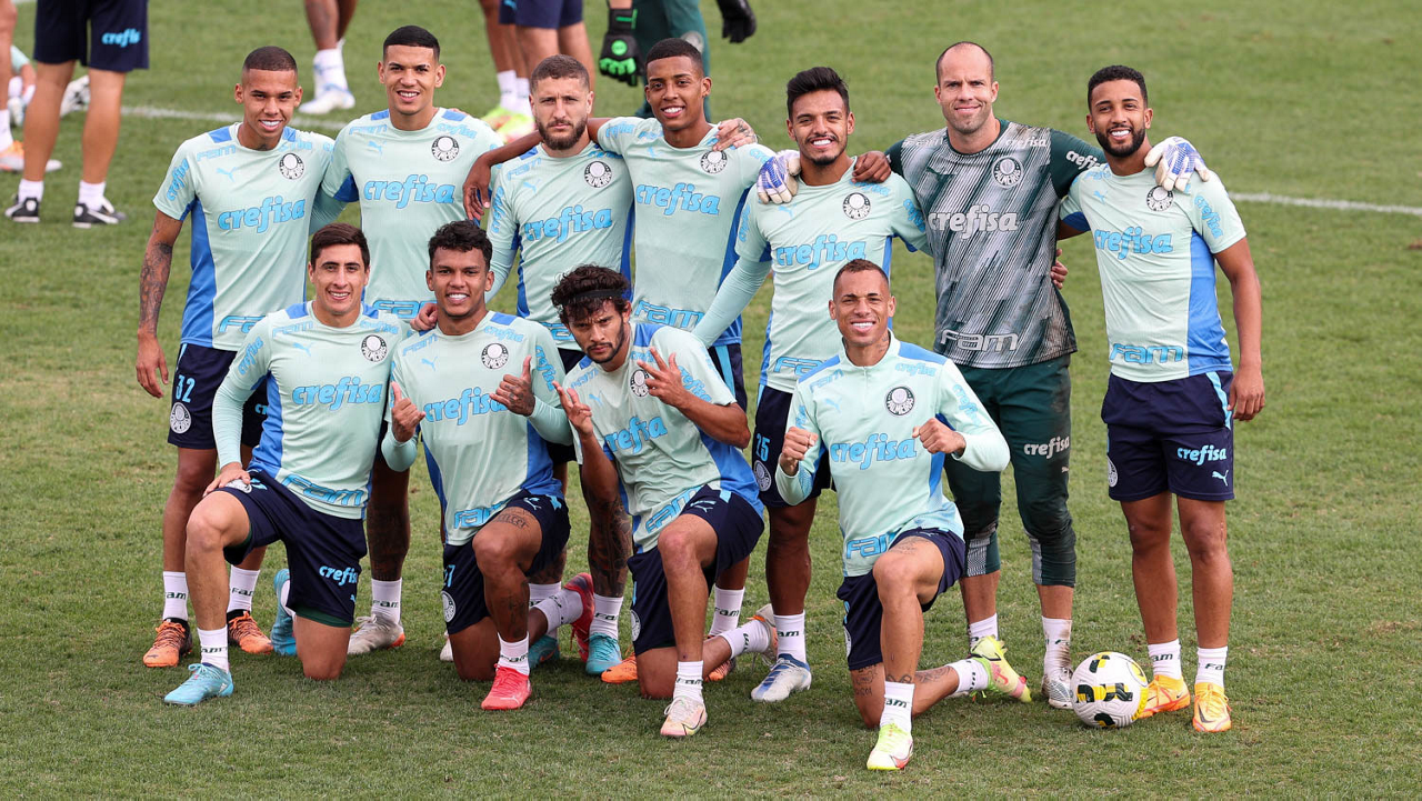 Os jogadores Garcia, Naves, Zé Rafael, Vanderlan, Gabriel Menino, Marcelo Lomba e Jorge (E/D em pé) e Miguel Merentiel, Gabriel Veron, Gustavo Scarpa e Breno Lopes (E/D agachados), da SE Palmeiras, durante treinamento, na Academia de Futebol. (Foto: Cesar Greco)