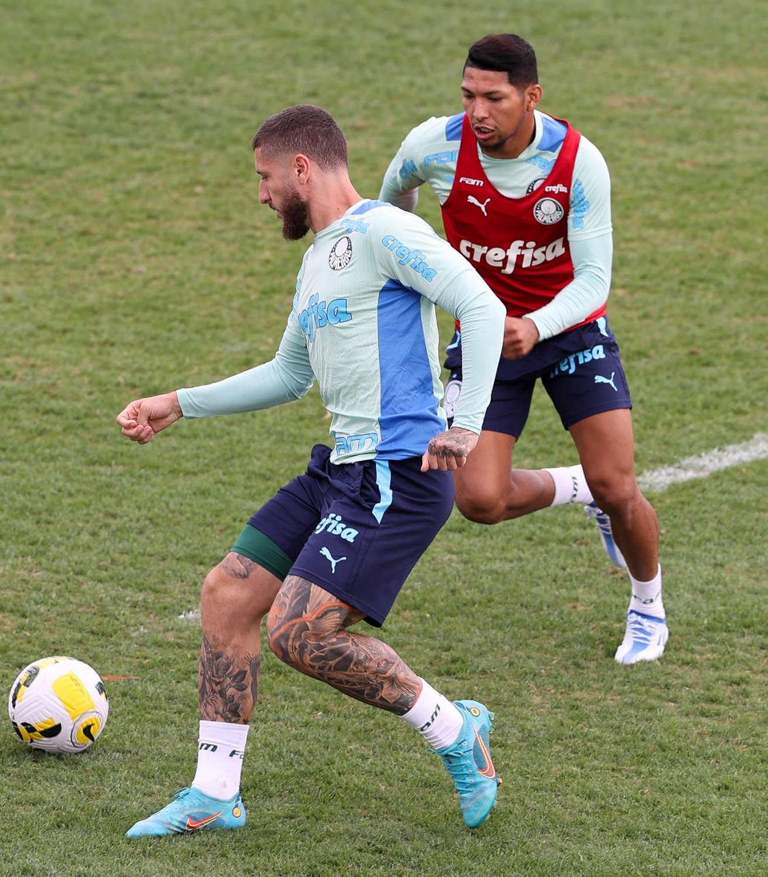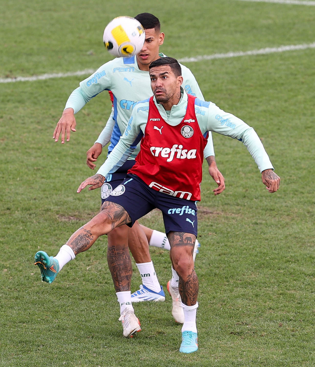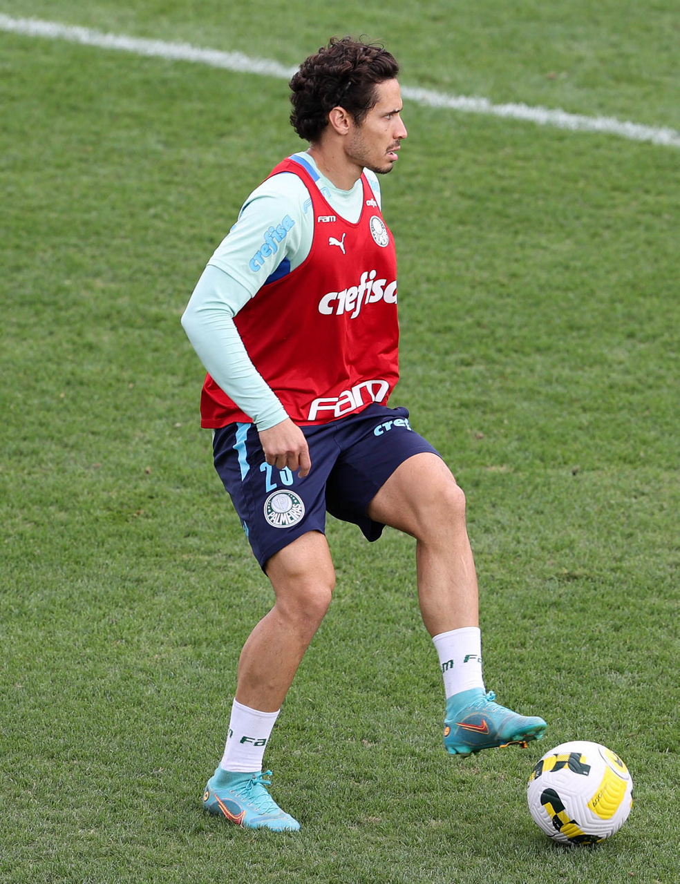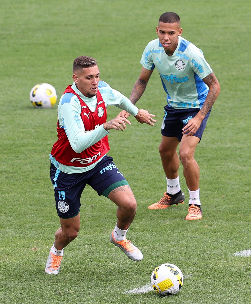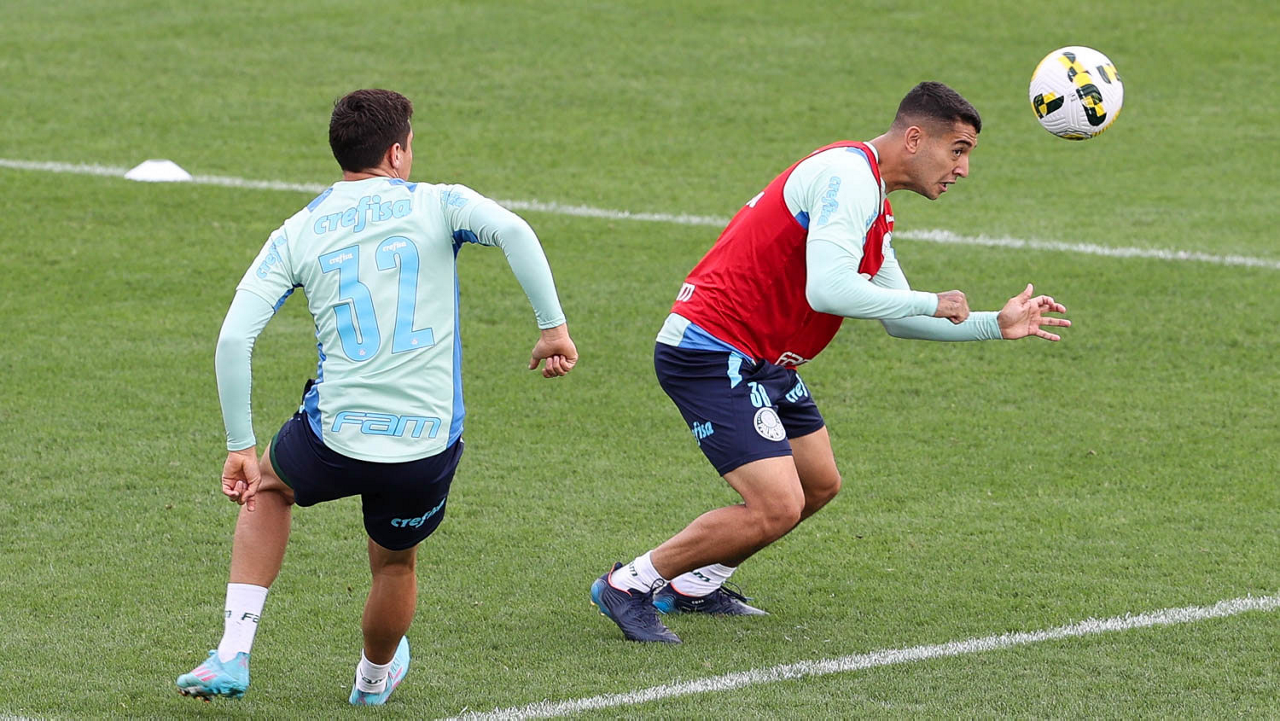 Os jogadores Garcia, Naves, Zé Rafael, Vanderlan, Gabriel Menino, Marcelo Lomba e Jorge (E/D em pé) e Miguel Merentiel, Gabriel Veron, Gustavo Scarpa e Breno Lopes (E/D agachados), da SE Palmeiras, durante treinamento, na Academia de Futebol. (Foto: Cesar Greco)