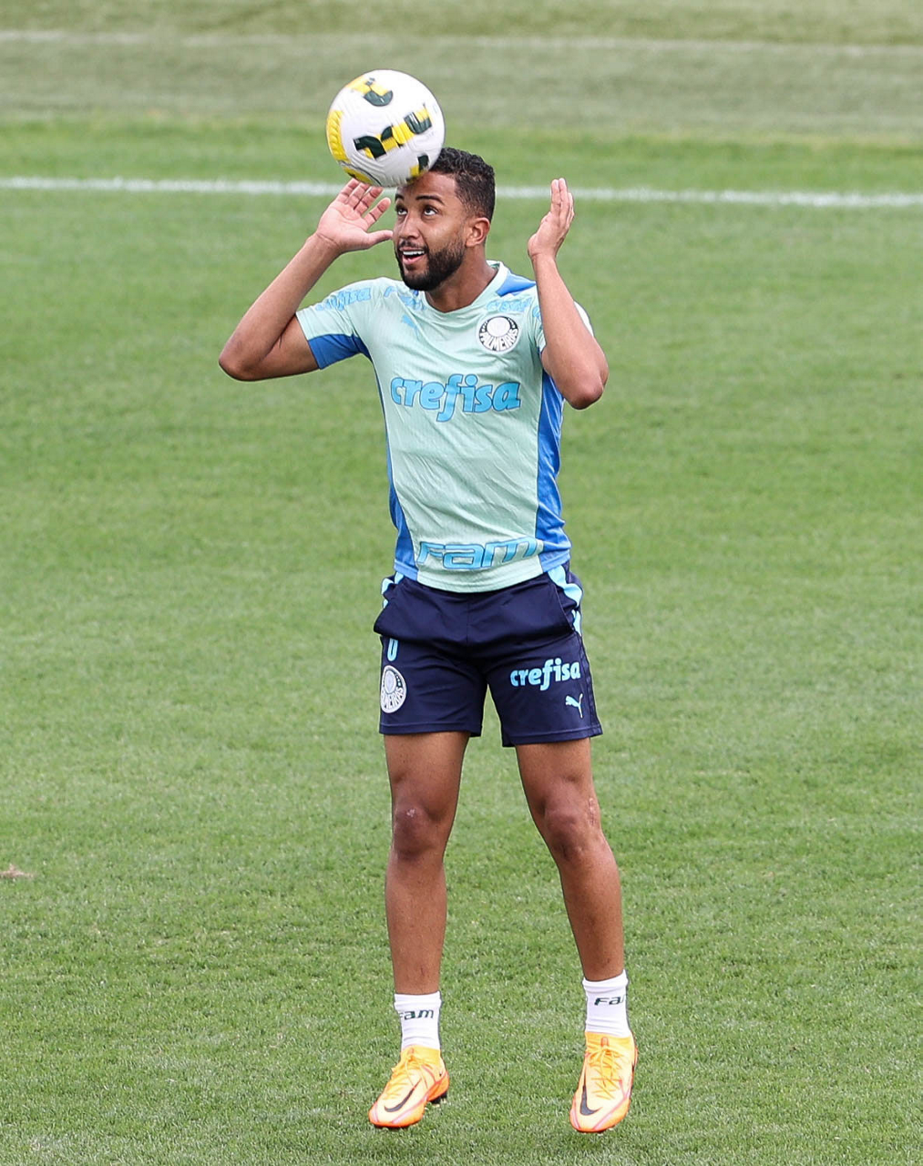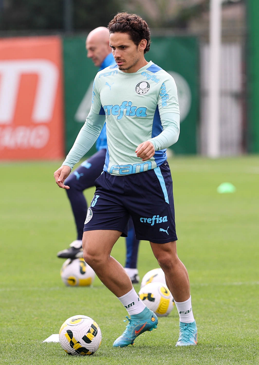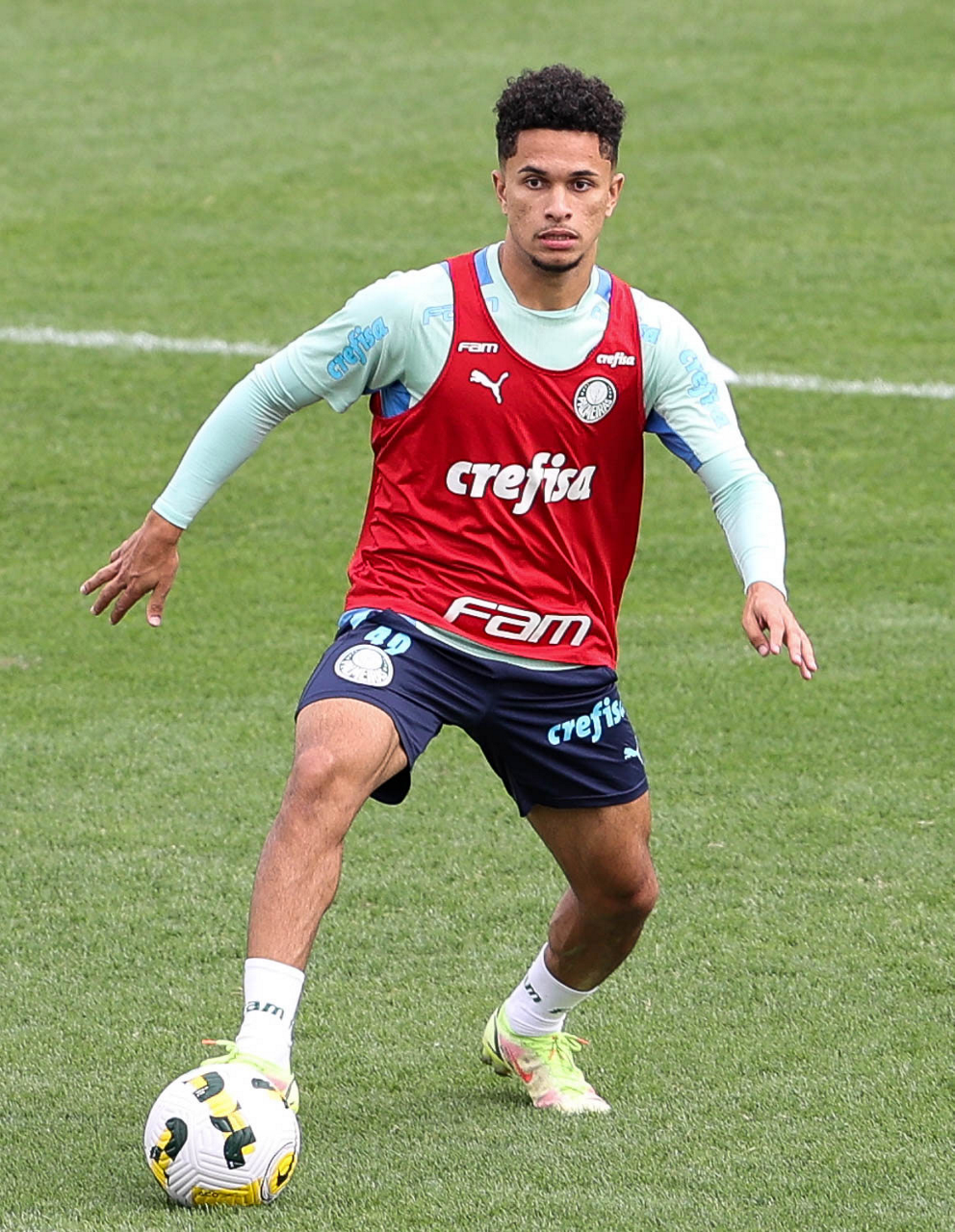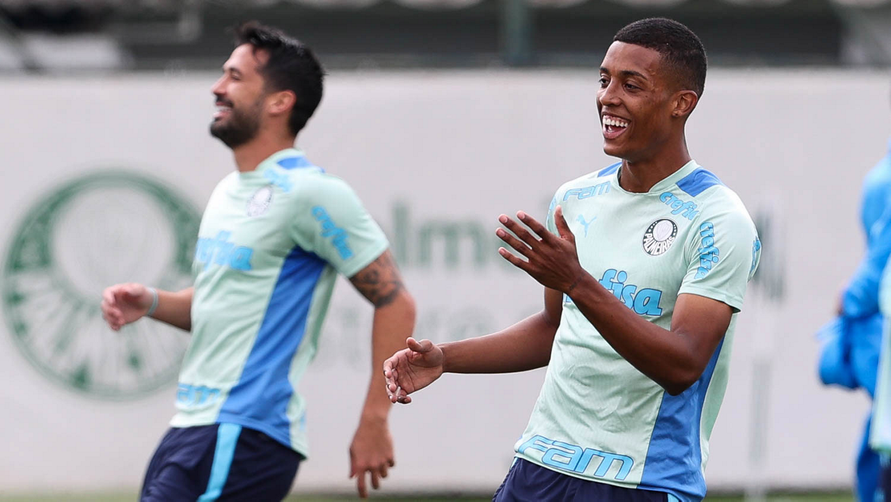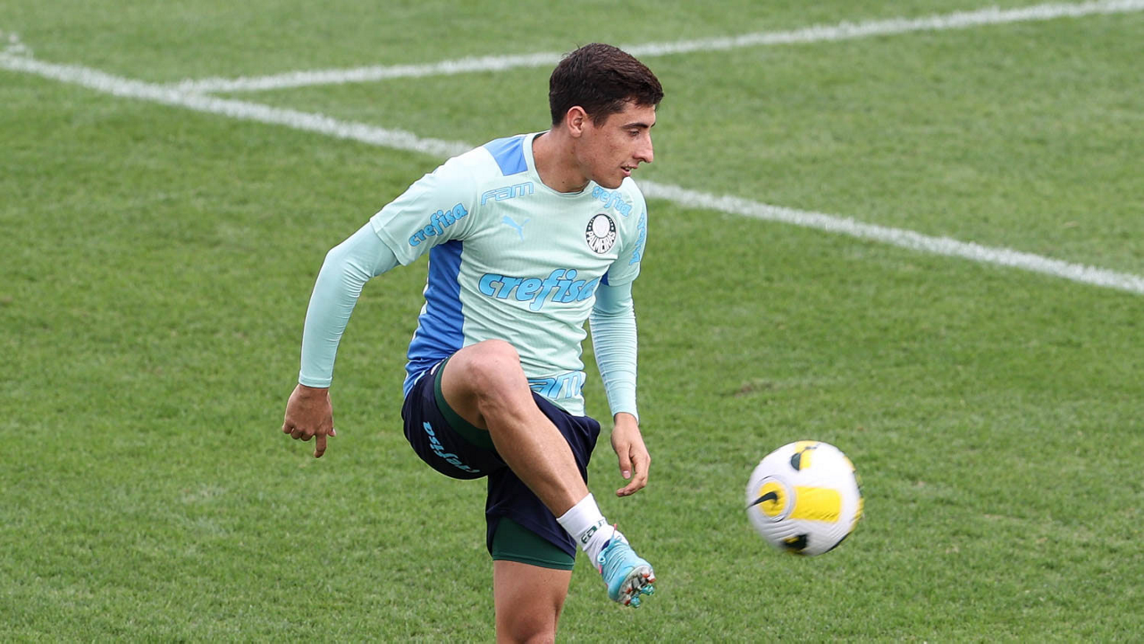 Os jogadores Garcia, Naves, Zé Rafael, Vanderlan, Gabriel Menino, Marcelo Lomba e Jorge (E/D em pé) e Miguel Merentiel, Gabriel Veron, Gustavo Scarpa e Breno Lopes (E/D agachados), da SE Palmeiras, durante treinamento, na Academia de Futebol. (Foto: Cesar Greco)