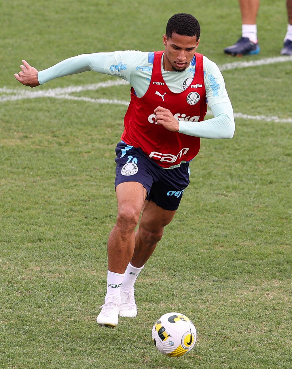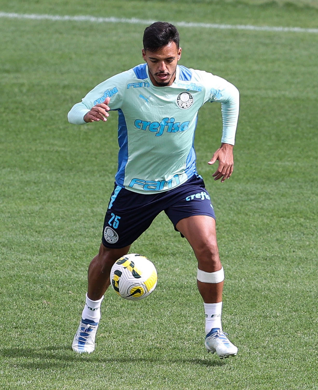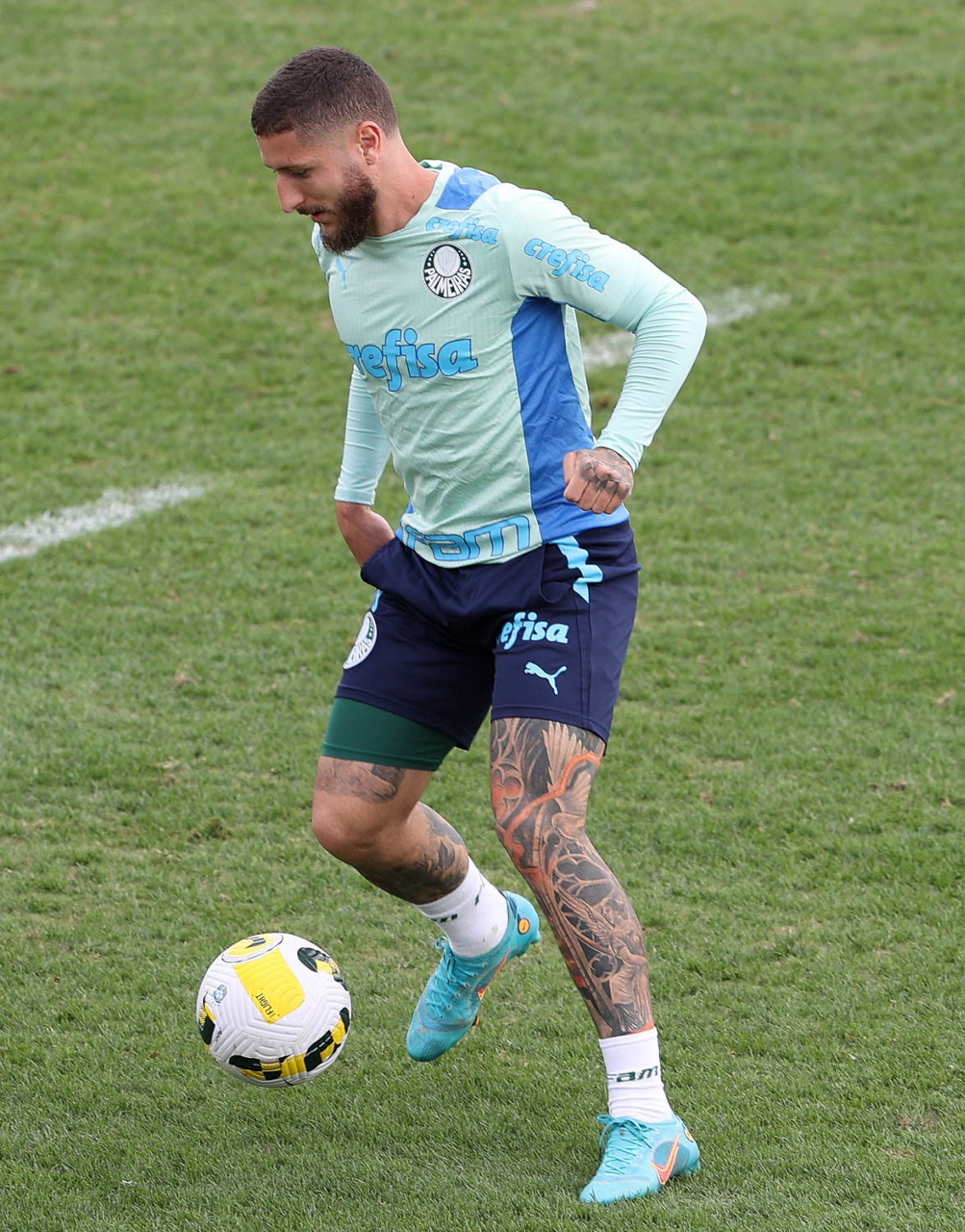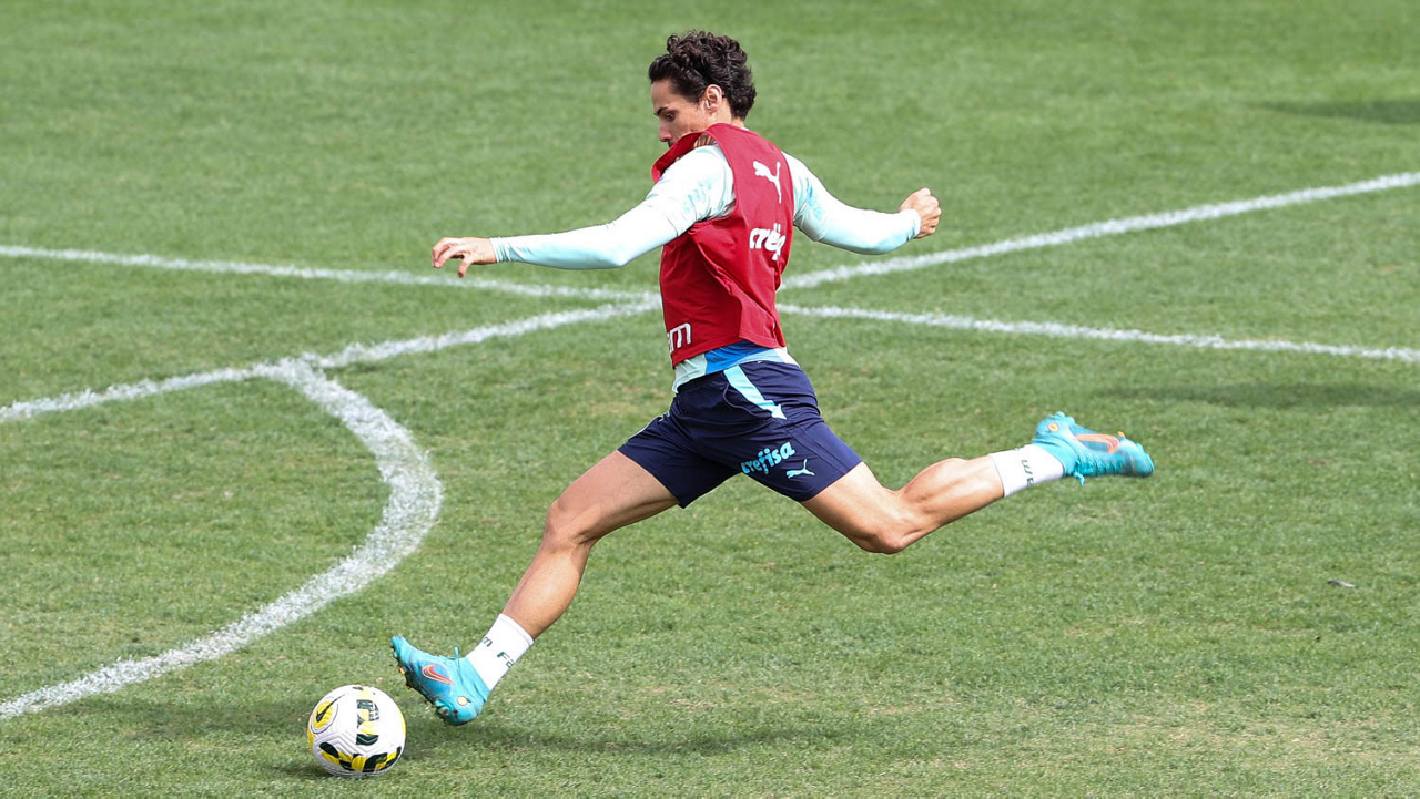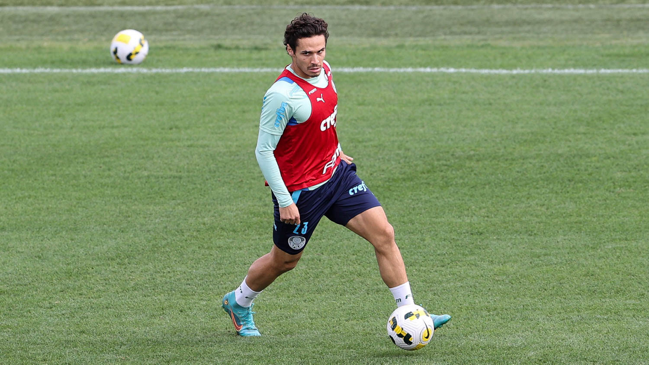 Os jogadores Garcia, Naves, Zé Rafael, Vanderlan, Gabriel Menino, Marcelo Lomba e Jorge (E/D em pé) e Miguel Merentiel, Gabriel Veron, Gustavo Scarpa e Breno Lopes (E/D agachados), da SE Palmeiras, durante treinamento, na Academia de Futebol. (Foto: Cesar Greco)
