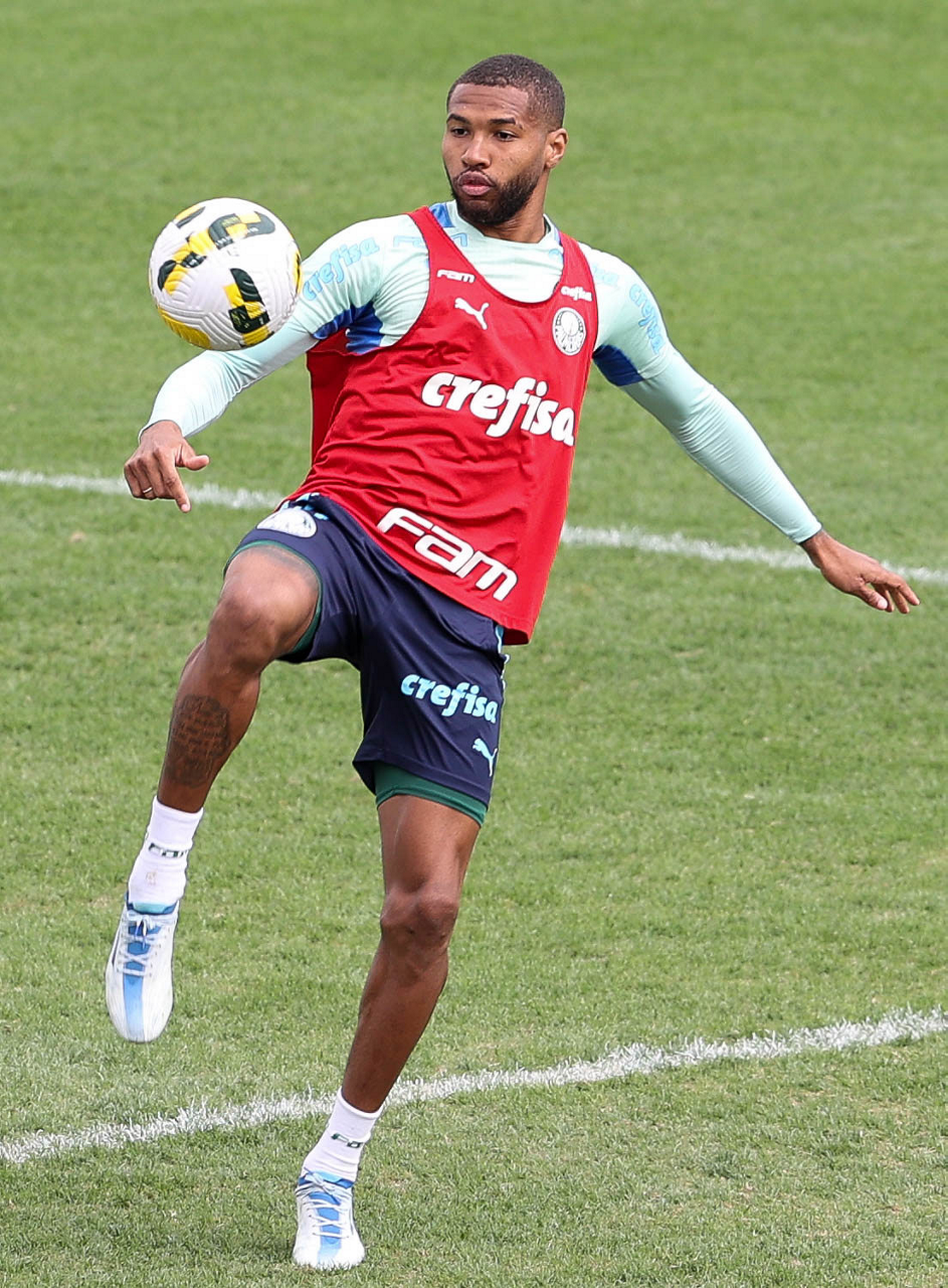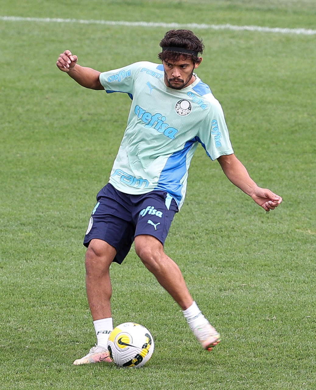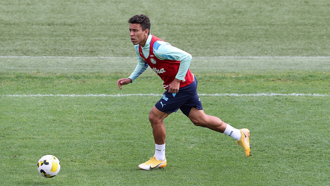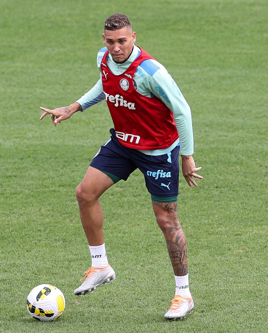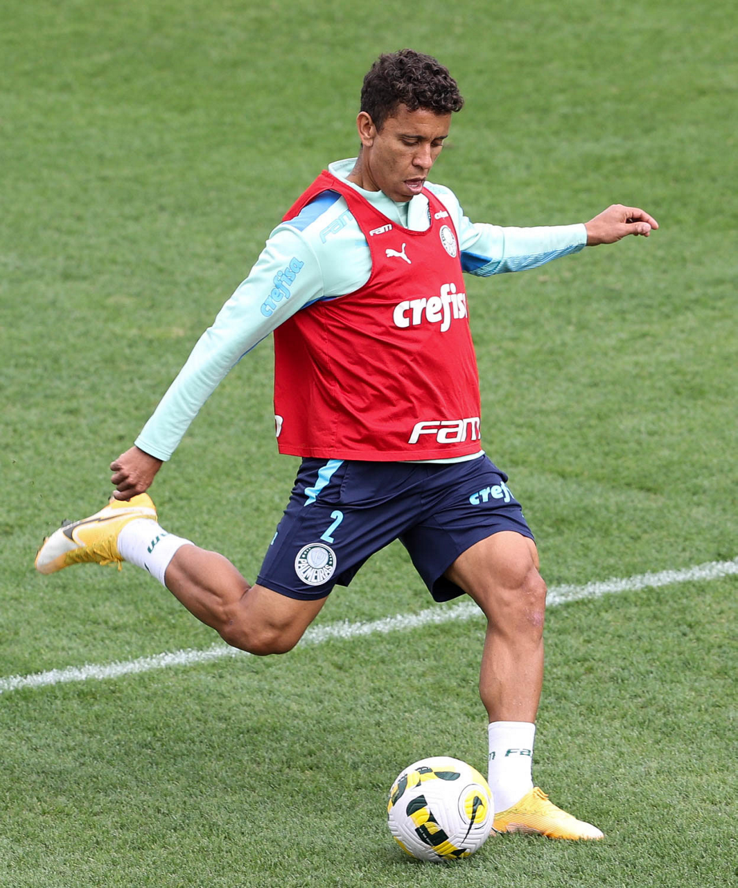 Os jogadores Garcia, Naves, Zé Rafael, Vanderlan, Gabriel Menino, Marcelo Lomba e Jorge (E/D em pé) e Miguel Merentiel, Gabriel Veron, Gustavo Scarpa e Breno Lopes (E/D agachados), da SE Palmeiras, durante treinamento, na Academia de Futebol. (Foto: Cesar Greco)