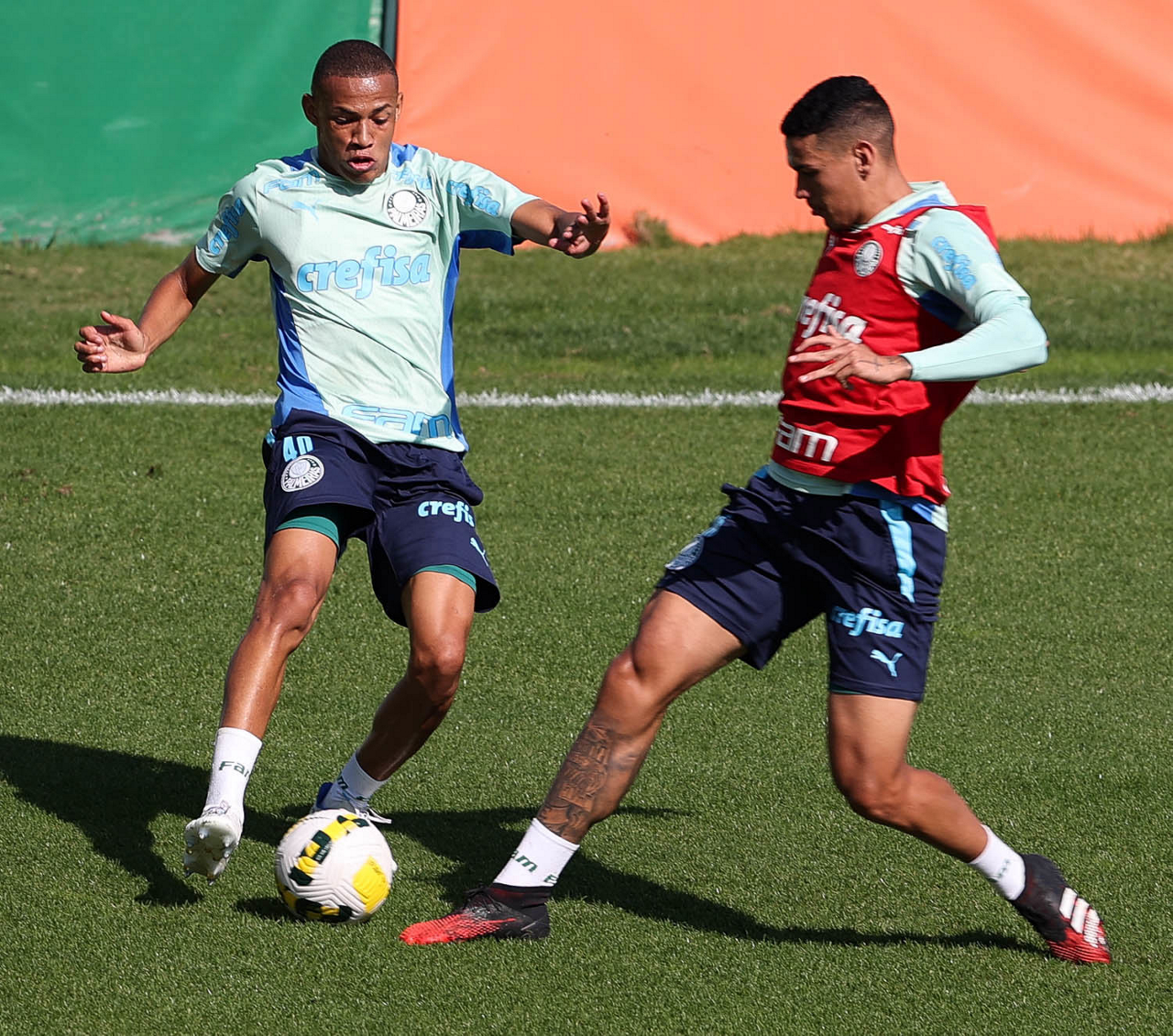 Os jogadores Breno Lopes e Eduard Atuesta (D), da SE Palmeiras, durante treinamento, na Academia de Futebol. (Foto: Cesar Greco)
