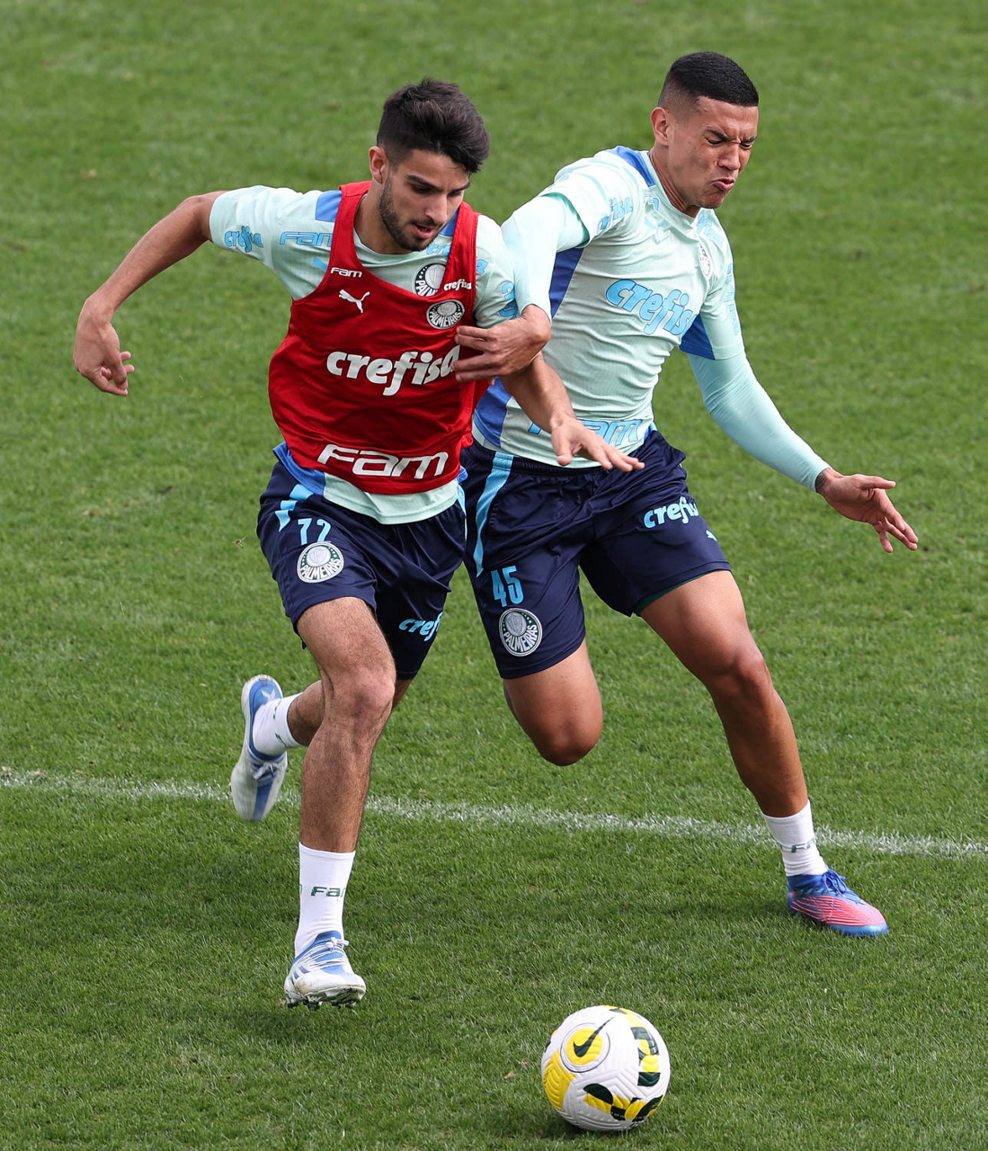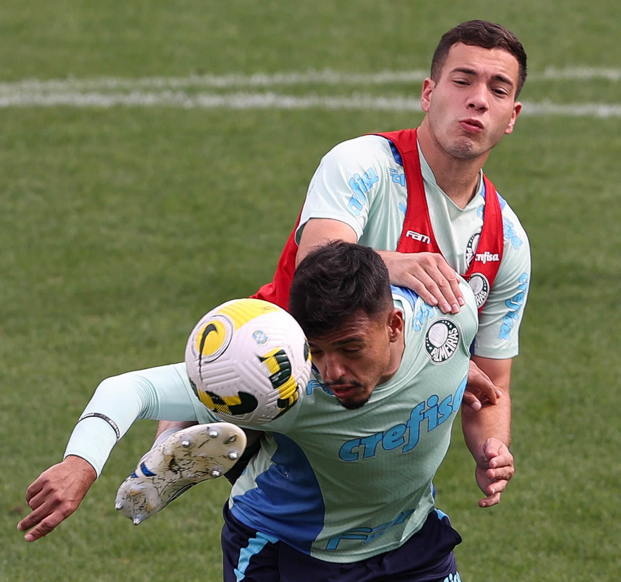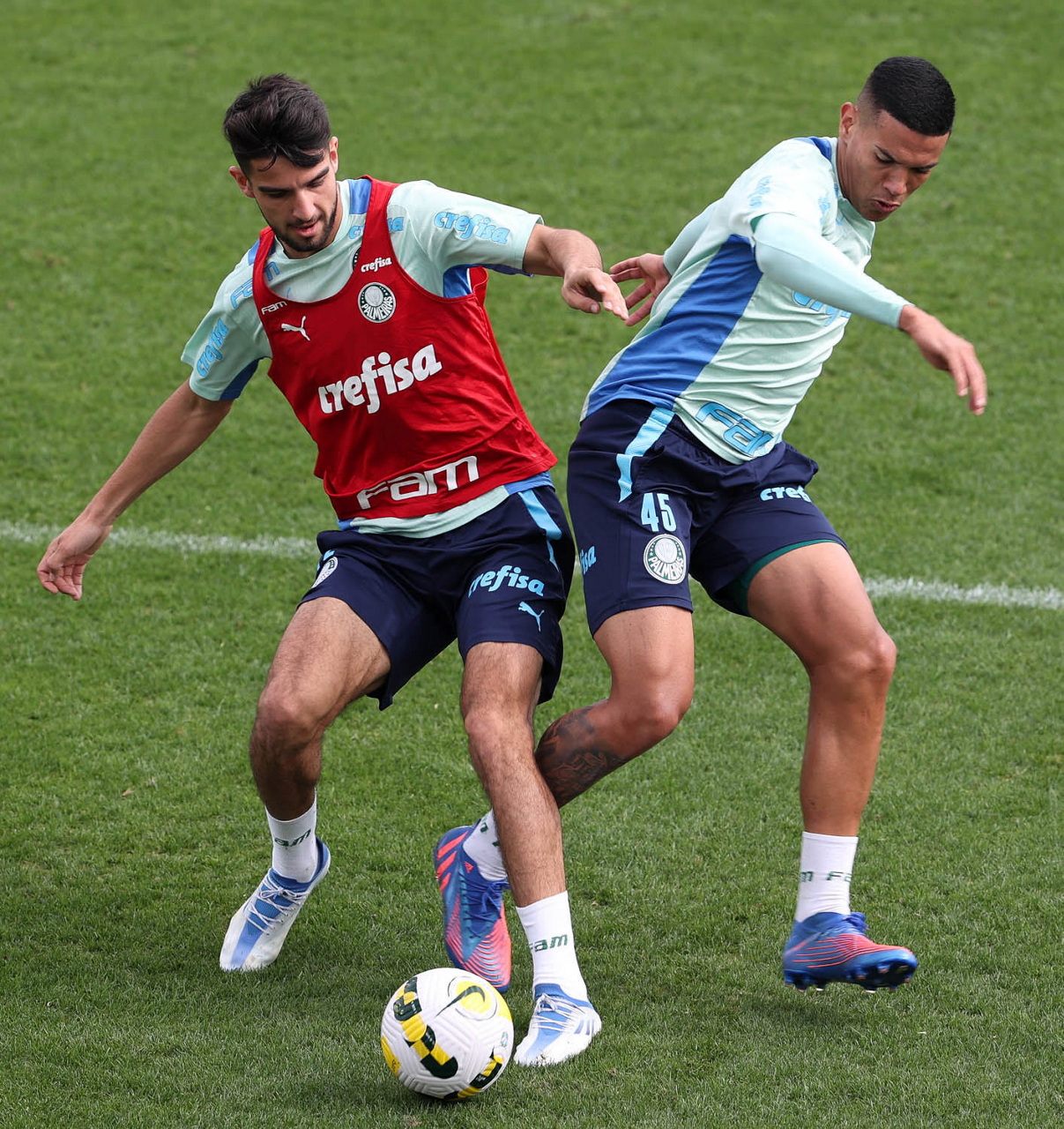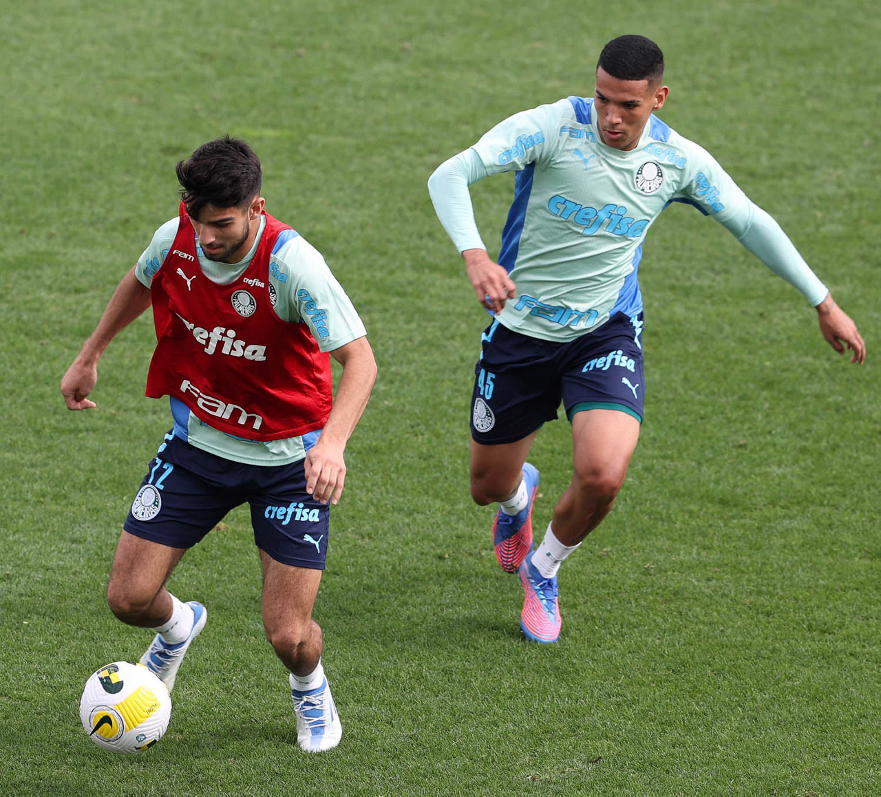 Os jogadores Gabriel Menino e Zé Rafael (D), da SE Palmeiras, durante treinamento na Academia de Futebol. (Foto: Cesar Greco)