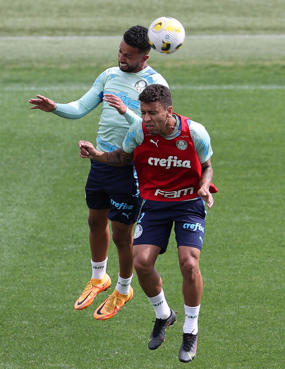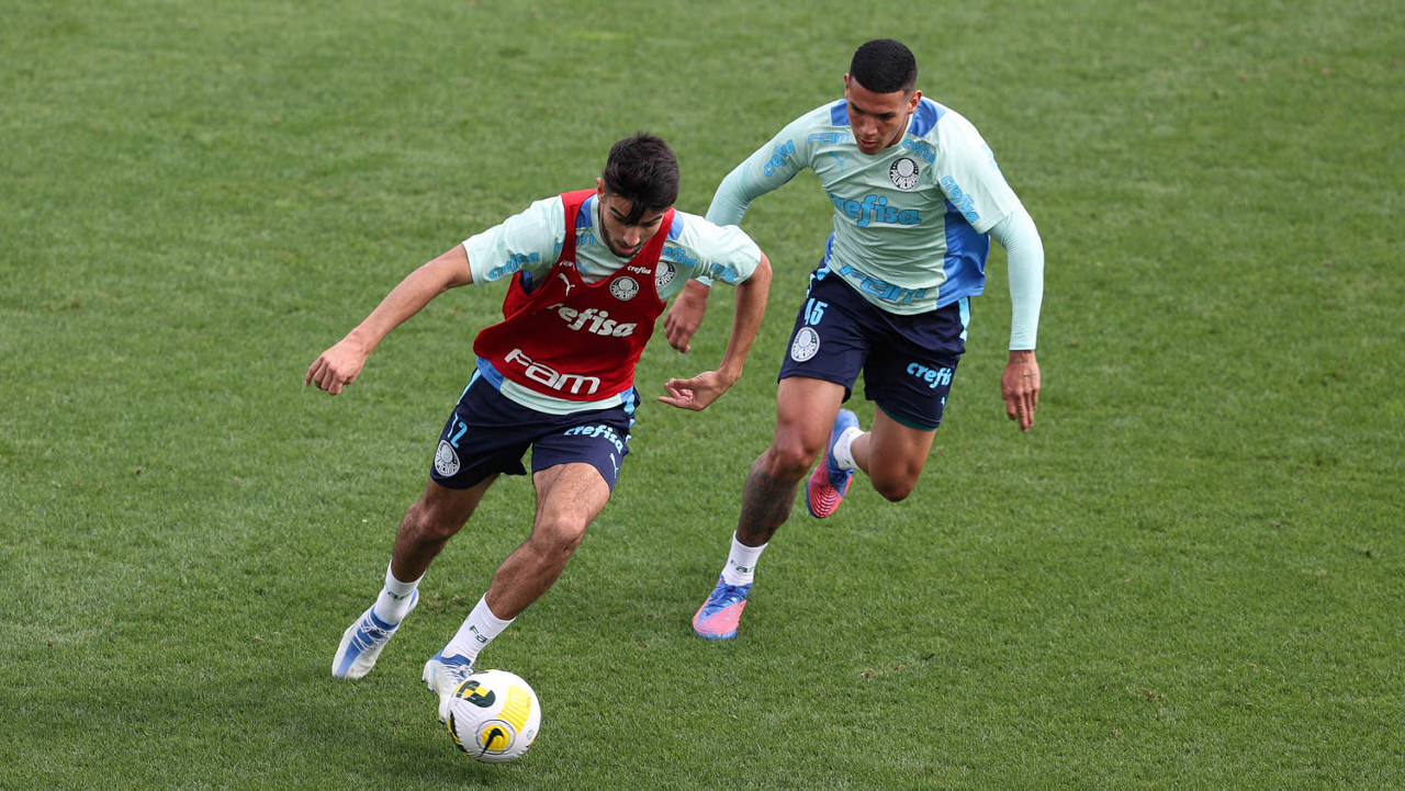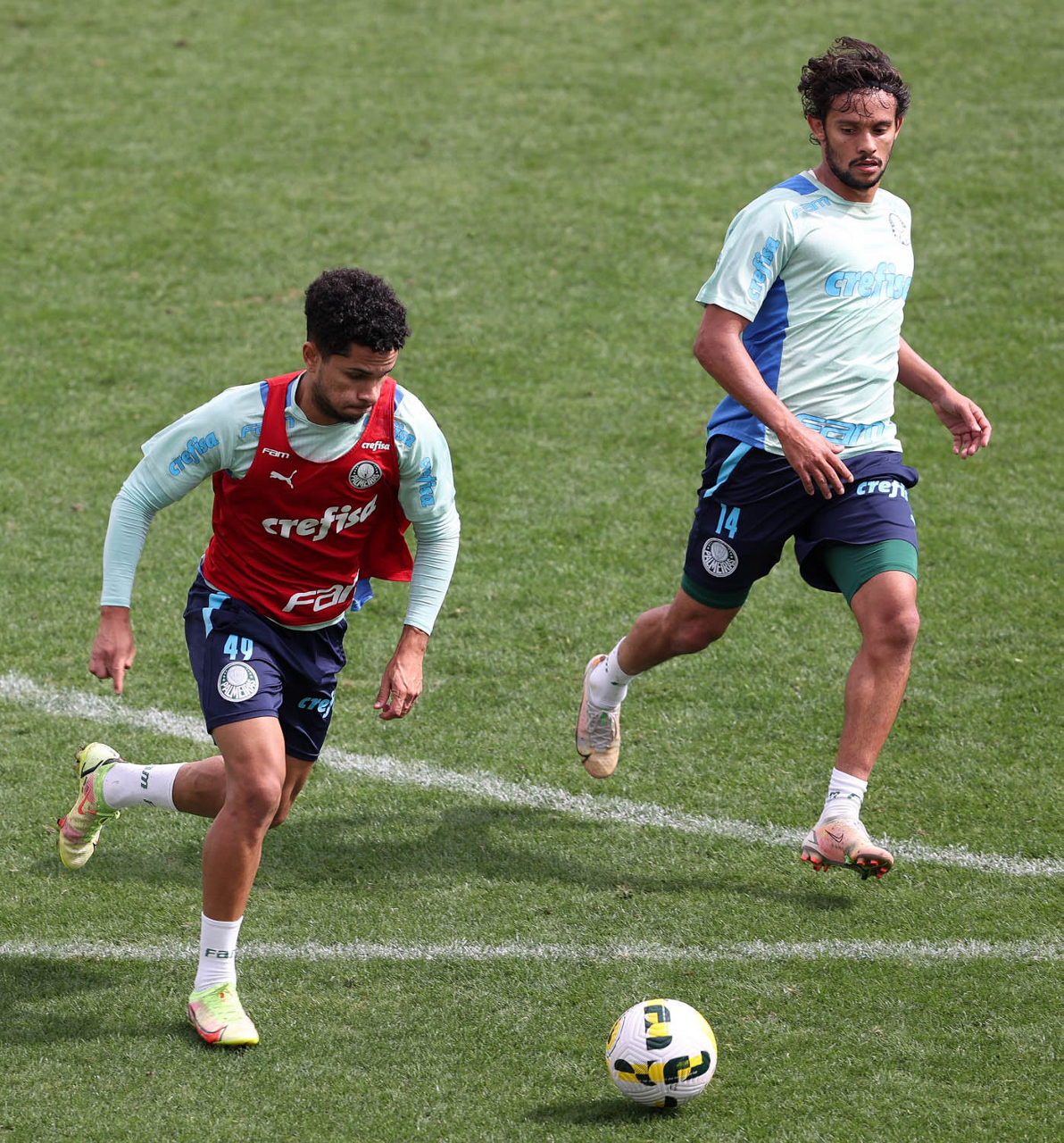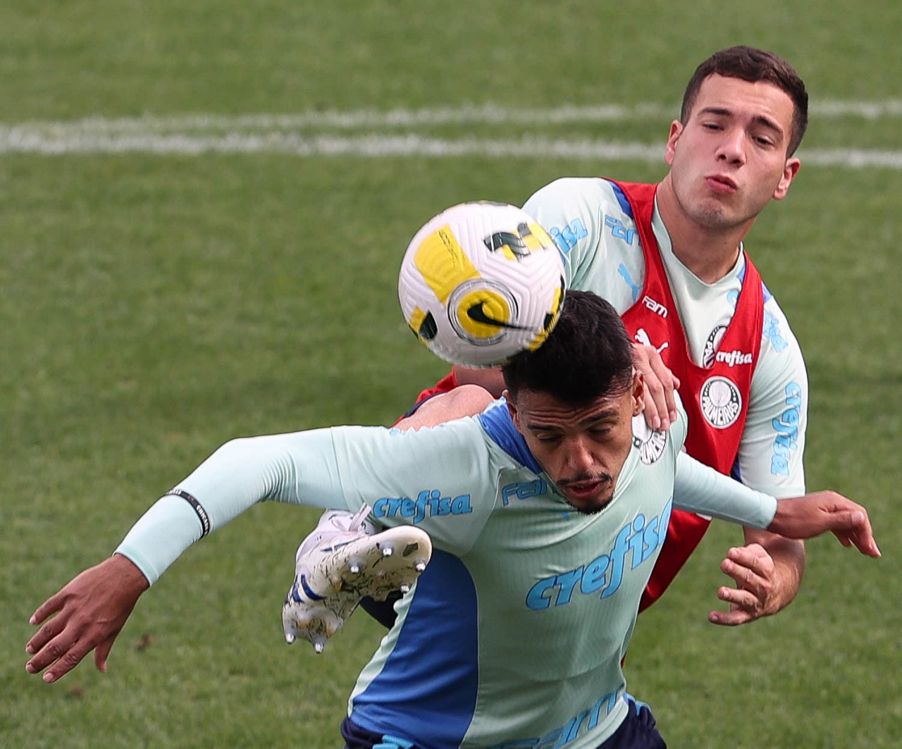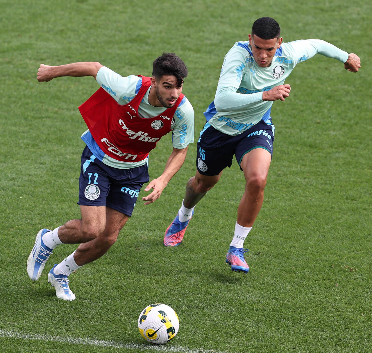 Os jogadores Gabriel Menino e Zé Rafael (D), da SE Palmeiras, durante treinamento na Academia de Futebol. (Foto: Cesar Greco)