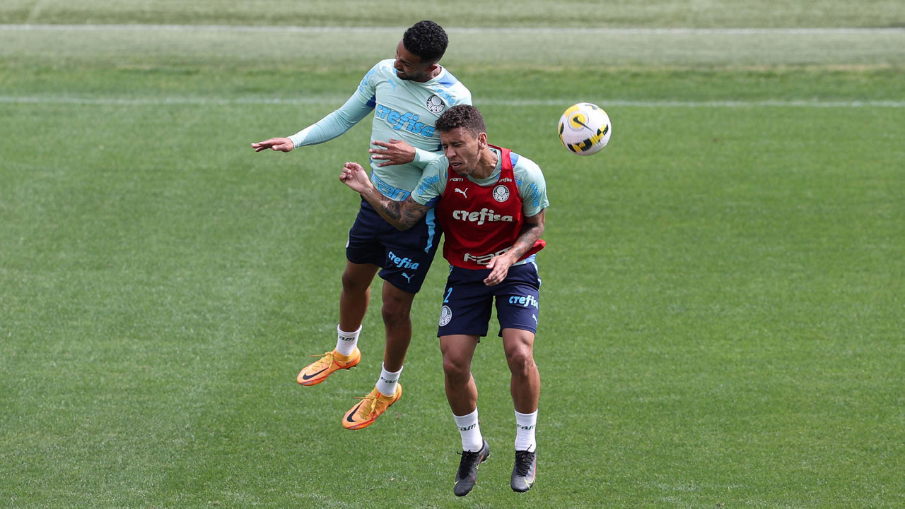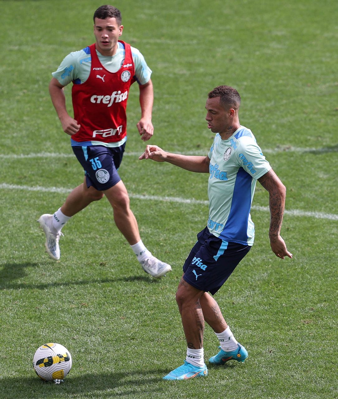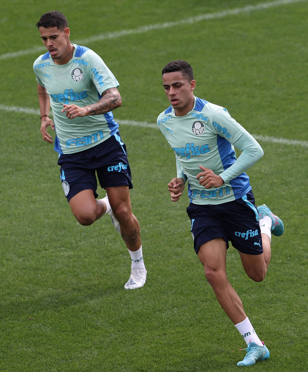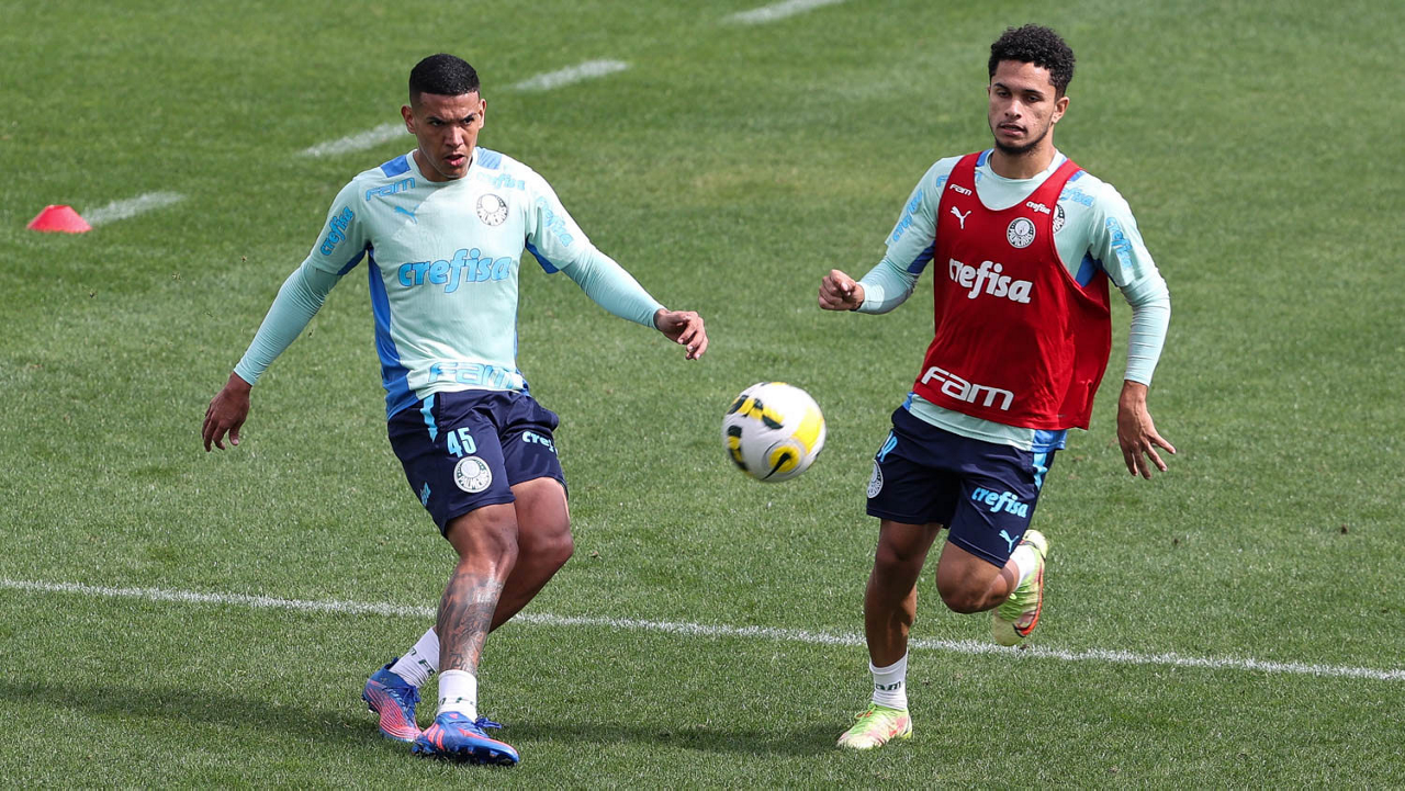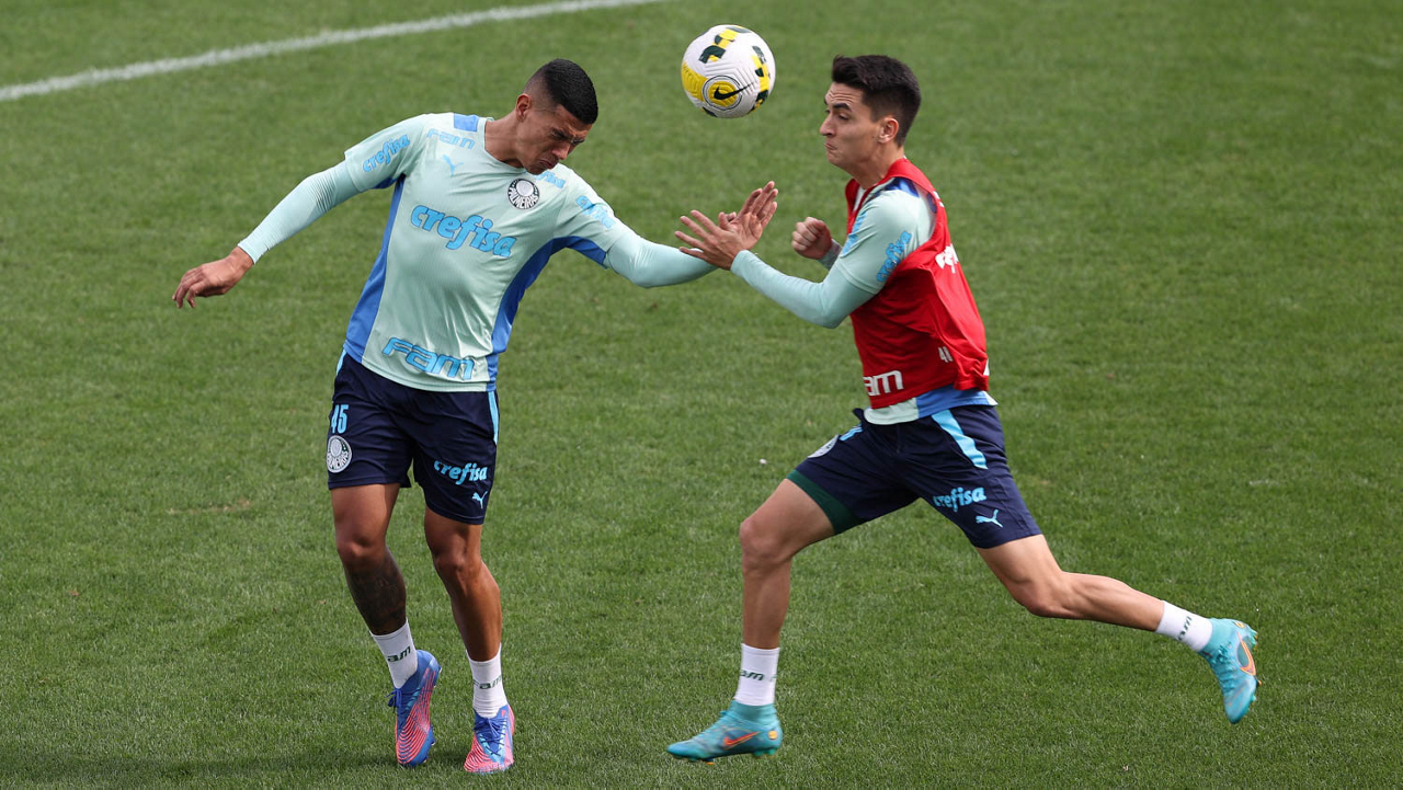 Os jogadores Gabriel Menino e Zé Rafael (D), da SE Palmeiras, durante treinamento na Academia de Futebol. (Foto: Cesar Greco)