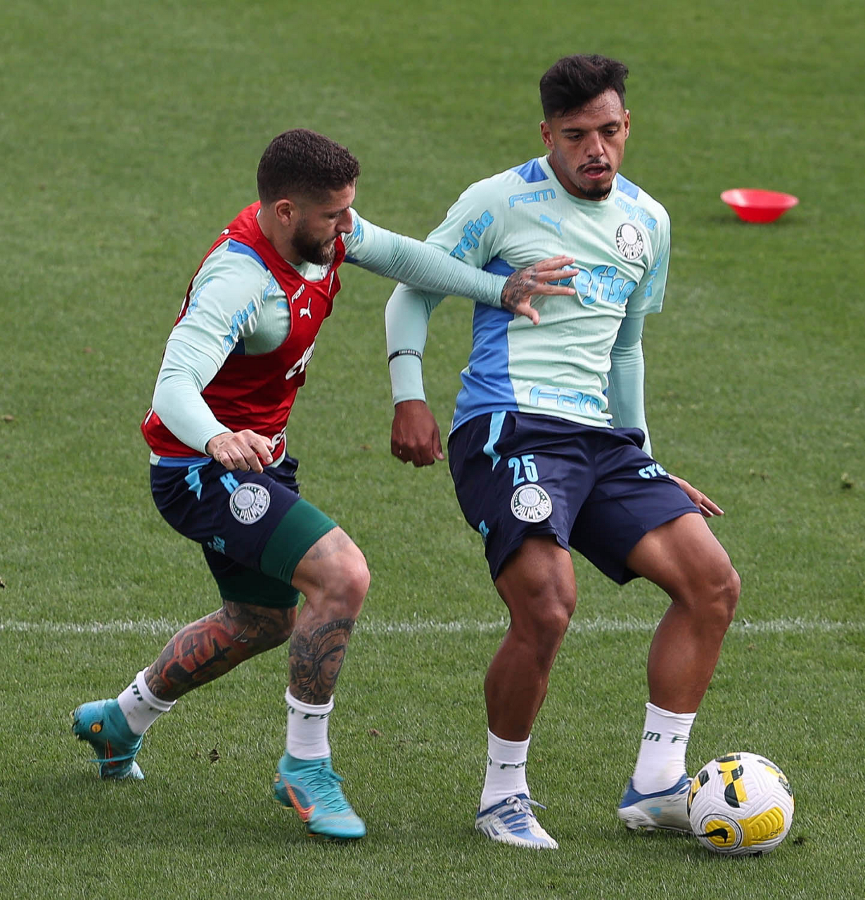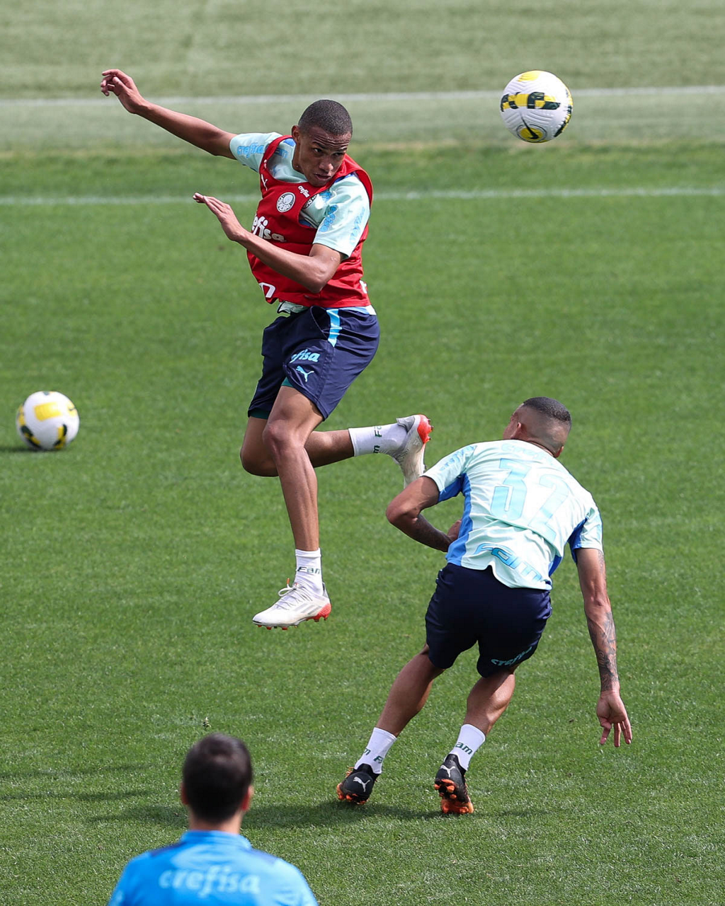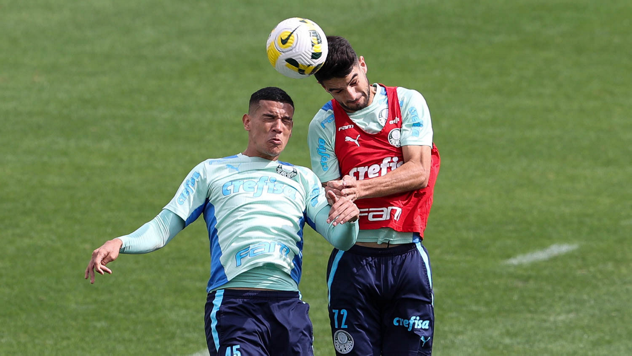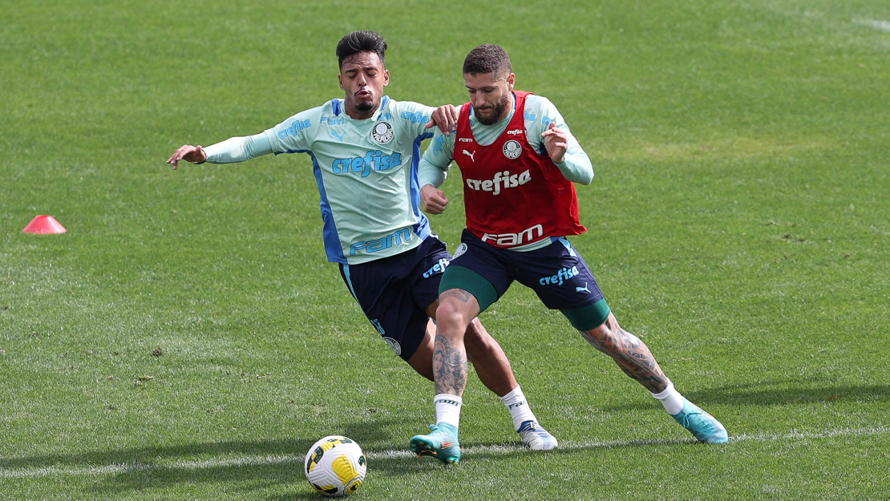Os jogadores Gabriel Menino e Zé Rafael (D), da SE Palmeiras, durante treinamento na Academia de Futebol. (Foto: Cesar Greco)