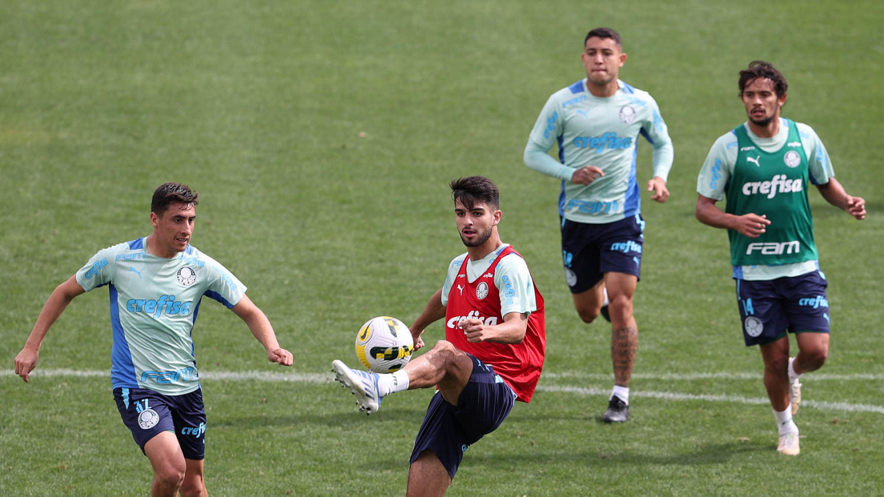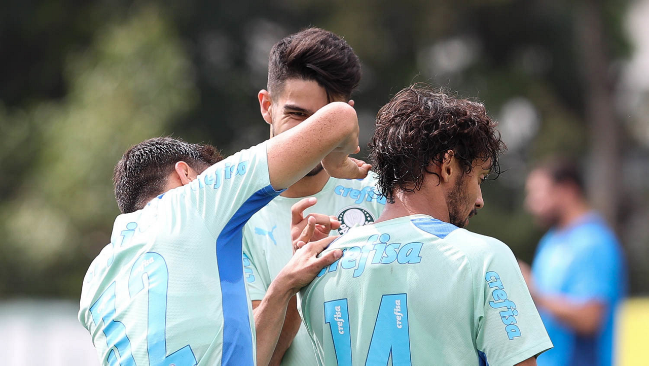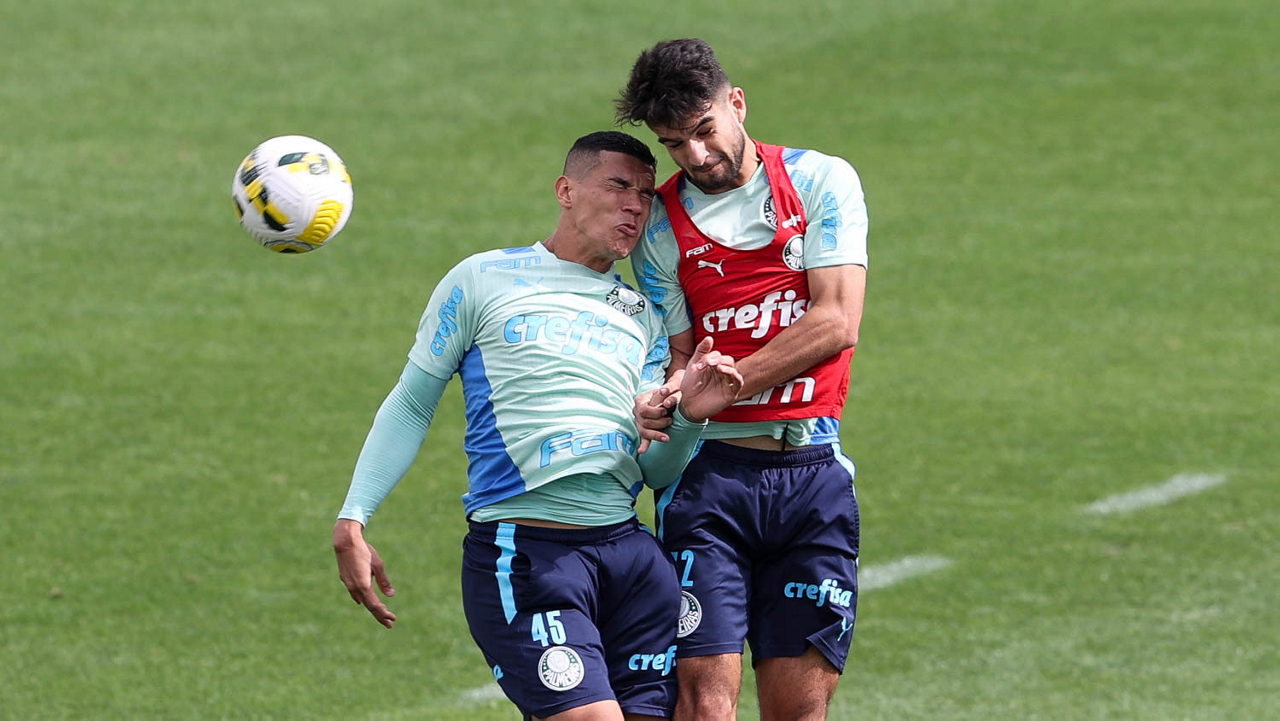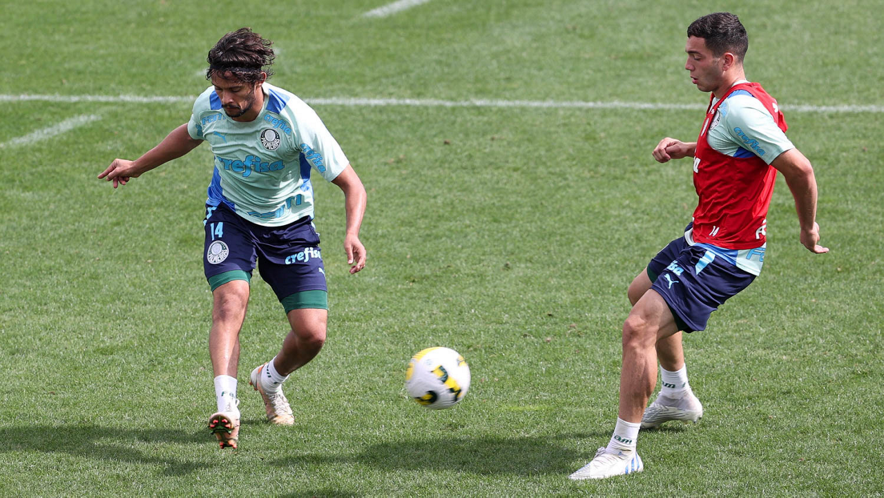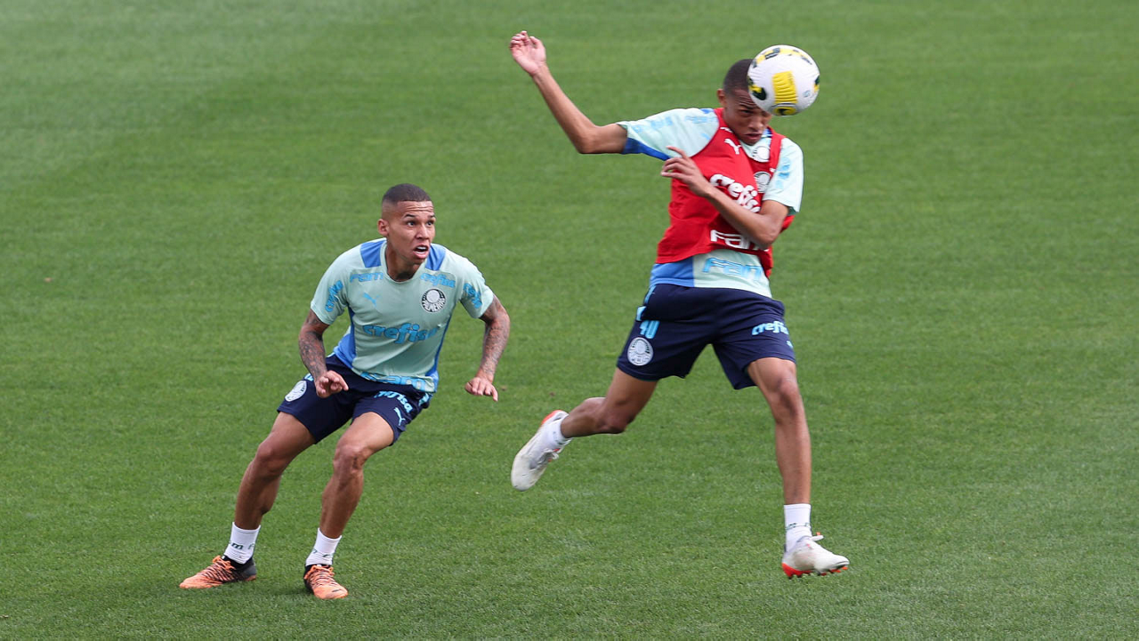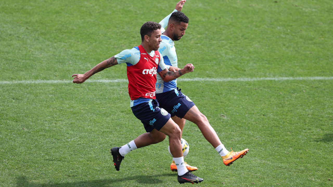 Os jogadores Gabriel Menino e Zé Rafael (D), da SE Palmeiras, durante treinamento na Academia de Futebol. (Foto: Cesar Greco)