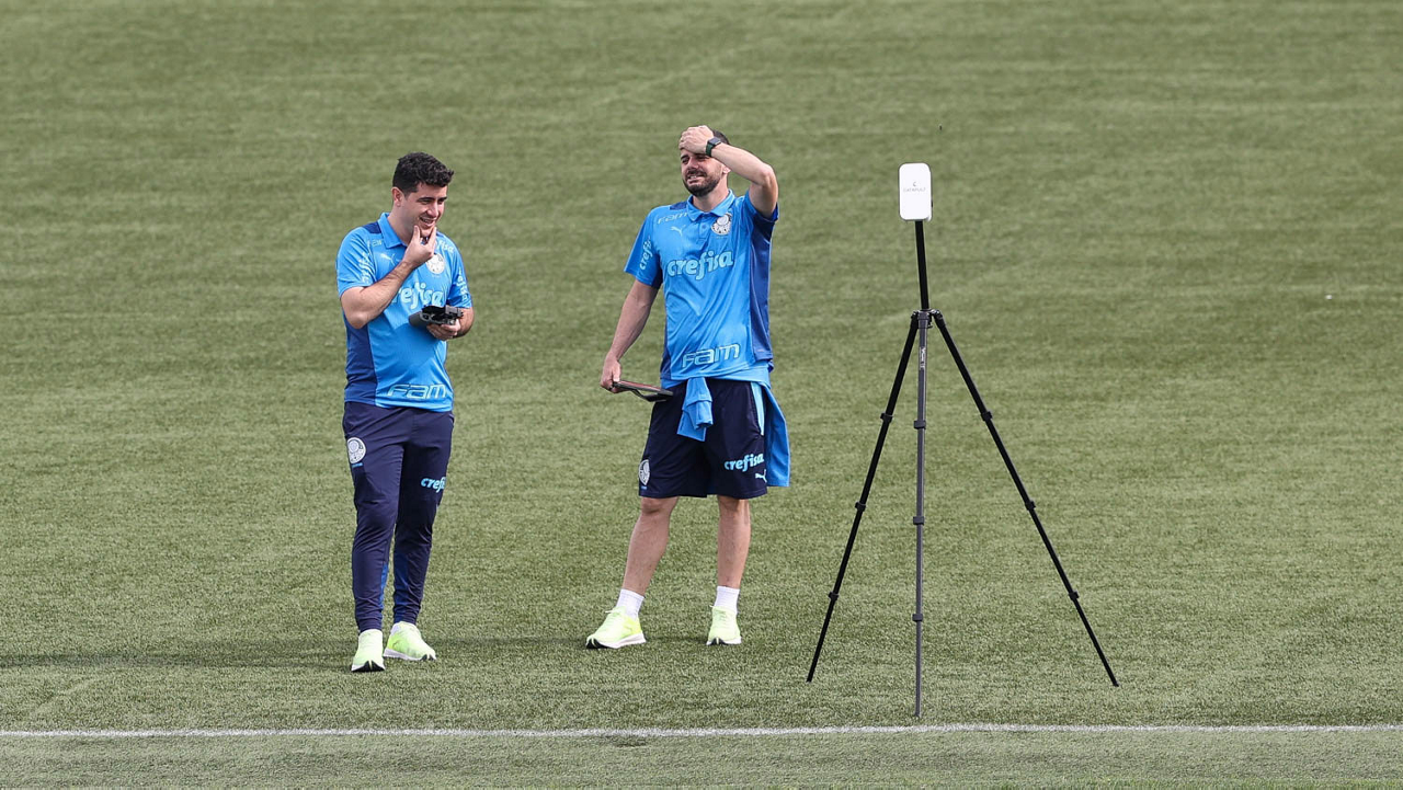 O analista de desempenho Guilherme Camargo e o fisiologista Vinicius Ponzio (D), da SE Palmeiras, durante treinamento na Academia de Futebol. (Foto: Cesar Greco)