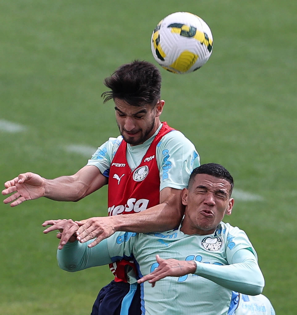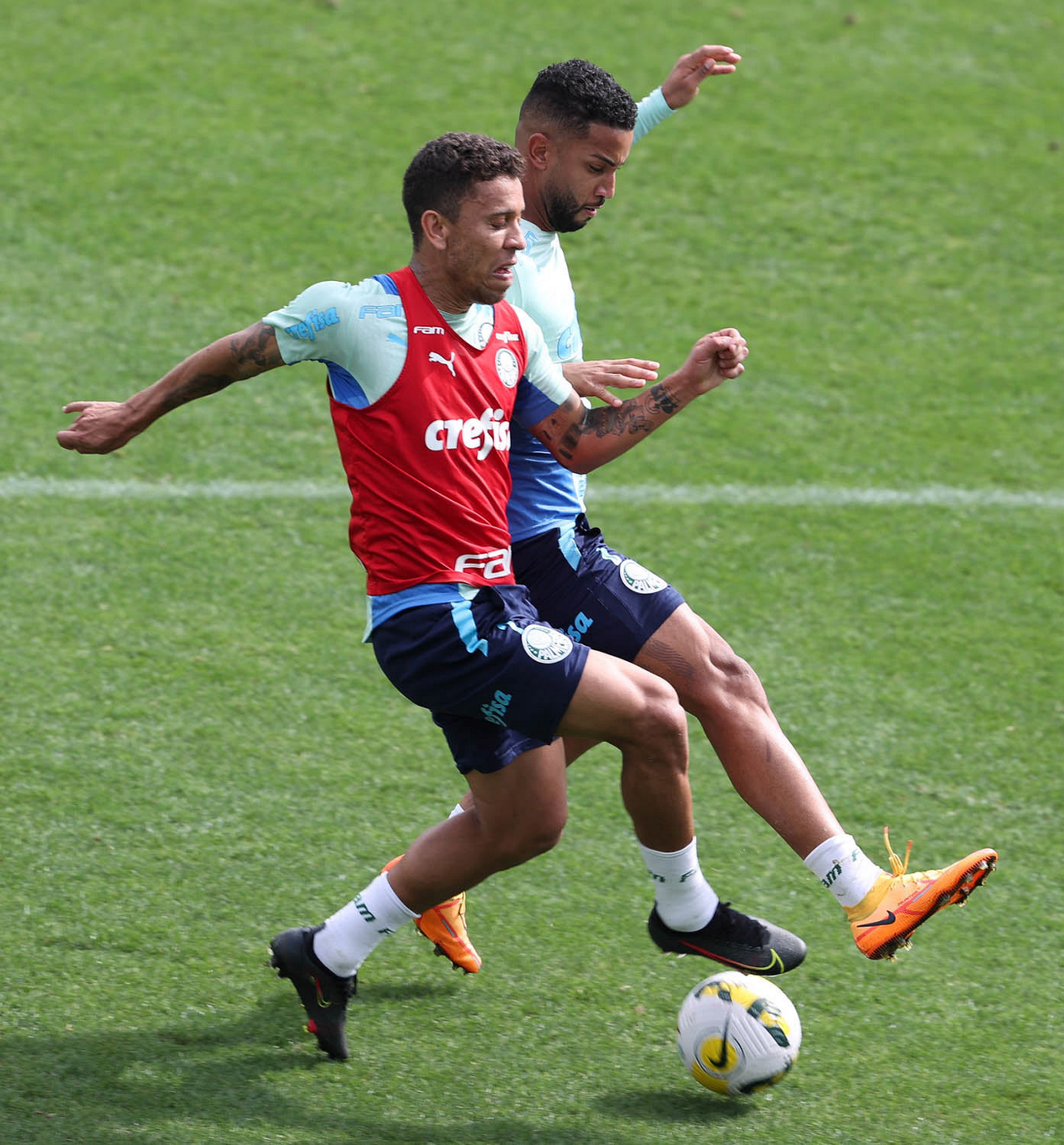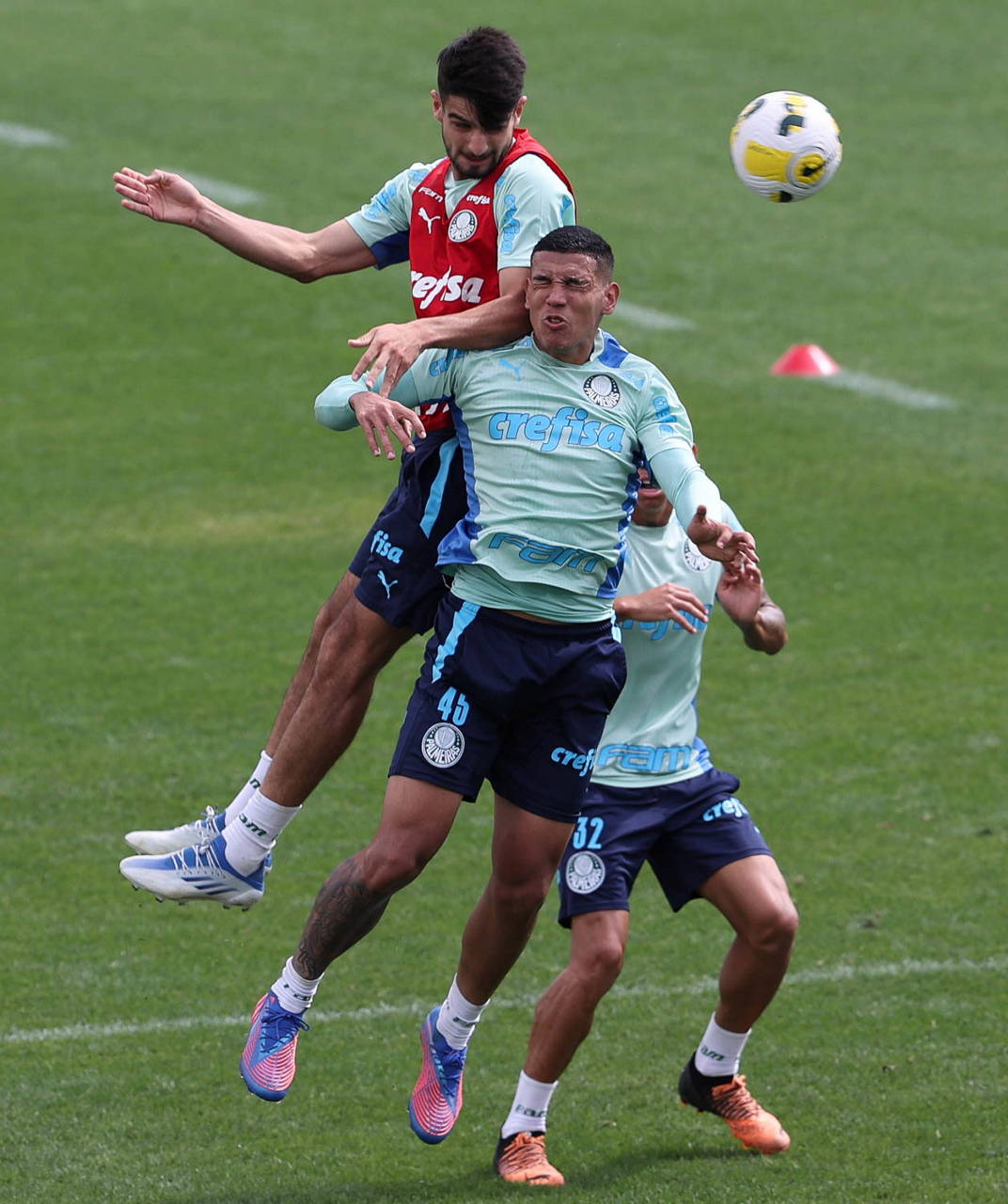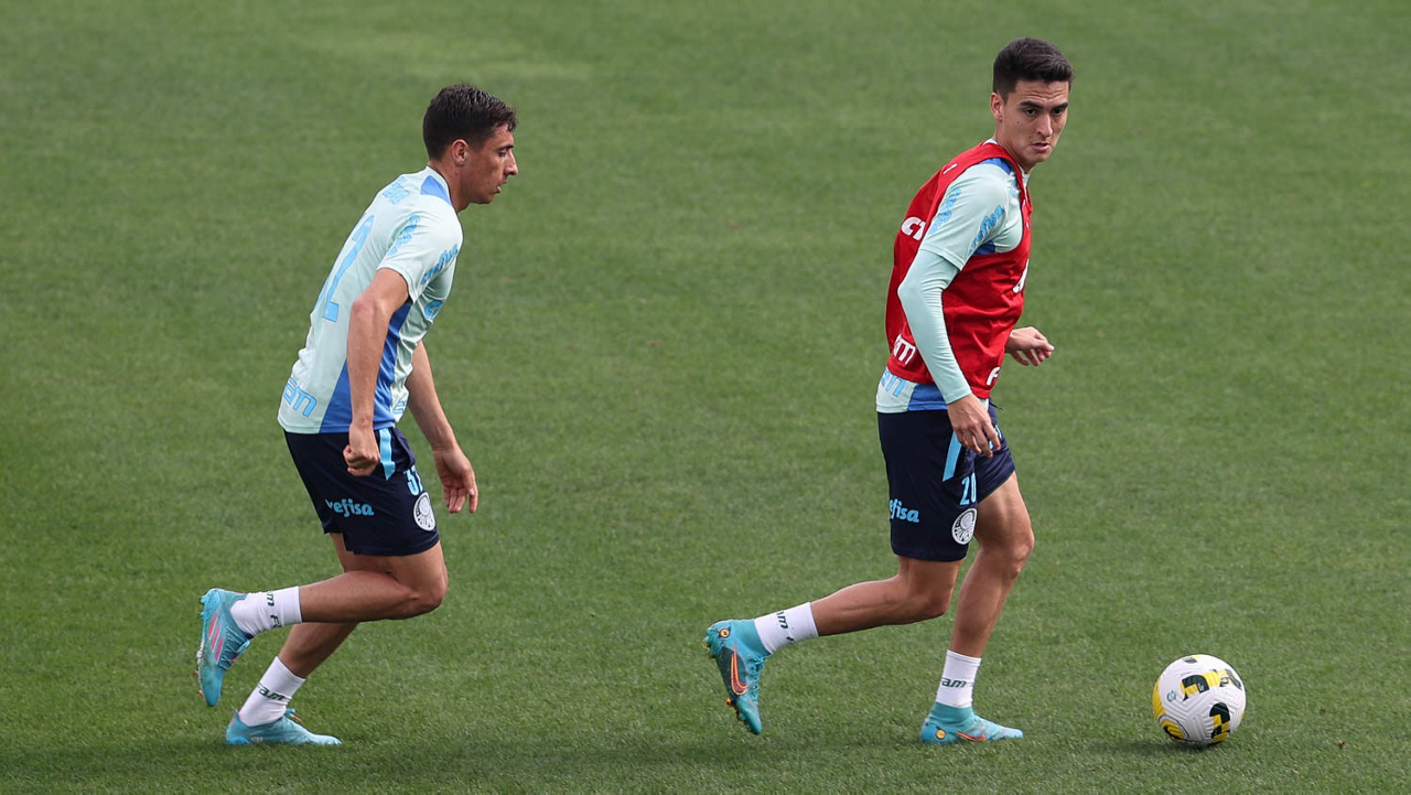 Os jogadores Flaco López e Gabriel Menino (D), da SE Palmeiras, durante treinamento na Academia de Futebol. (Foto: Cesar Greco)
