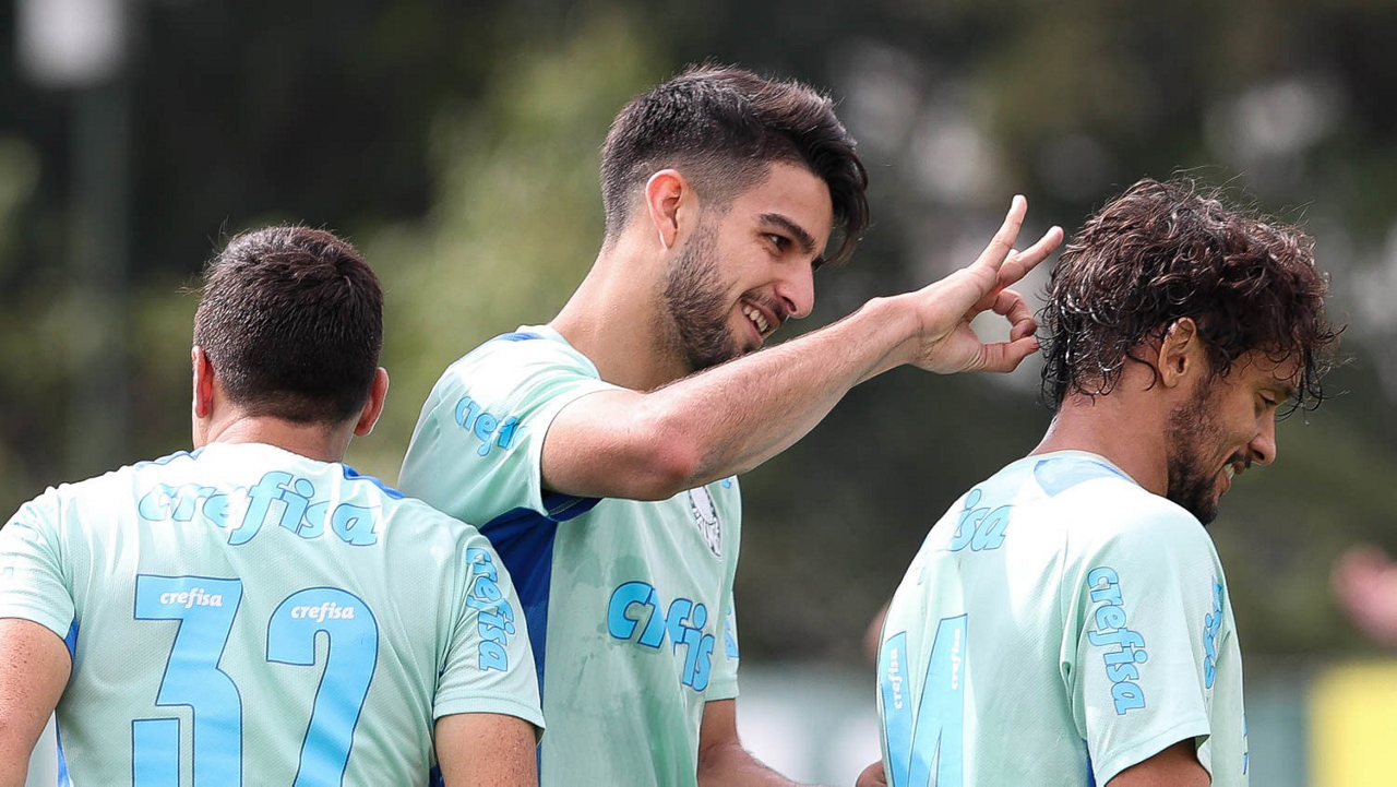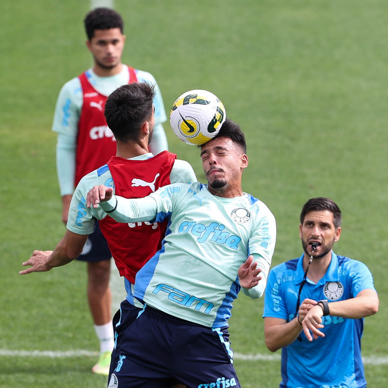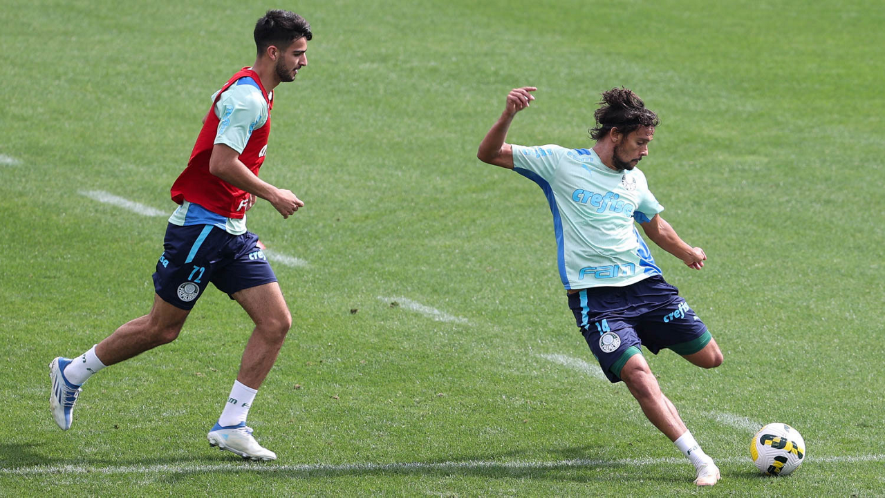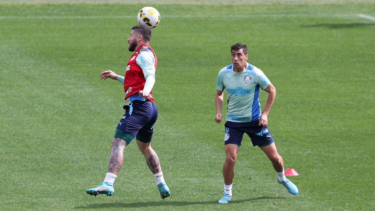 Os jogadores Flaco López e Gabriel Menino (D), da SE Palmeiras, durante treinamento na Academia de Futebol. (Foto: Cesar Greco)