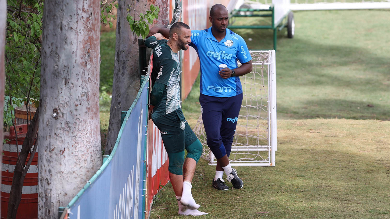 Os jogadores Zé Rafael e Miguel Merentiel (D), da SE Palmeiras, durante treinamento na Academia de Futebol. (Foto: Cesar Greco)