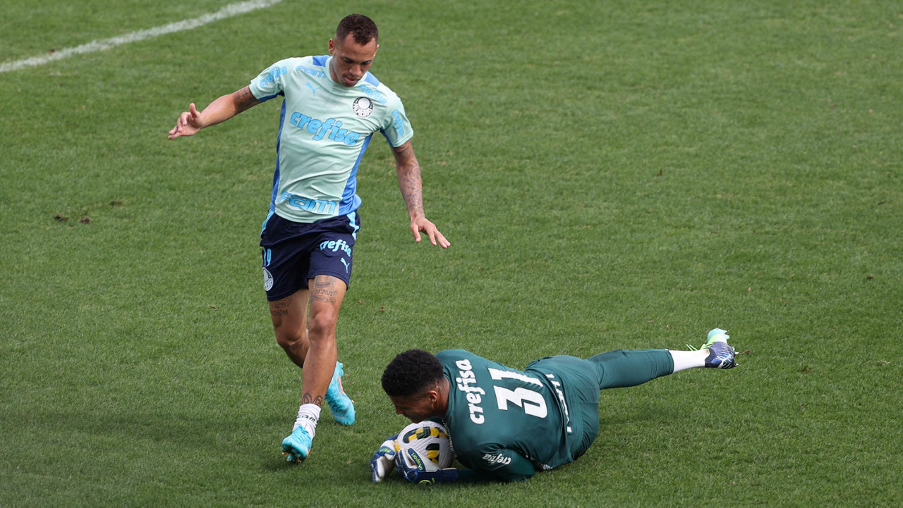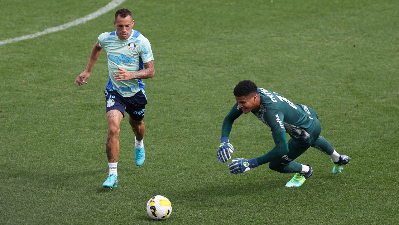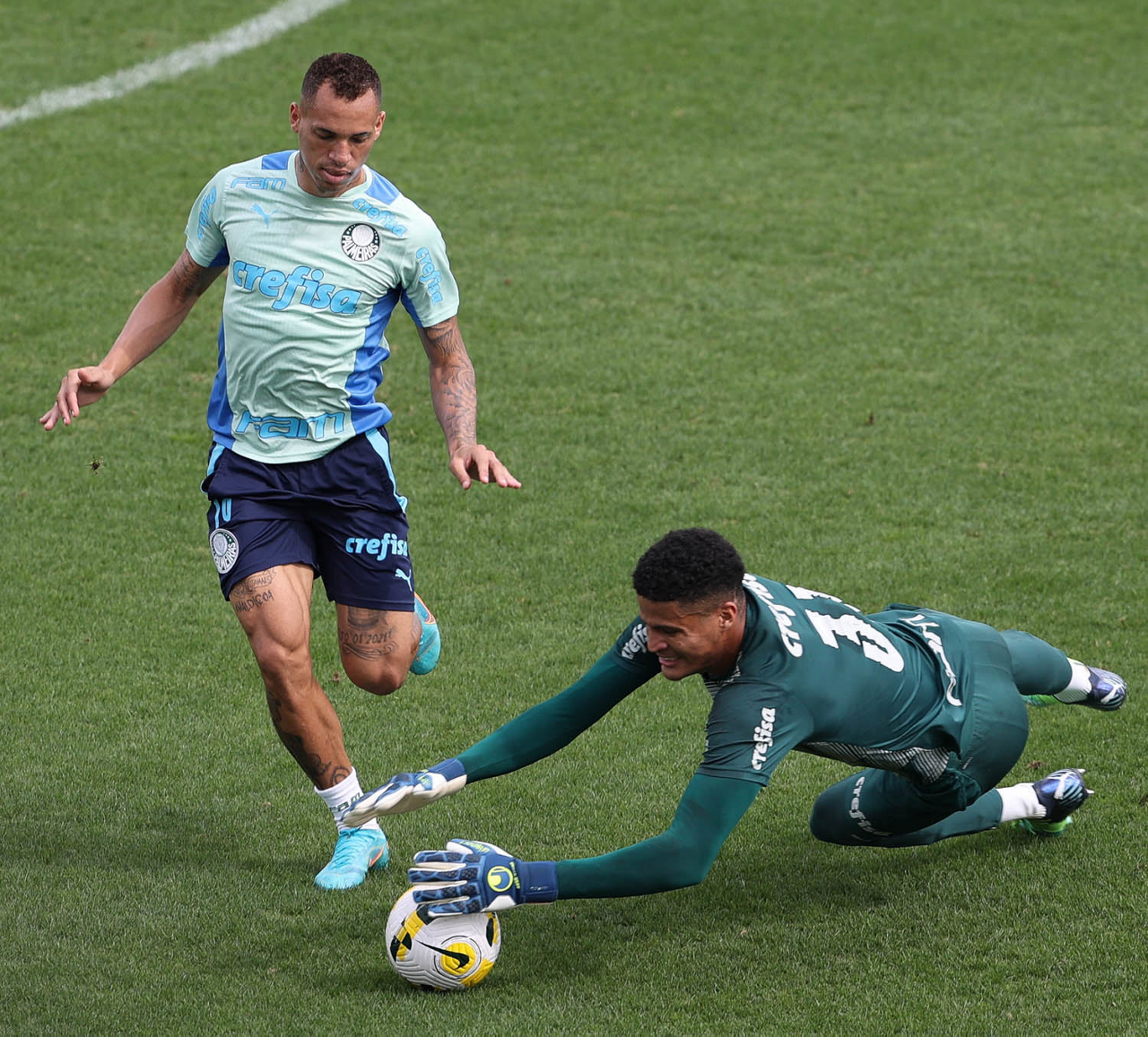 O jogador Breno Lopes e o goleiro Mateus (D), da SE Palmeiras, durante treinamento na Academia de Futebol. (Foto: Cesar Greco)