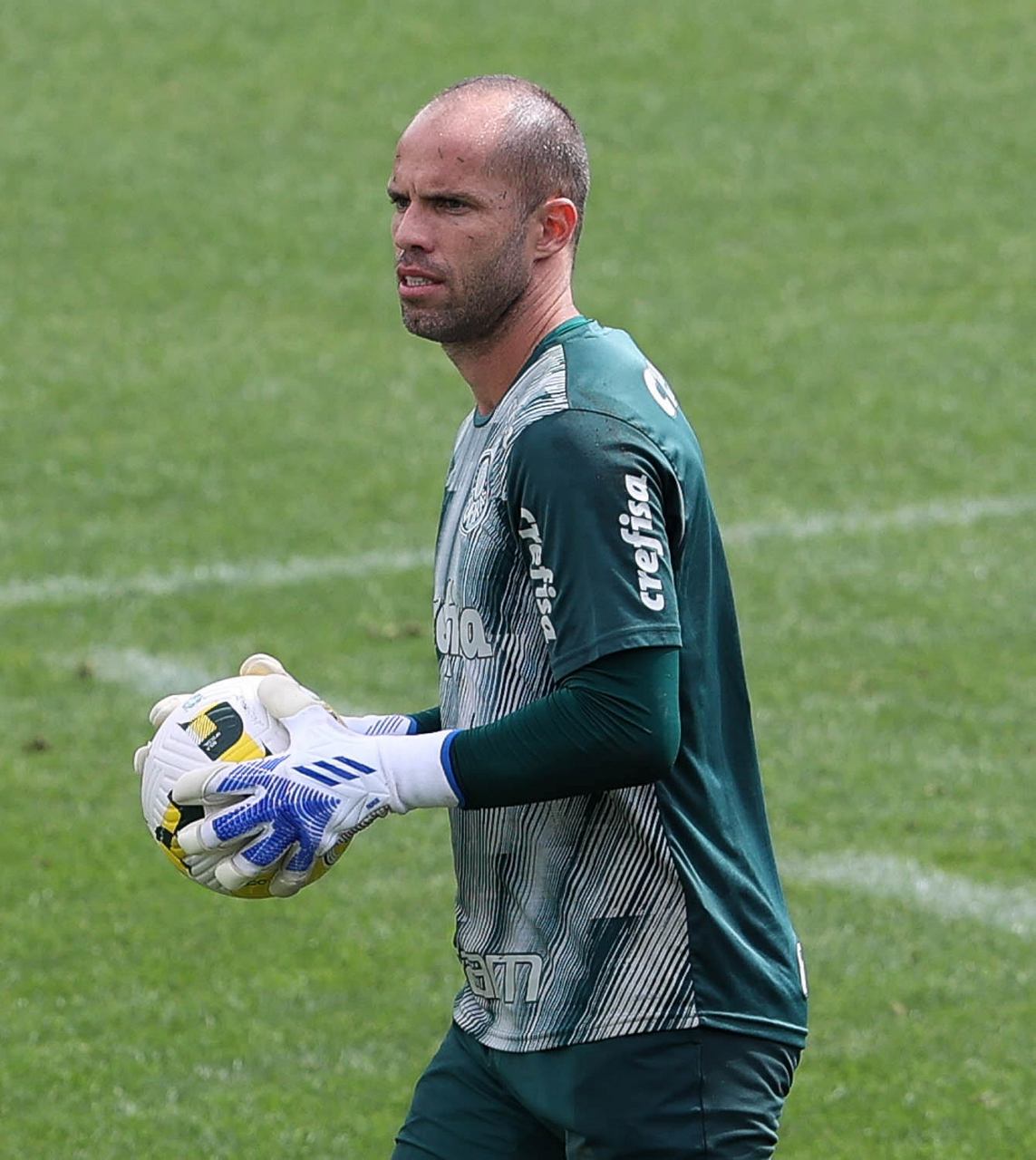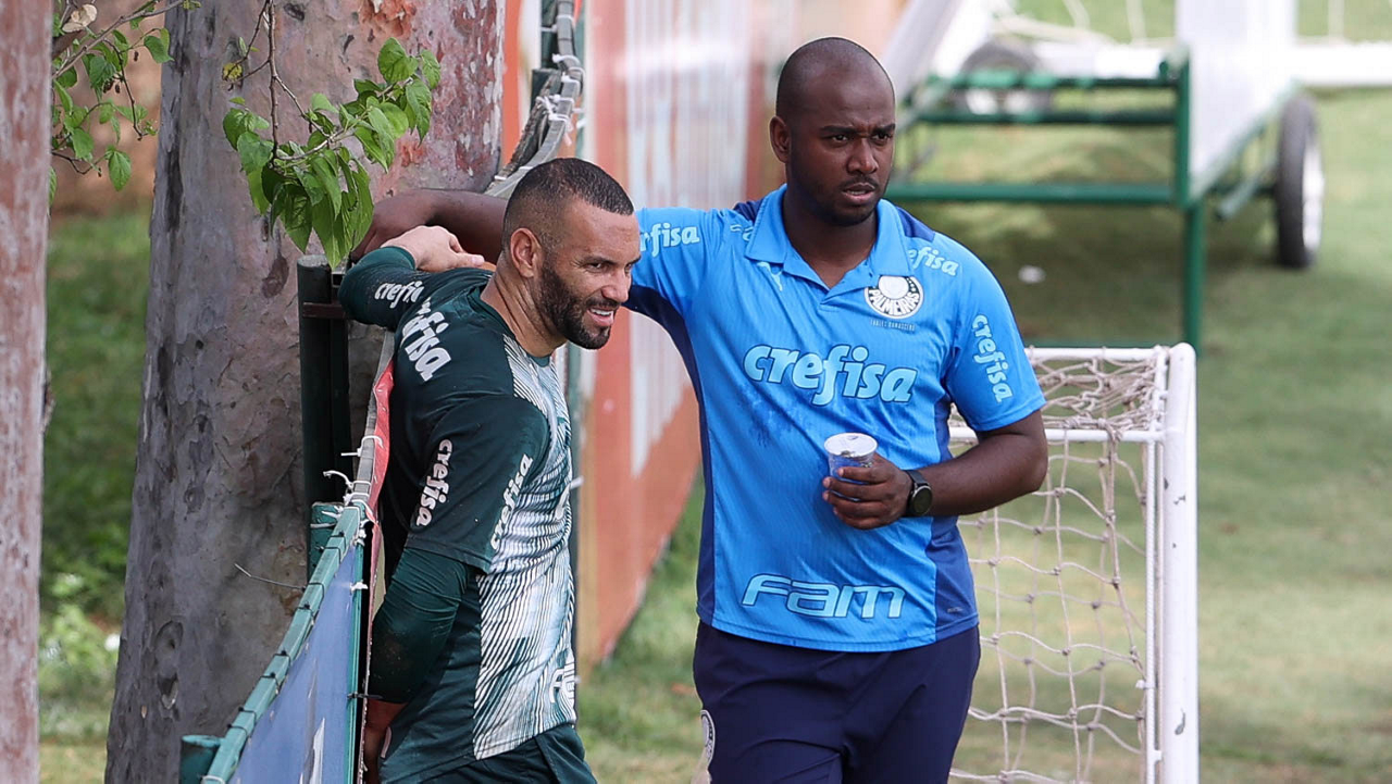 O goleiro Weverton e o preparador de goleiro Thales Damasceno (D), da SE Palmeiras, durante treinamento na Academia de Futebol. (Foto: Cesar Greco)