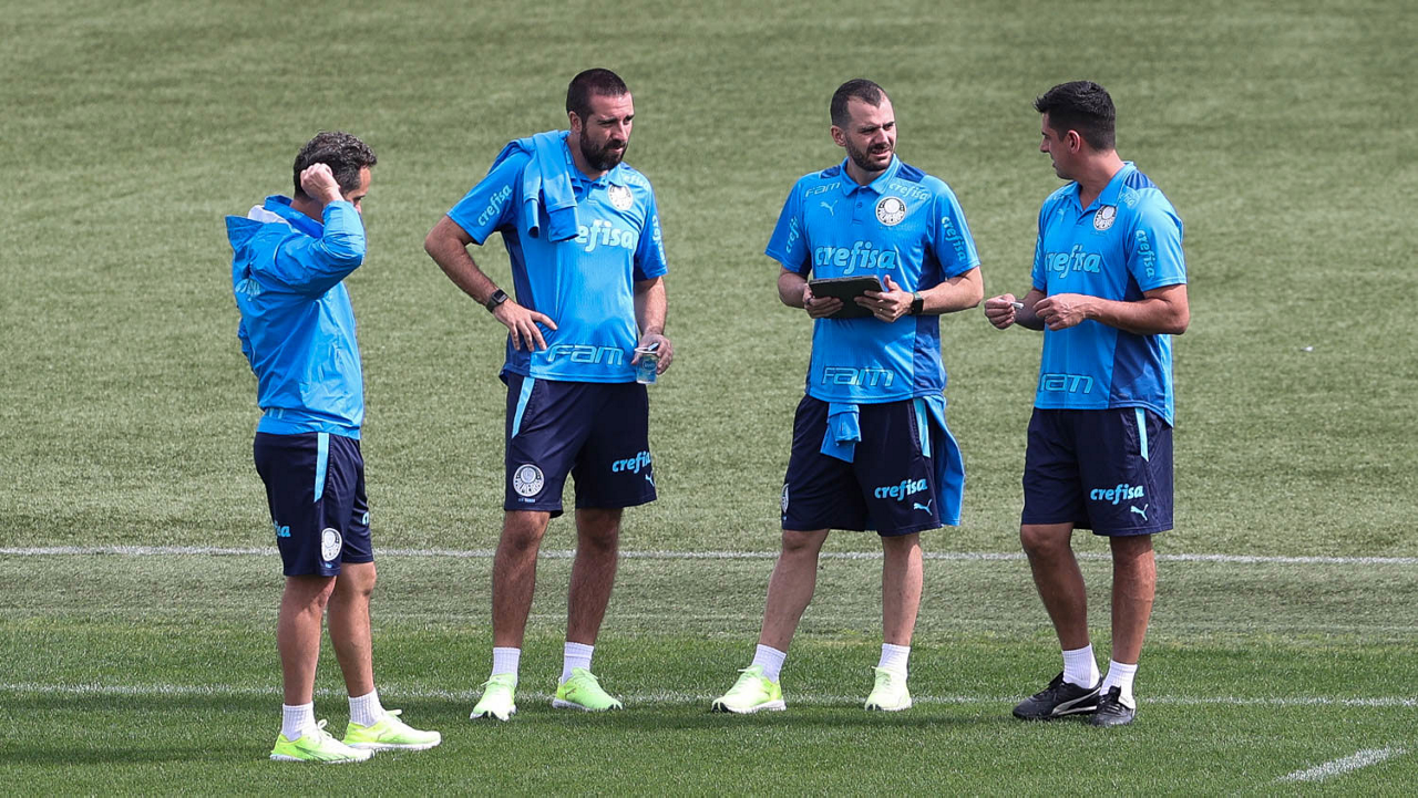 Os médicos Gustavo Maglioca e Gilberto Cunha, o técnico Abel Ferreira e o coordenador científico Daniel Gonçalves (E/D), da SE Palmeiras, durante treinamento na Academia de Futebol. (Foto: Cesar Greco)