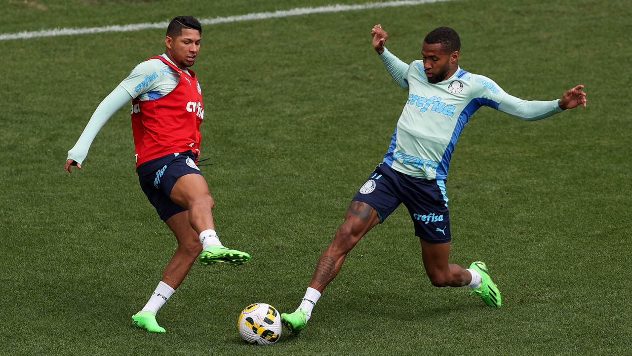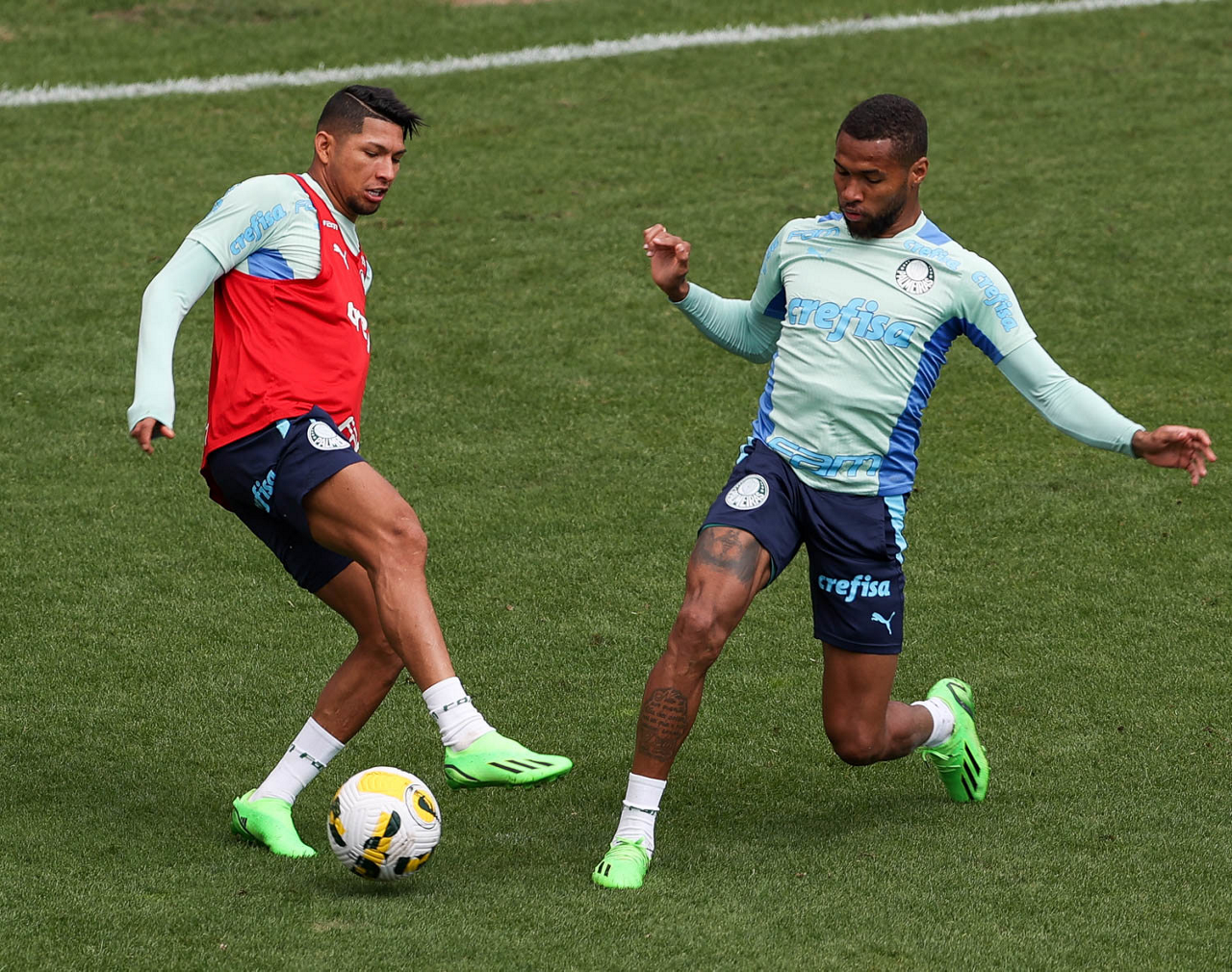Os jogadores Lucas Freitas, Luan, Eduard Atuesta, Gustavo Gómez, Fabinho, Bruno Tabata, Wesley e o goleiro Vinicius (E/D em pé) e Dudu, Danilo, Mayke, Vanderlan e Gabriel Menino (E/D agachados), da SE Palmeiras, durante treinamento, na Academia de Futebol. (Foto: Cesar Greco)
