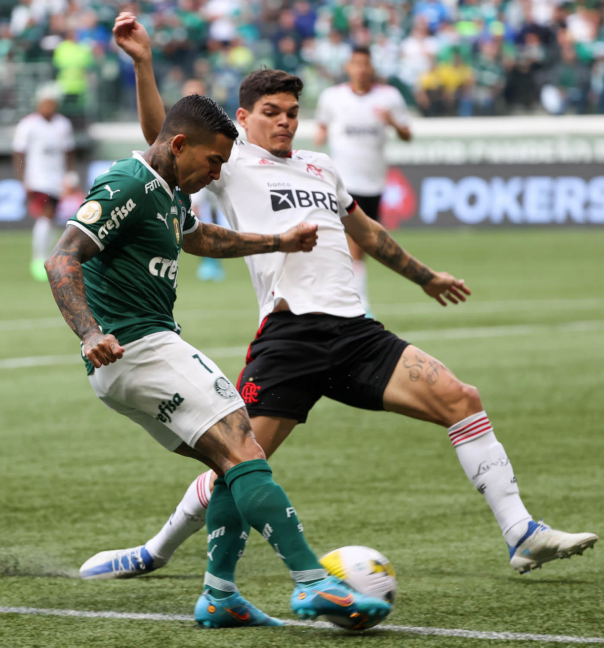 O jogador Dudu, da SE Palmeiras, disputa bola com o jogador, do CR Flamengo, durante partida válida pela vigésima terceira rodada, do Campeonato Brasileiro, Série A, na arena Allianz Parque. (Foto: Cesar Greco)