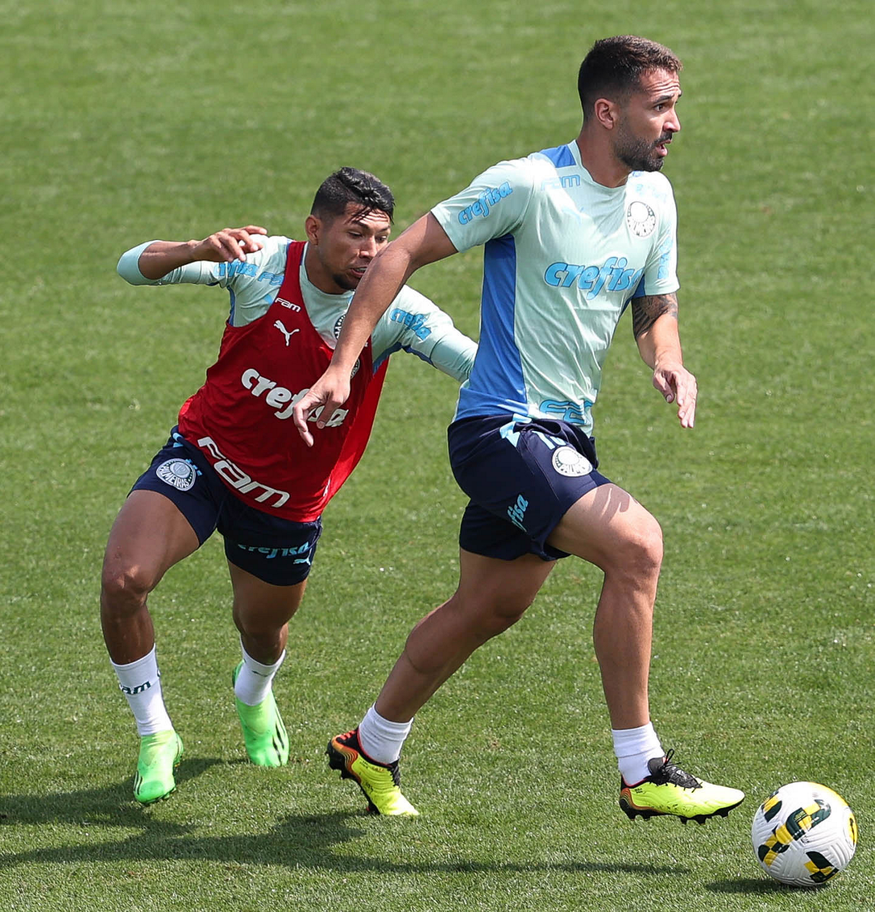 Os jogadores Breno Lopes e Zé Rafael (D), da SE Palmeiras, durante treinamento, na Academia de Futebol. (Foto: Cesar Greco)