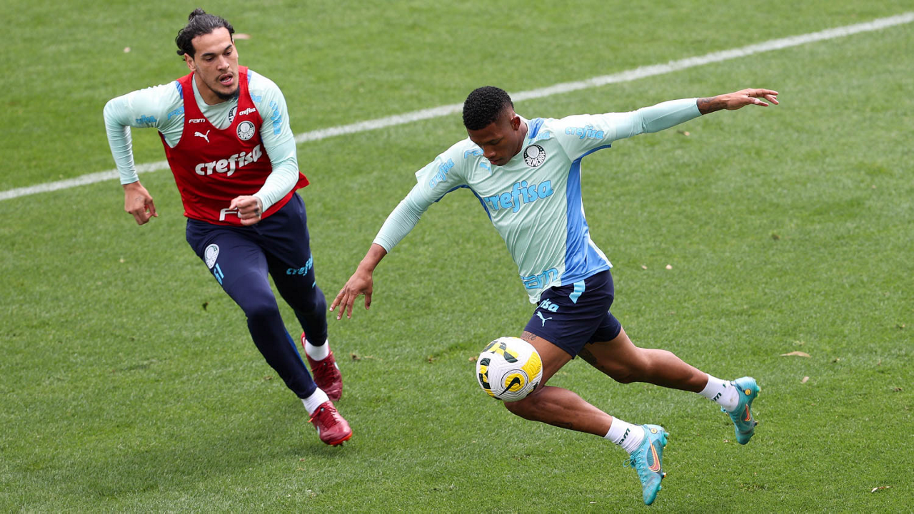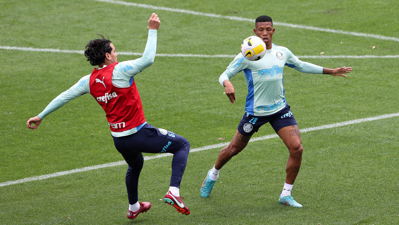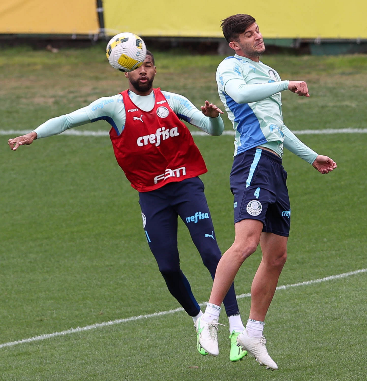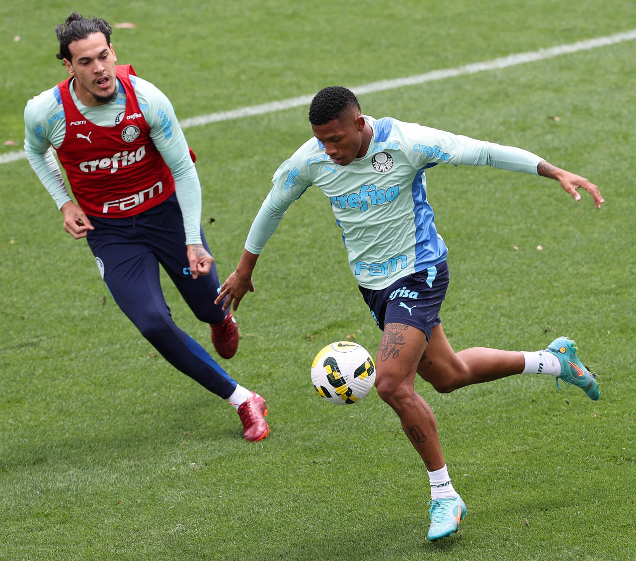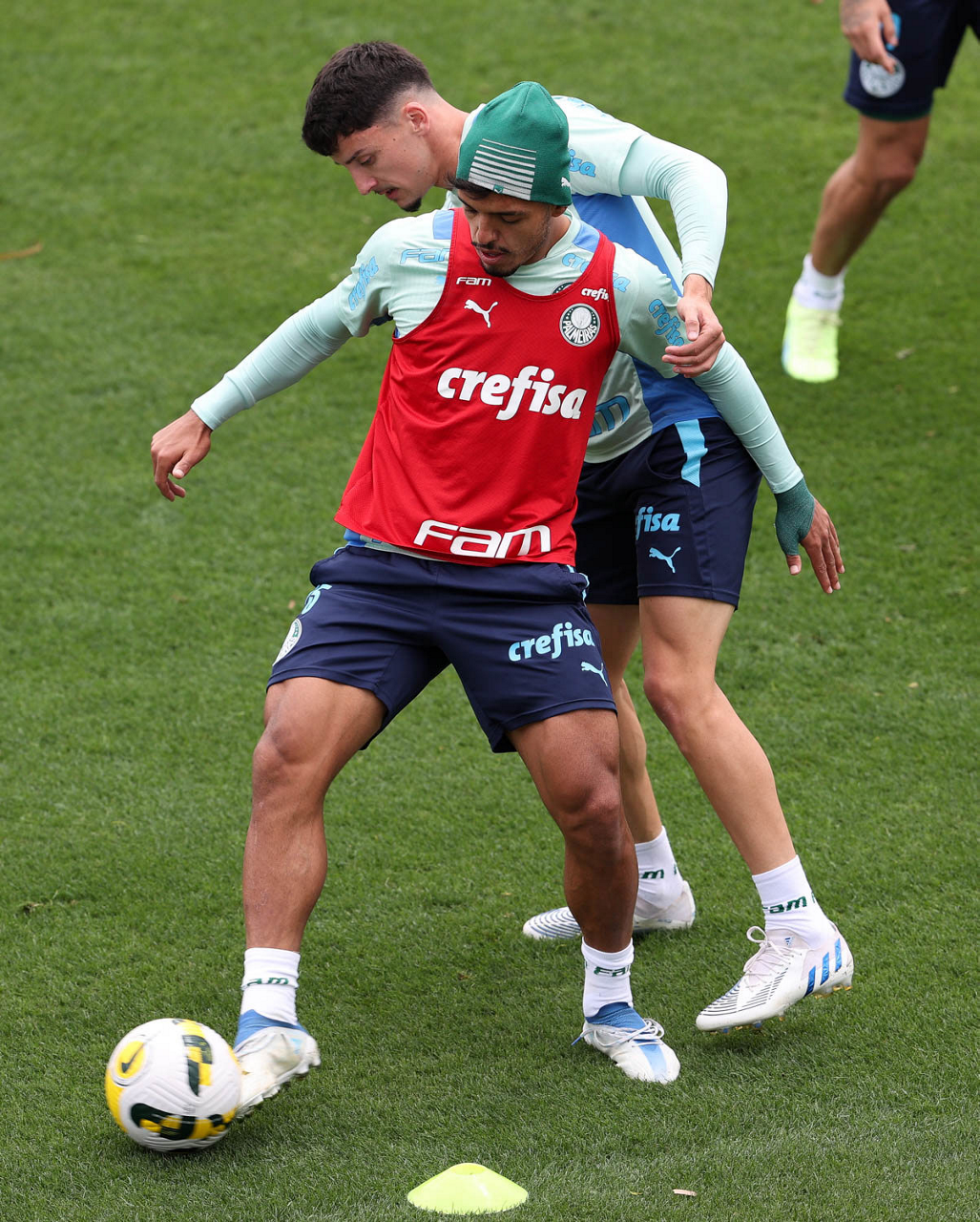 Os jogadores Gabriel Menino e Joaquín Piquerez (D), da SE Palmeiras, durante treinamento, na Academia de Futebol. (Foto: Cesar Greco)