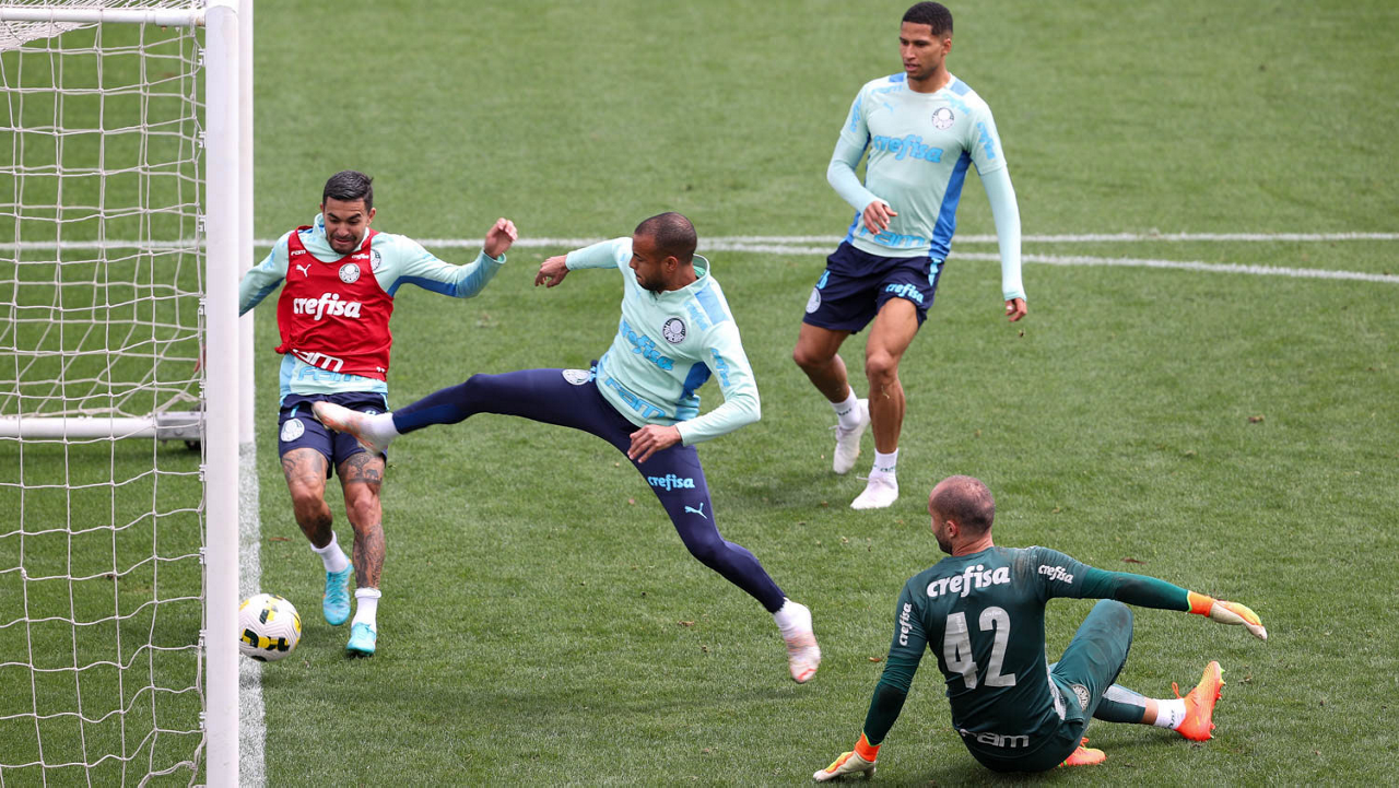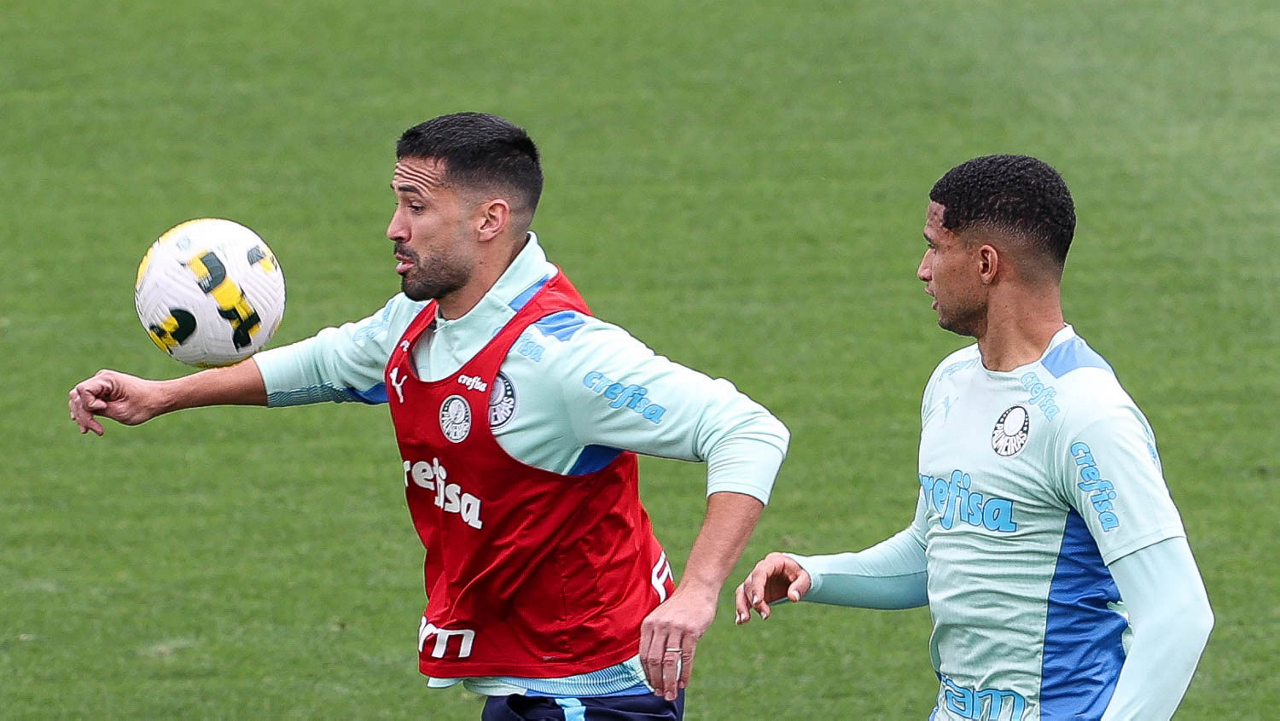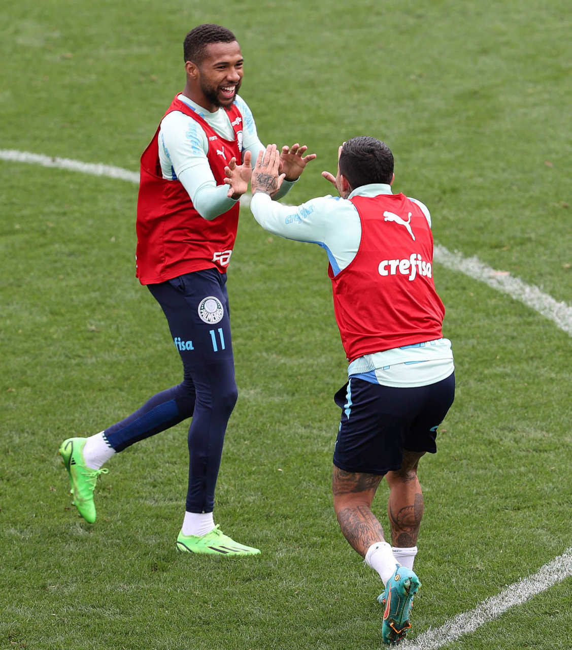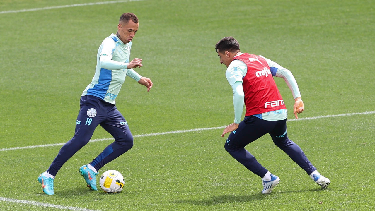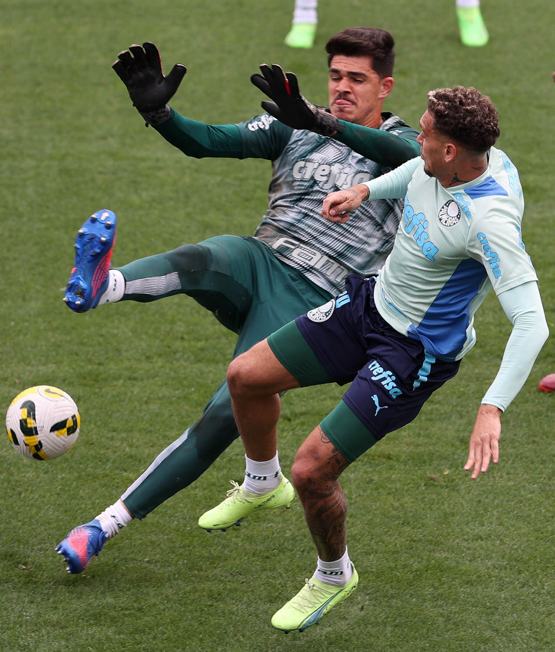 Os jogadores Breno Lopes e Miguel Merentiel (E/D), da SE Palmeiras, durante treinamento, na Academia de Futebol. (Foto: Cesar Greco)