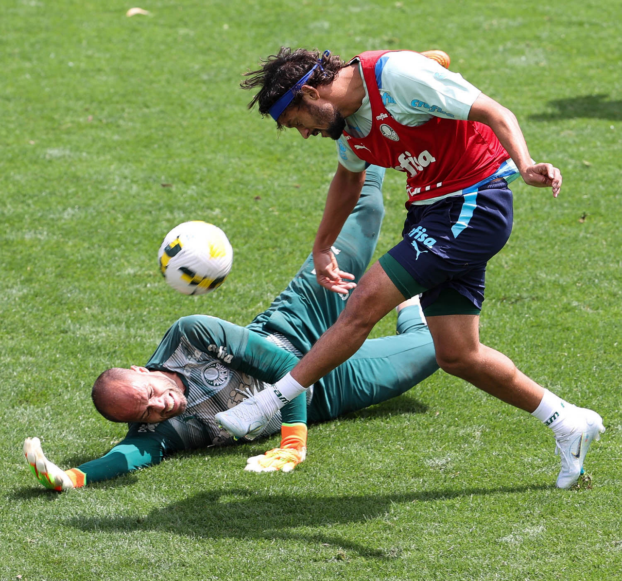 O goleiro Marcelo Lomba e o jogador Gustavo Scarpa (D), da SE Palmeiras, durante treinamento, na Academia de Futebol. (Foto: Cesar Greco)
