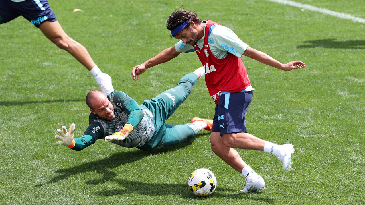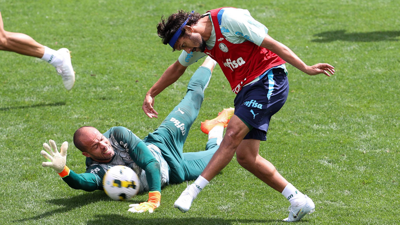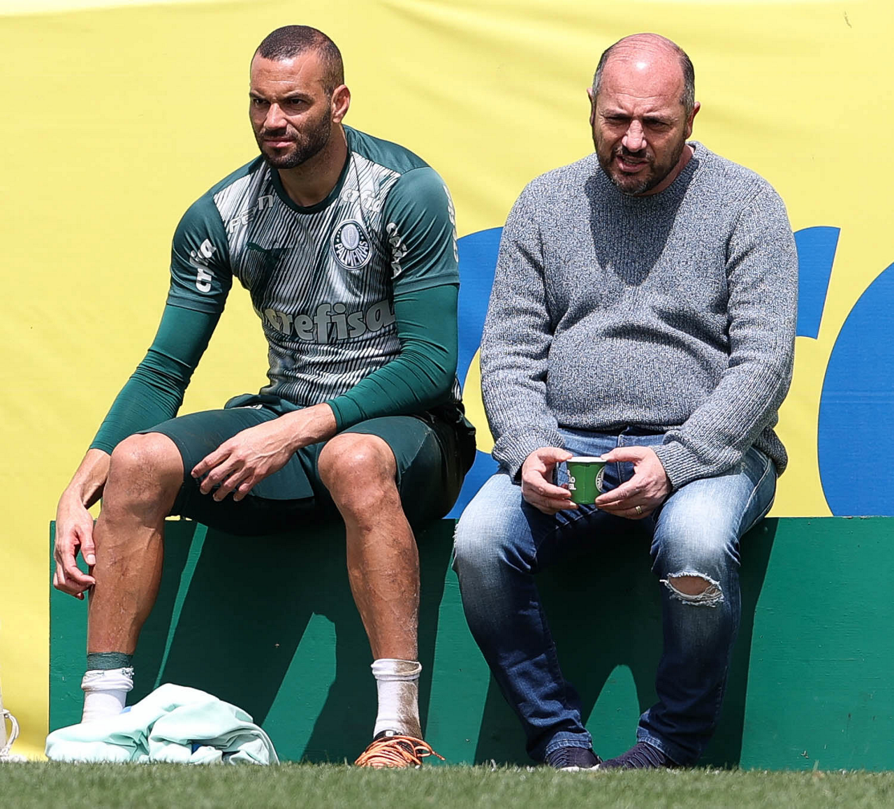 O goleiro Weverton e o gerente de futebol Cicero Souza (D), da SE Palmeiras, durante treinamento, na Academia de Futebol. (Foto: Cesar Greco)