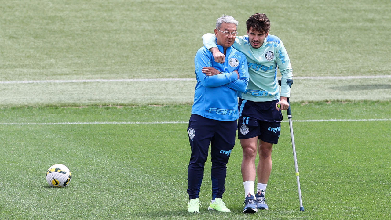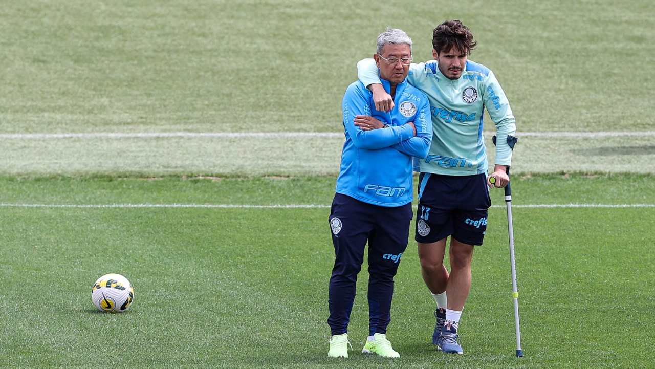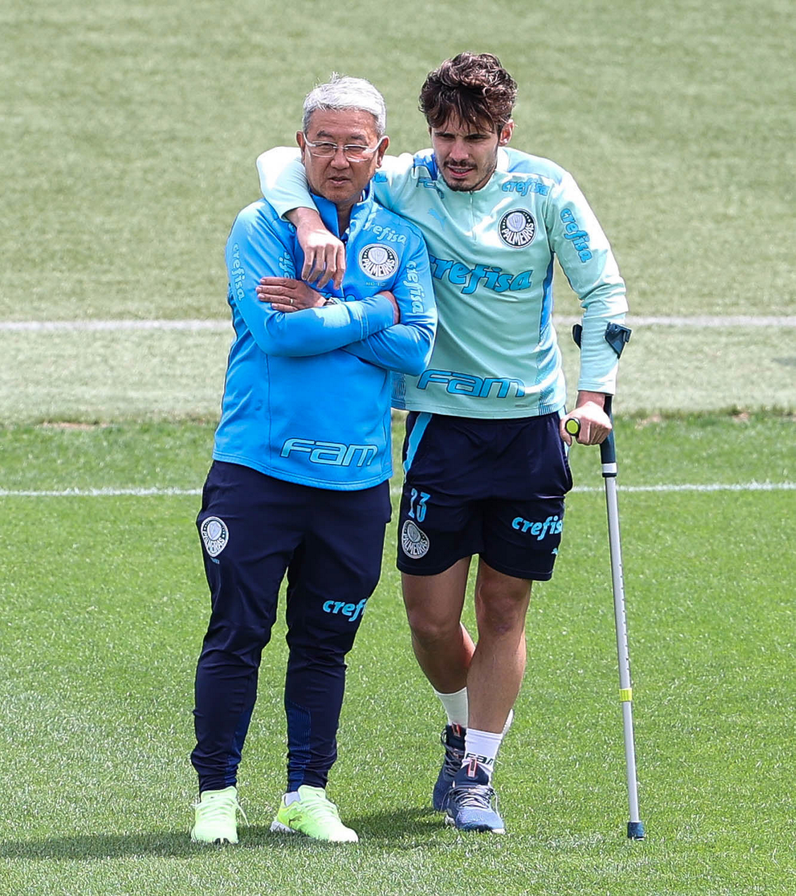 O fisioterapeuta Marcelo Gondo e o jogador Raphael Veiga (D), da SE Palmeiras, durante treinamento, na Academia de Futebol. (Foto: Cesar Greco)