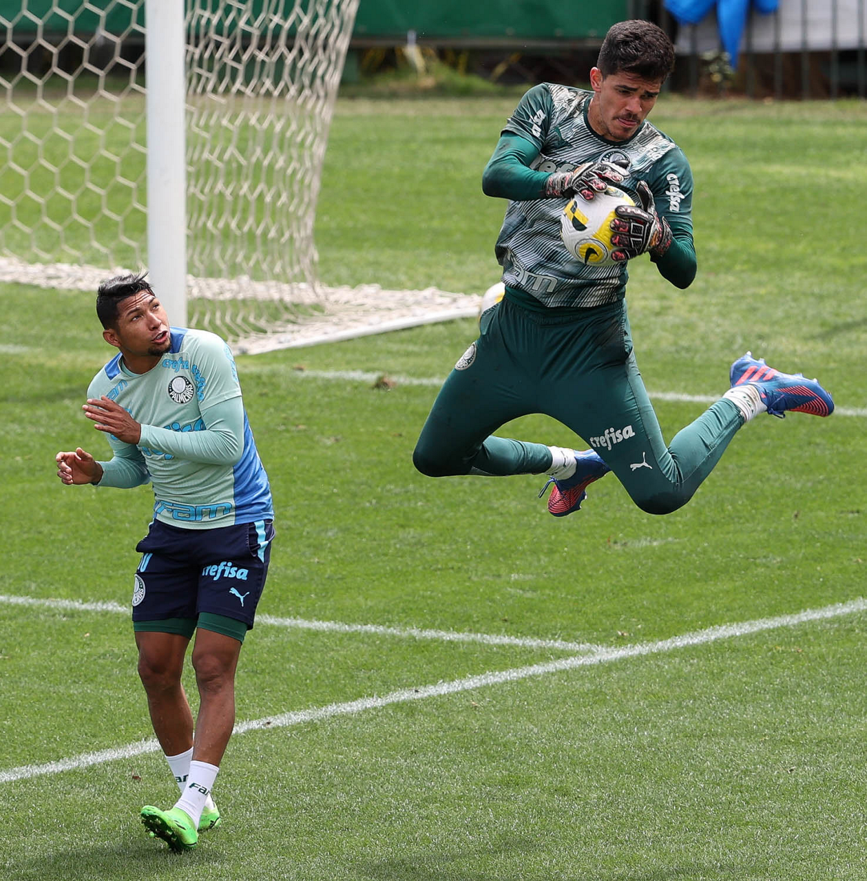 O jogador Rony e o goleiro Vinicius (D), da SE Palmeiras, durante treinamento, na Academia de Futebol. (Foto: Cesar Greco)