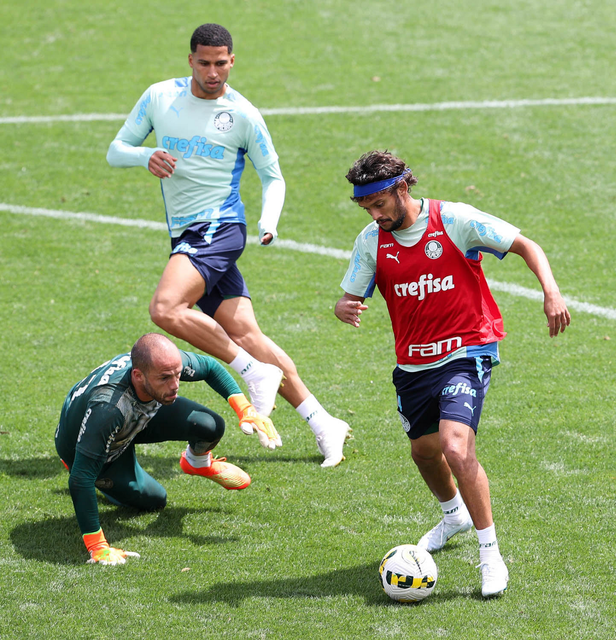 O goleiro Vinicius e os jogadores Rafael Navarro e Vanderlan (E/D), da SE Palmeiras, durante treinamento, na Academia de Futebol. (Foto: Cesar Greco)