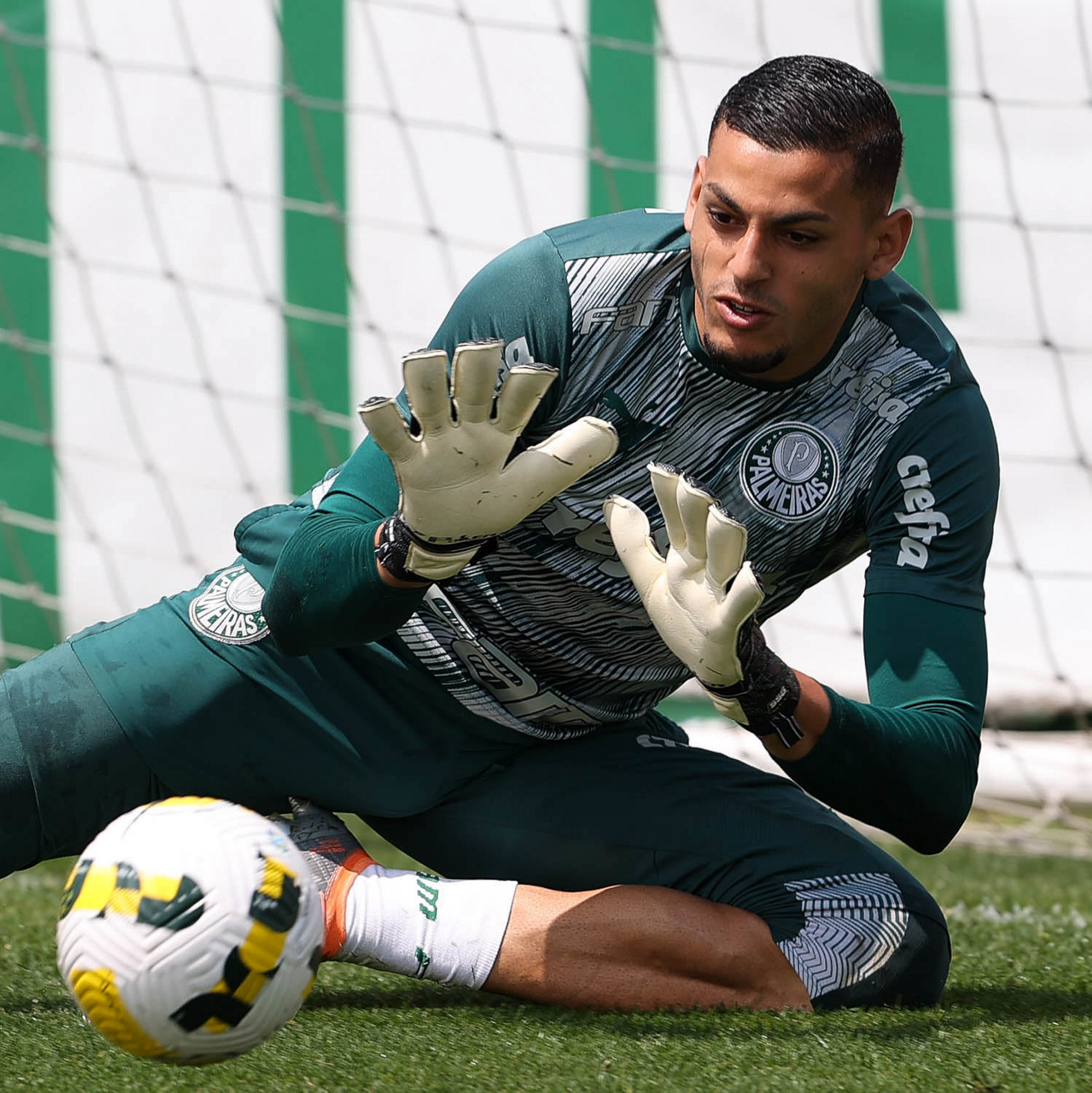 Os jogadores Dudu, Luan, Zé Rafael, Garcia, Gabriel Menino, Miguel Merentiel e Jorge (E/D em pé) e Murilo, Eduard Atuesta, Joaquín Piquerez, Vanderlan, Endrick e Vinicius (E/D agachados), da SE Palmeiras, durante treinamento, na Academia de Futebol. (Foto: Cesar Greco)