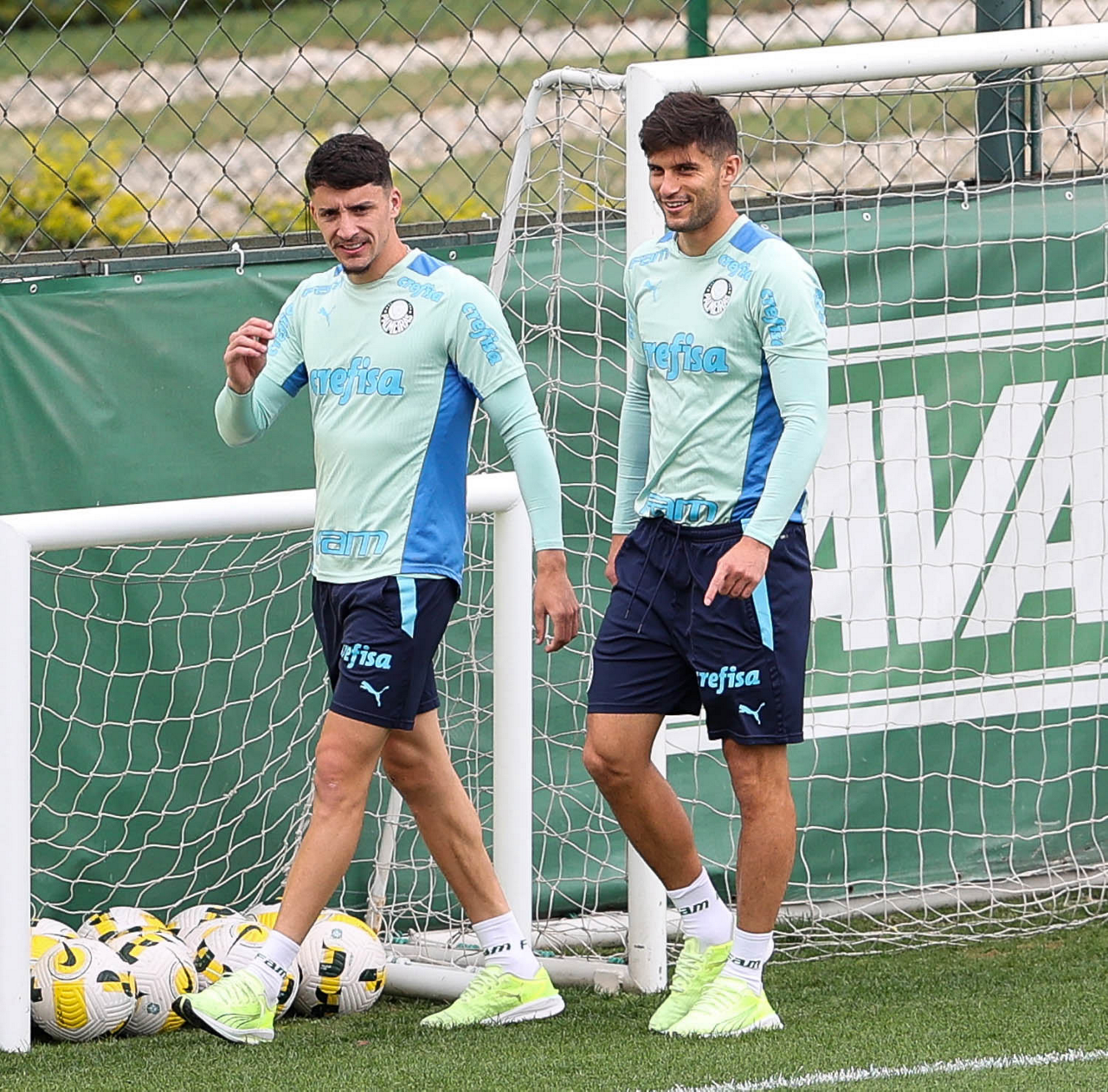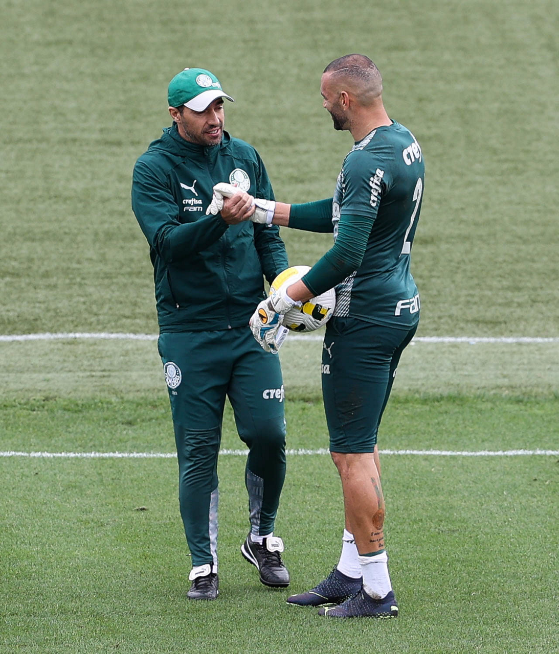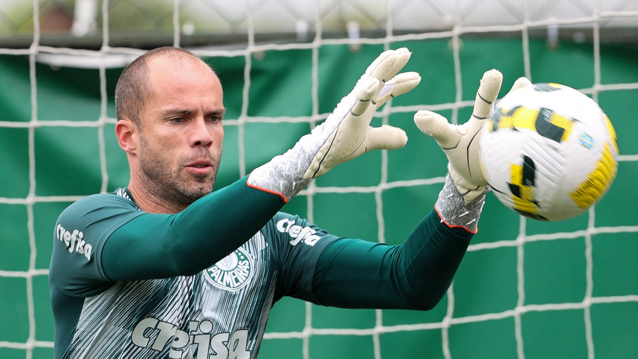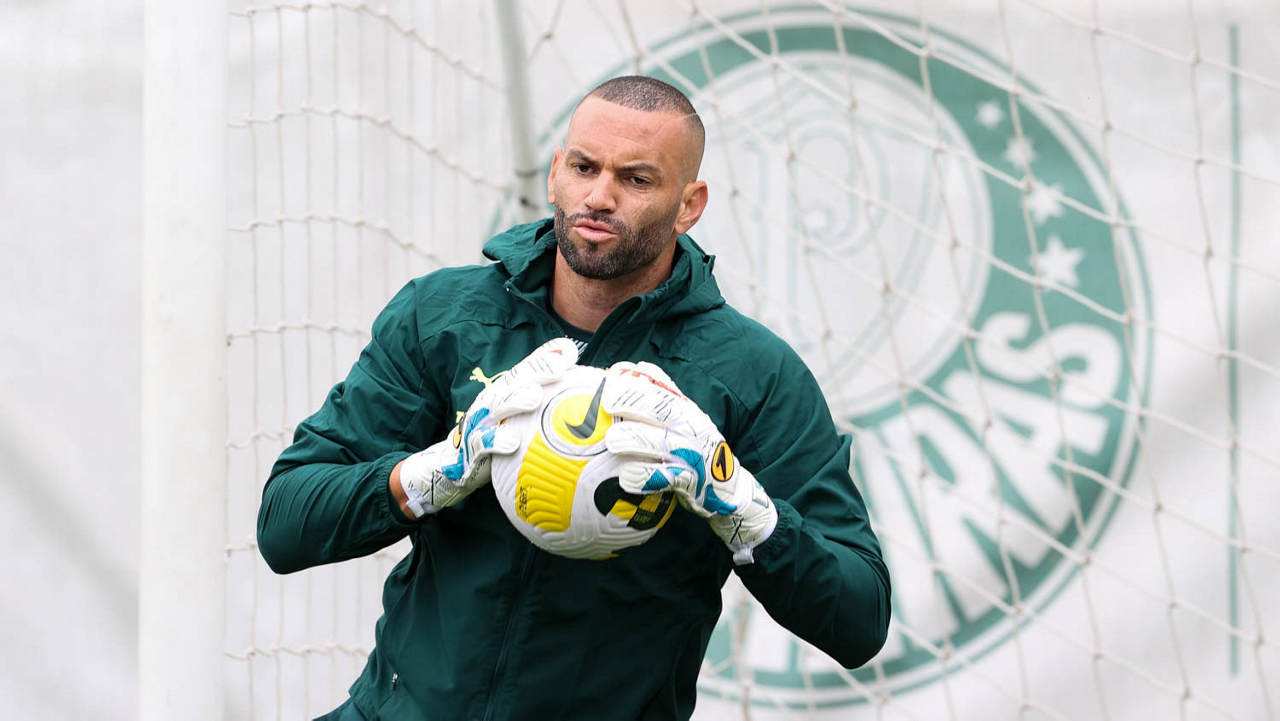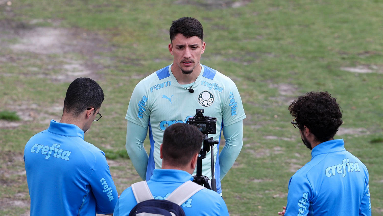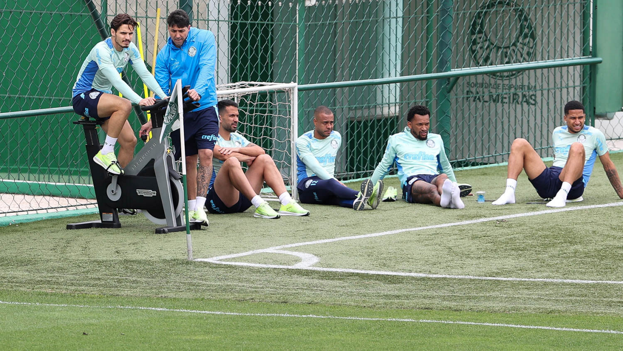 O preparador de goleiro Thales Damasceno, os goleiros Marcelo Lomba, Luis, Vinicius e Nathan (E/D em pé) e o preparador de goleiro Rogerio Godoy e o goleiro Weverton (D agachado), da SE Palmeiras, durante treinamento, na Academia de Futebol. (Foto: Cesar Greco)