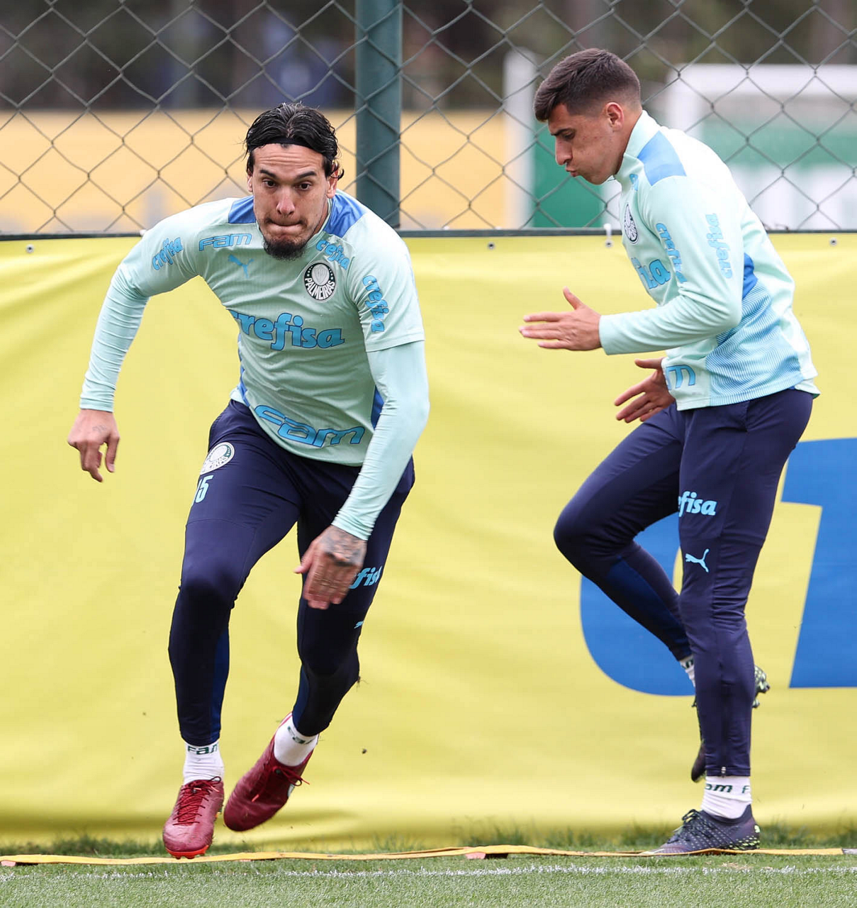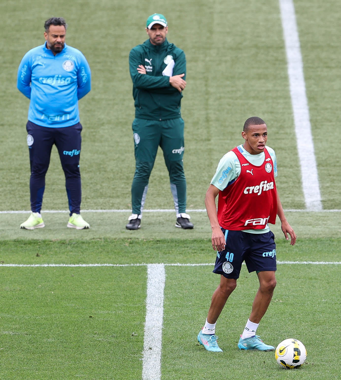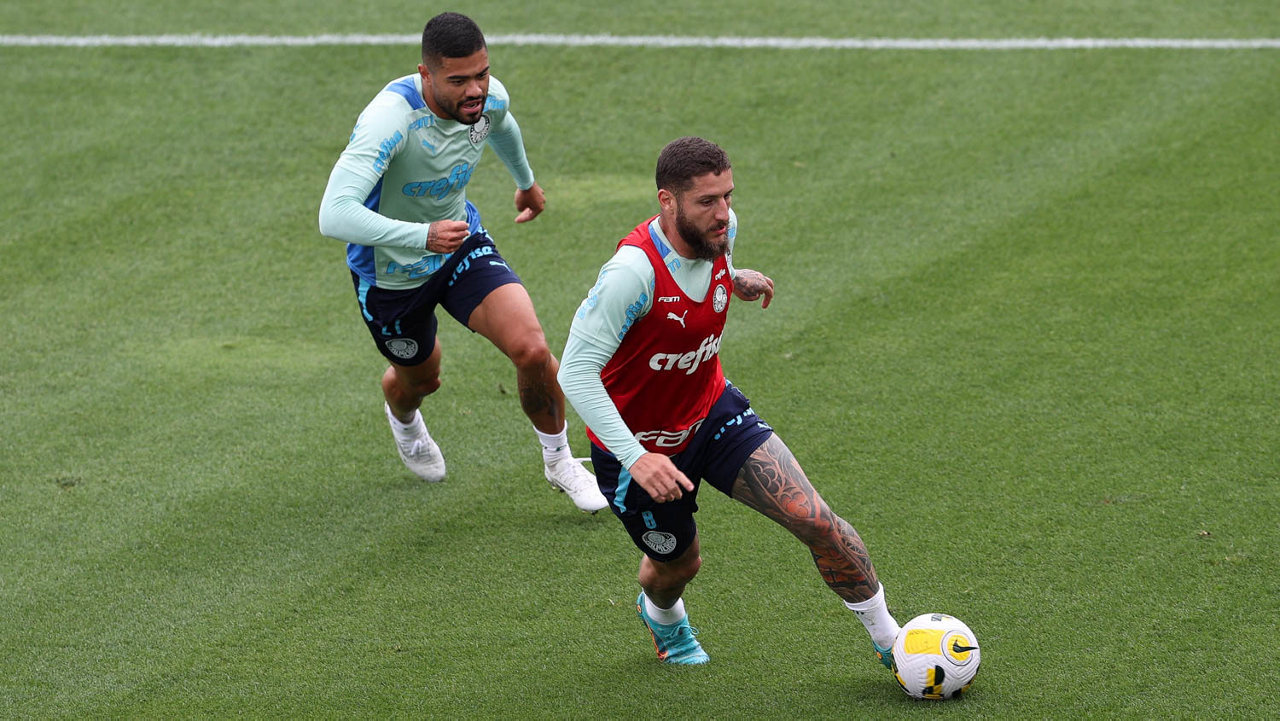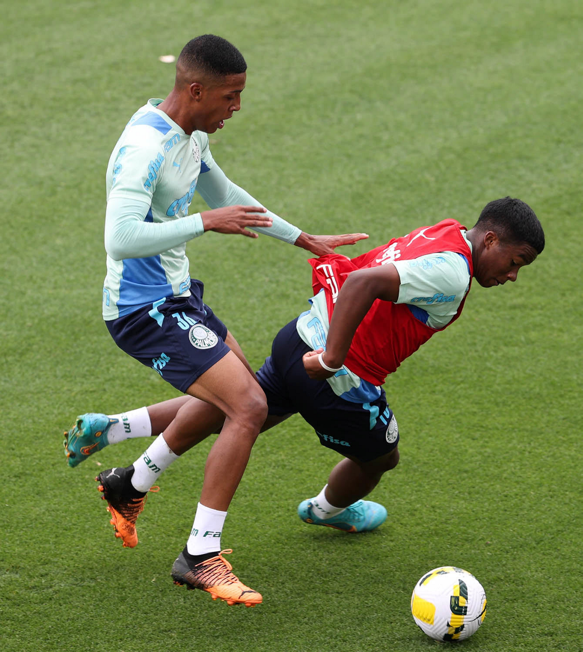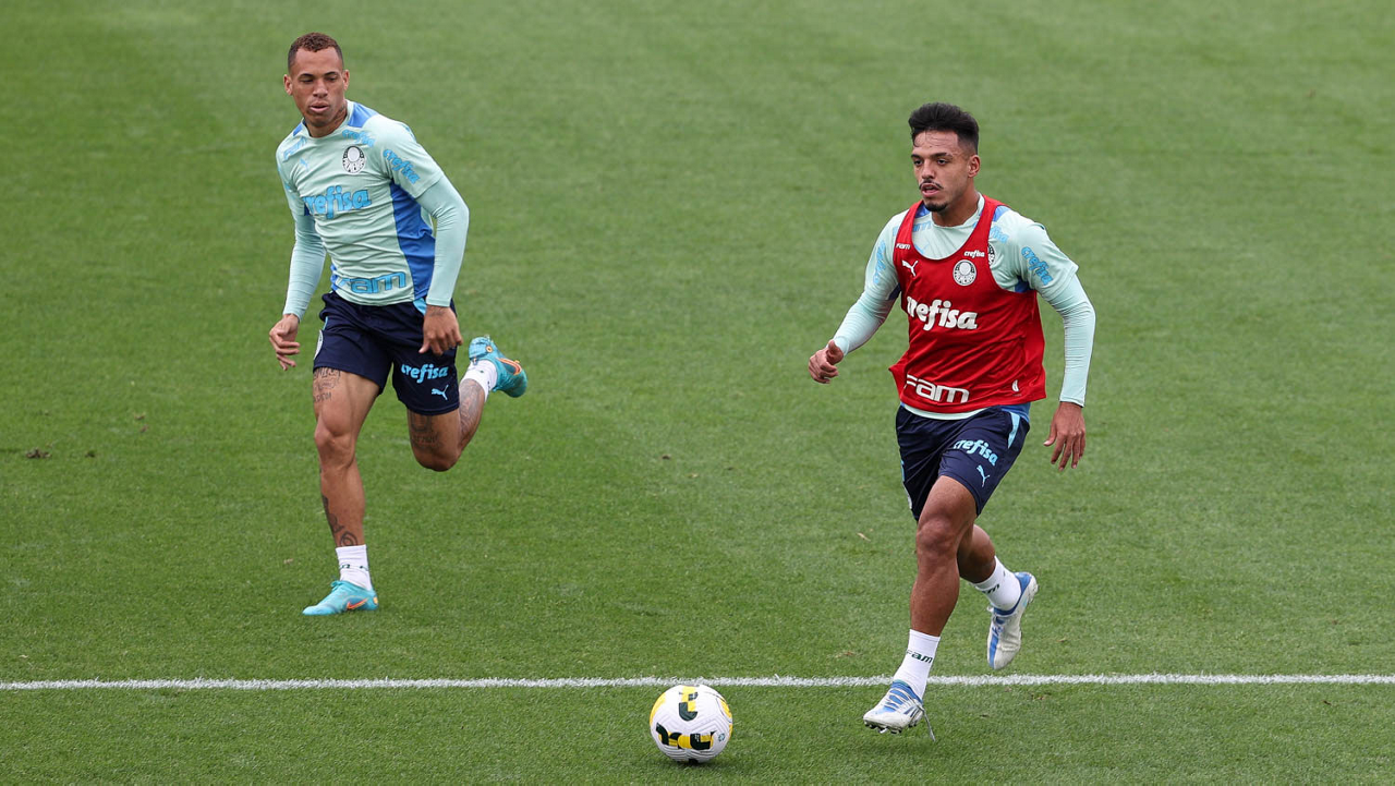 O preparador de goleiro Thales Damasceno, os goleiros Marcelo Lomba, Luis, Vinicius e Nathan (E/D em pé) e o preparador de goleiro Rogerio Godoy e o goleiro Weverton (D agachado), da SE Palmeiras, durante treinamento, na Academia de Futebol. (Foto: Cesar Greco)