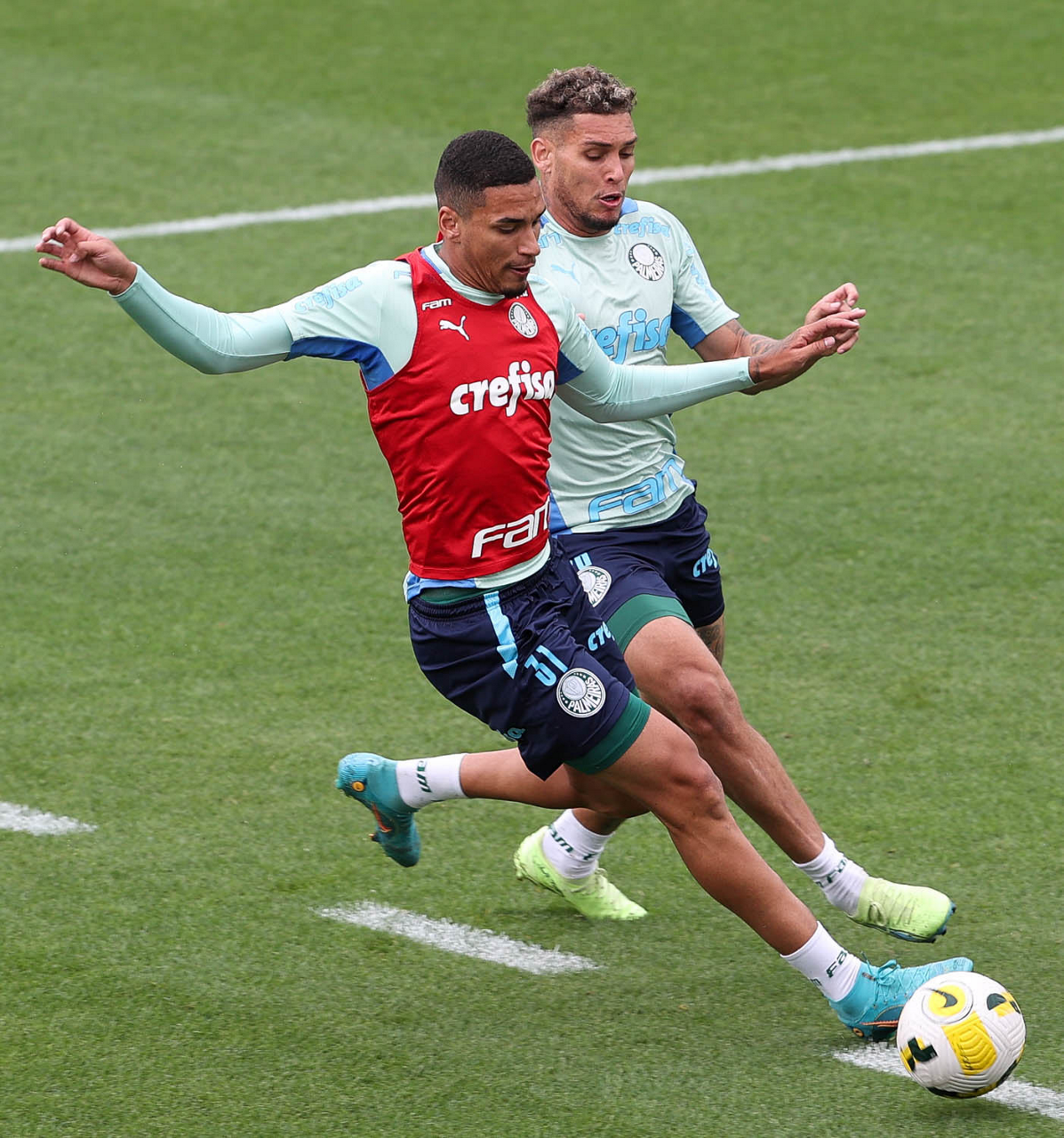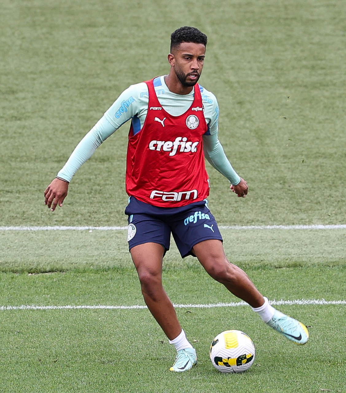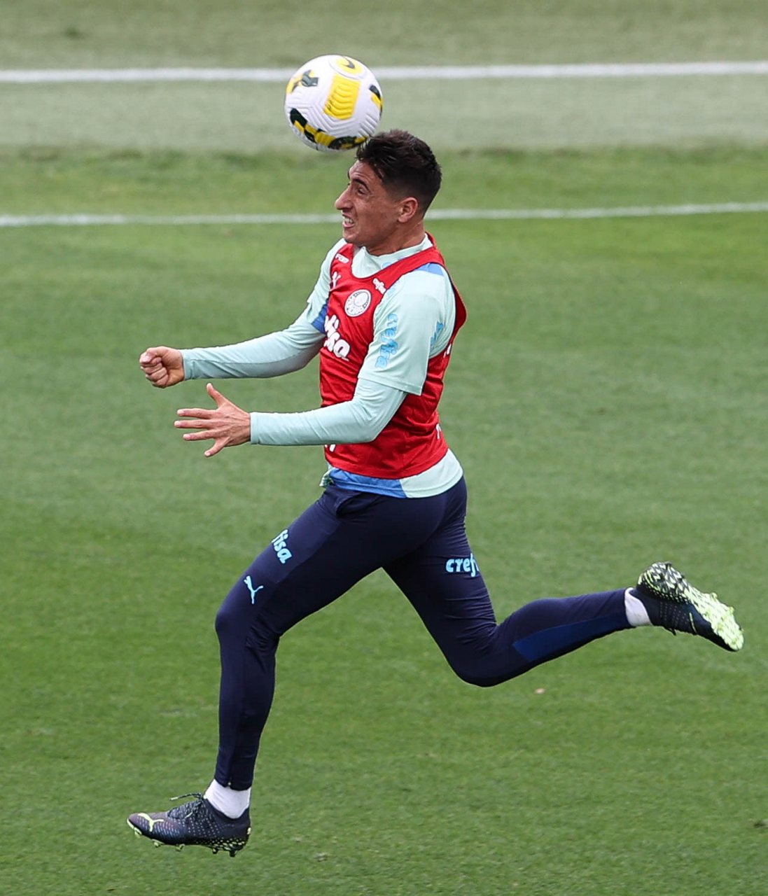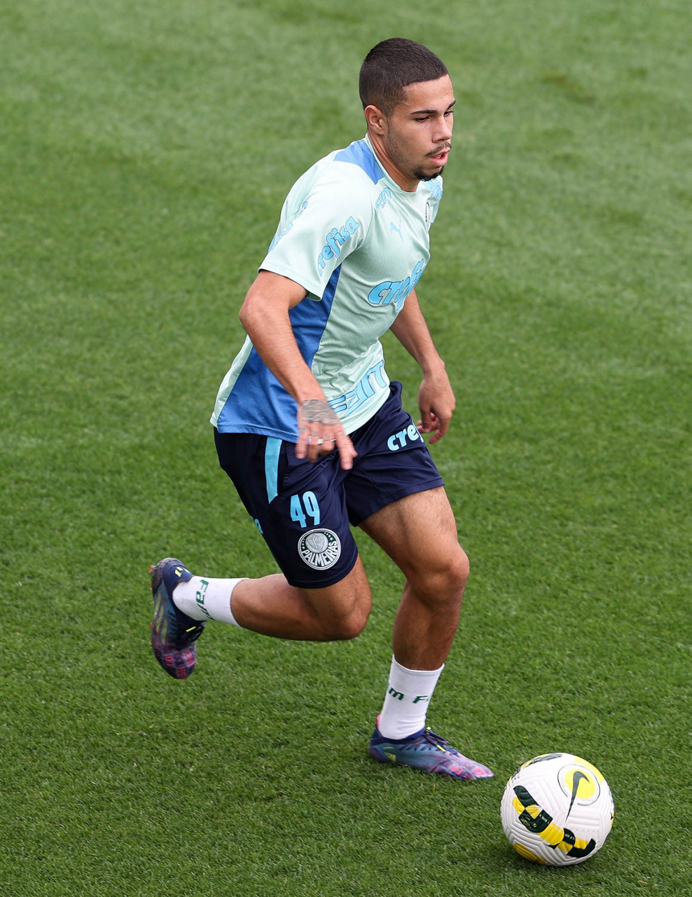 O preparador de goleiro Thales Damasceno, os goleiros Marcelo Lomba, Luis, Vinicius e Nathan (E/D em pé) e o preparador de goleiro Rogerio Godoy e o goleiro Weverton (D agachado), da SE Palmeiras, durante treinamento, na Academia de Futebol. (Foto: Cesar Greco)