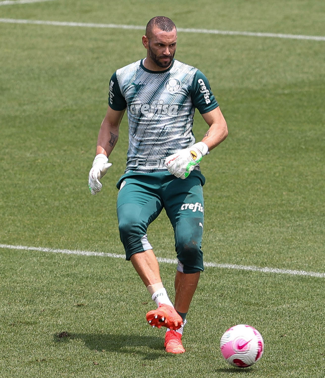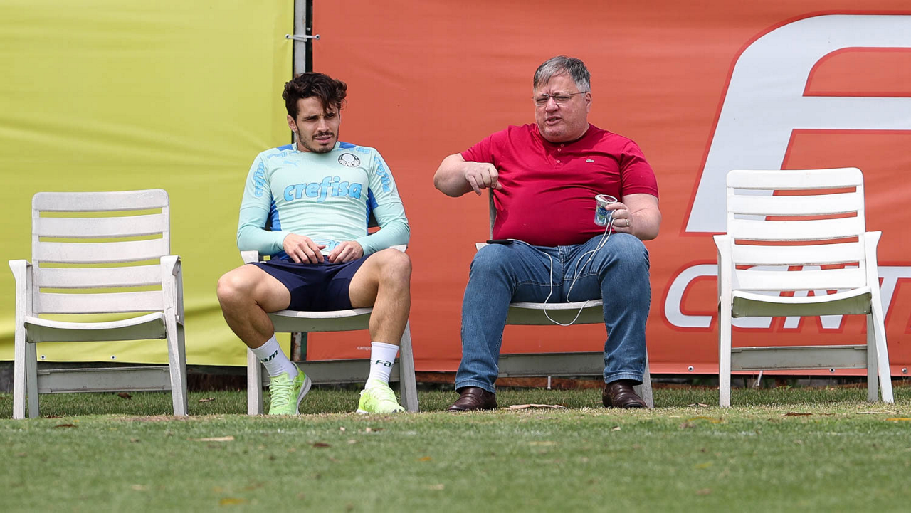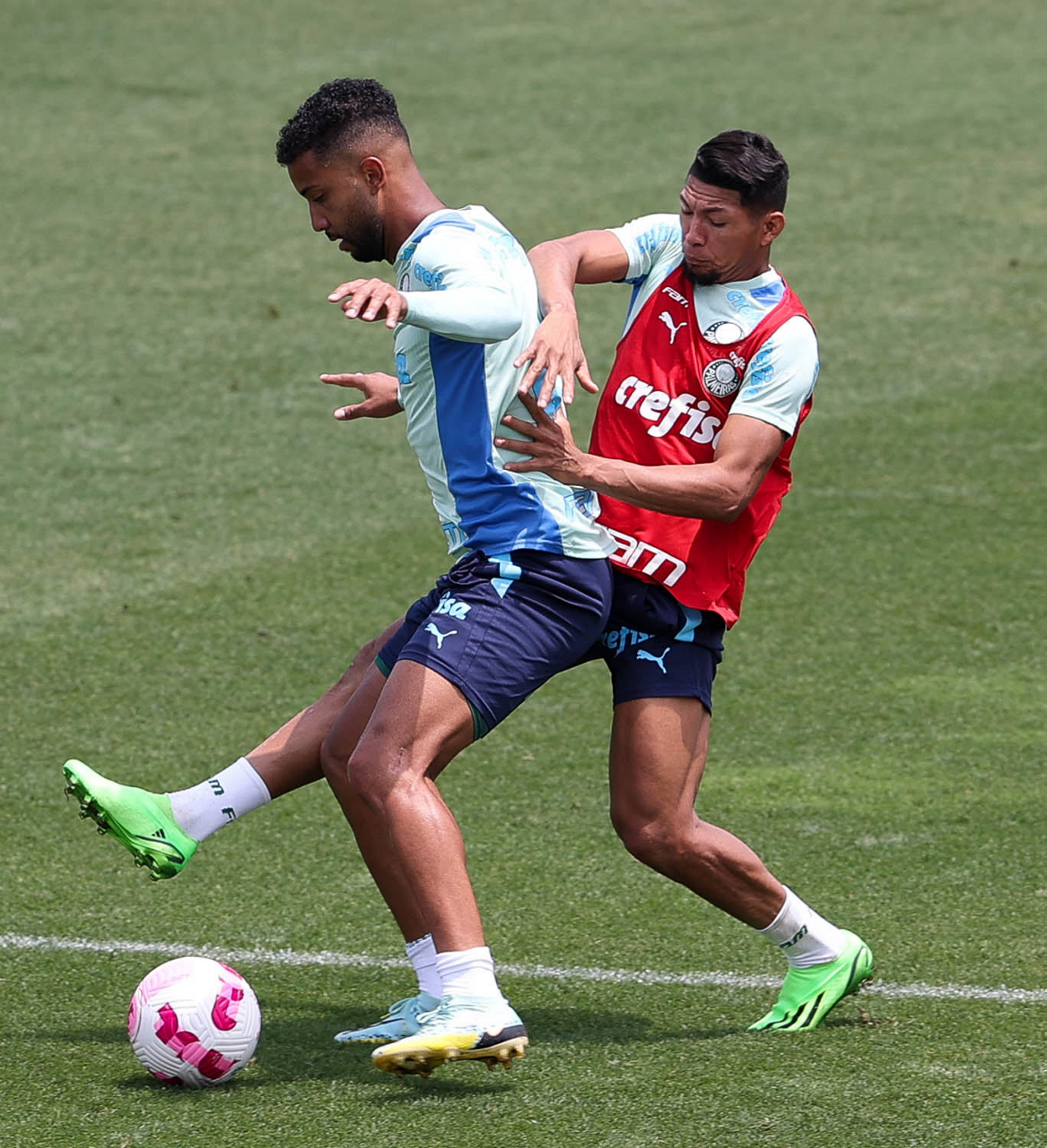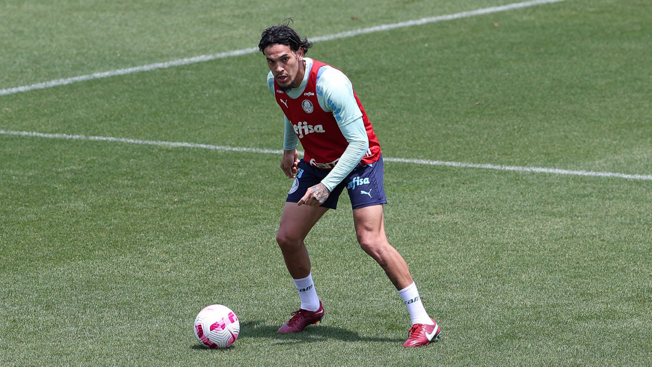Os jogadores Endrick, Gustavo Gómez, Wesley, Eduard Atuesta, Luan, Marcelo Lomba, Rafael Navarro e Rony (E/D em pé) e Mayke, Marcos Rocha, Gustavo Scarpa, Danilo e Vanderlan (E/D agachados), da SE Palmeiras, durante treinamento, na Academia de Futebol. (Foto: Cesar Greco)