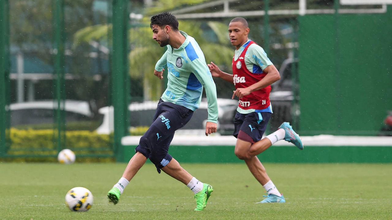 Os jogadores Benjamín Kuscevic e Wesley (D), da SE Palmeiras, durante treinamento, na Academia de Futebol. (Foto: Cesar Greco)