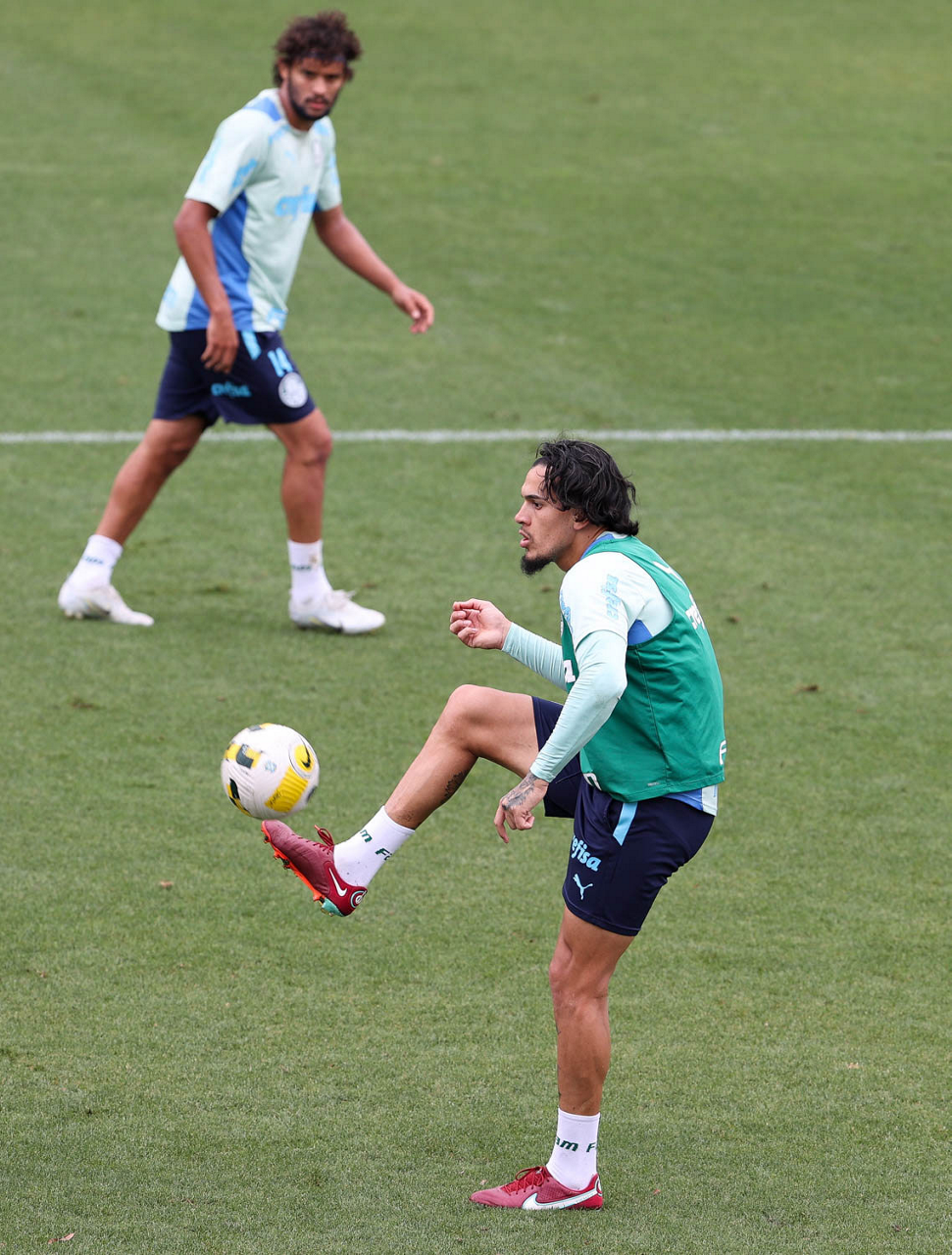 Os jogadores Endrick e Benjamín Kuscevic (D), da SE Palmeiras, durante treinamento, na Academia de Futebol. (Foto: Cesar Greco)