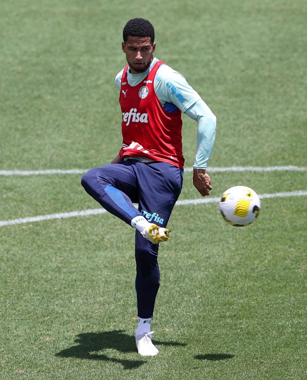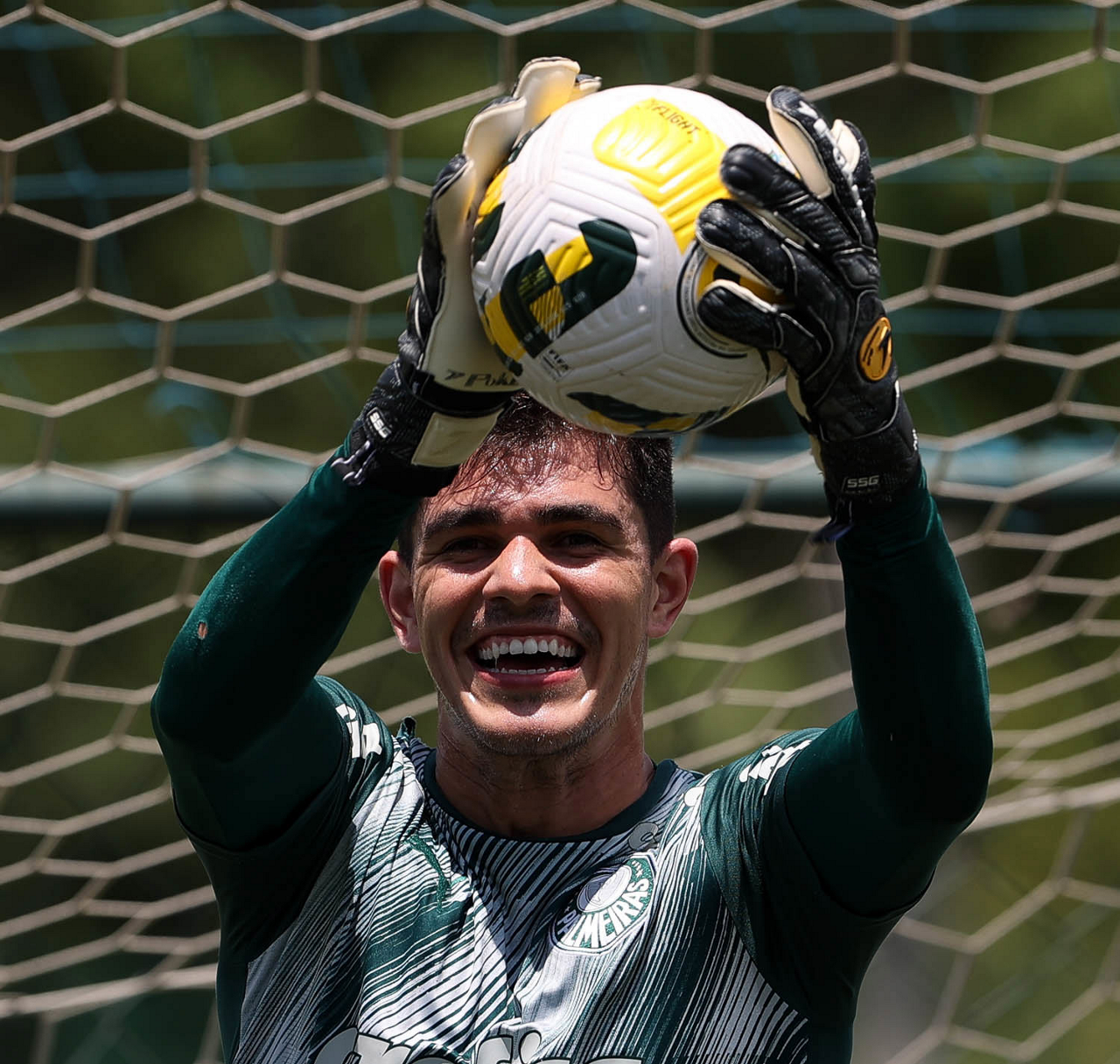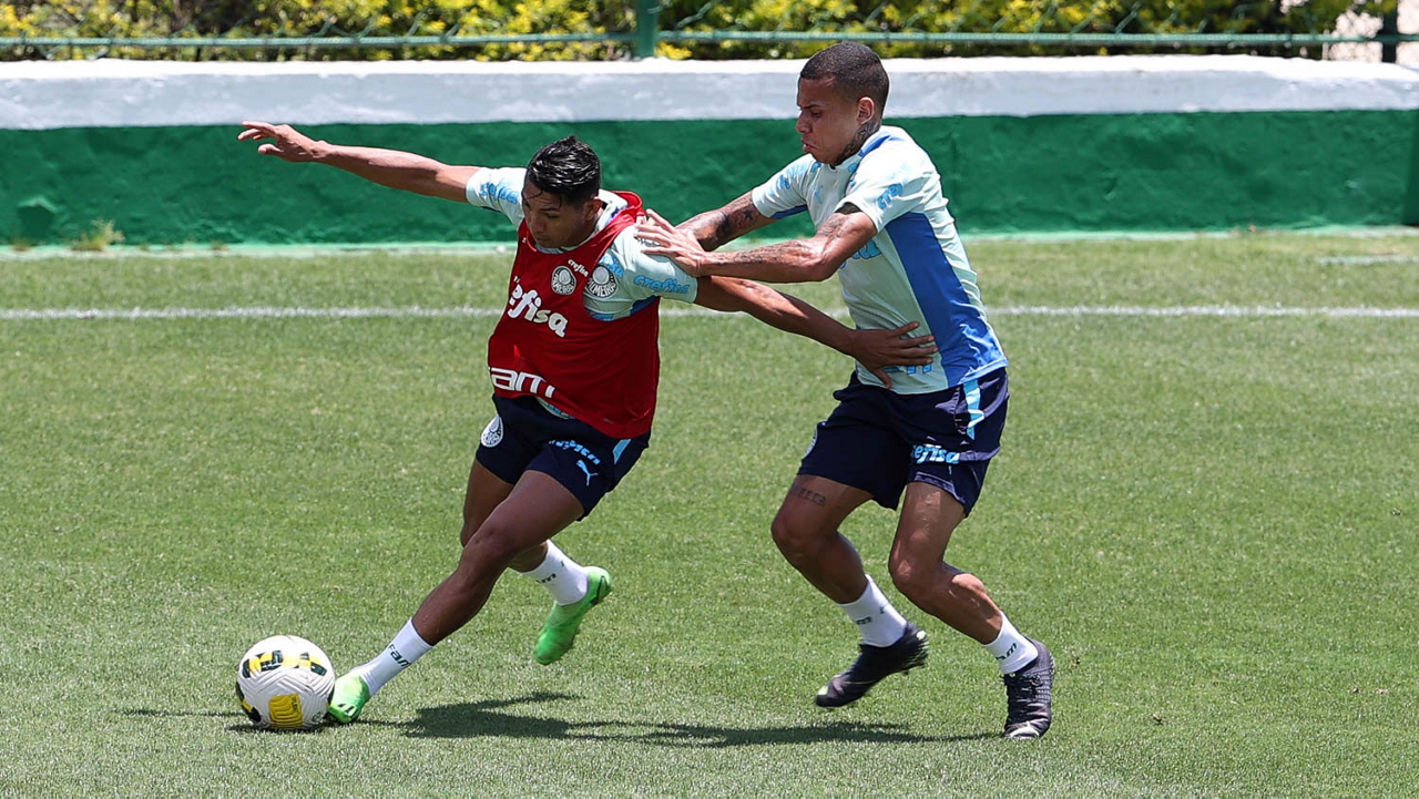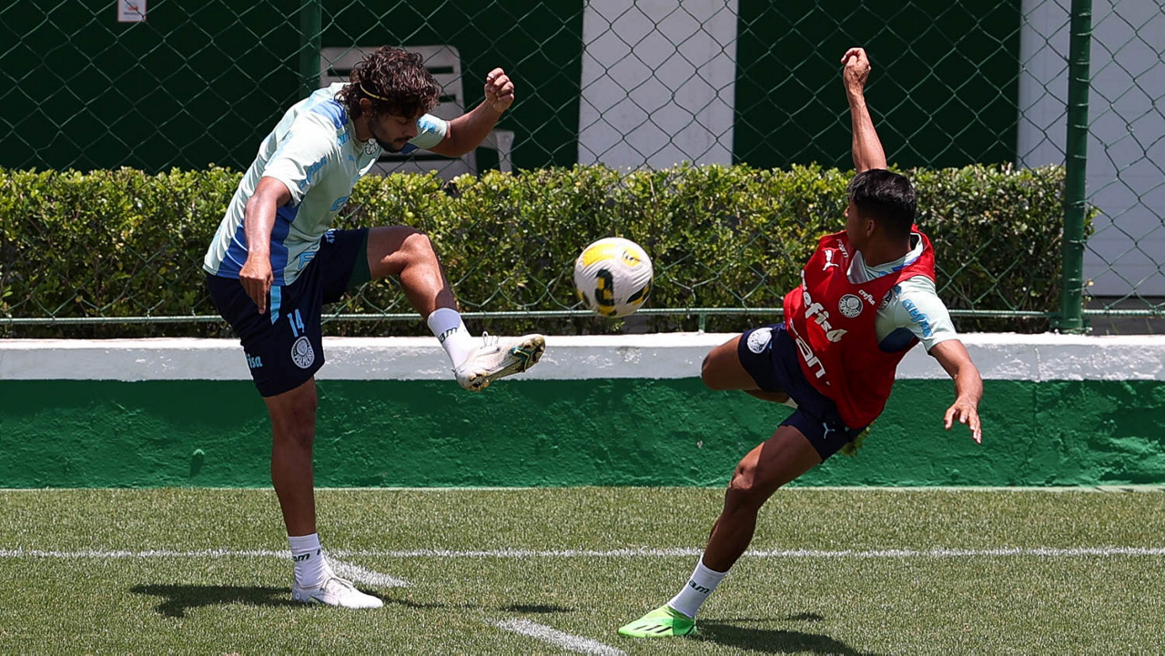 O goleiro Marcelo Lomba e os jogadores Marcos Rocha, Miguel Merentiel, Wesley, Luan, Eduard Atuesta e Garcia (E/D em pé) e Gustavo Gómez, Vanderlan, Dudu, Endrick, Gustavo Scarpa e Danilo (E/D agachados), da SE Palmeiras, durante treinamento, na Academia de Futebol. (Foto: Cesar Greco/Palmeiras/by Canon)