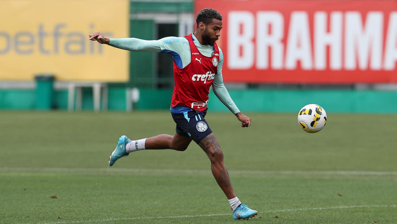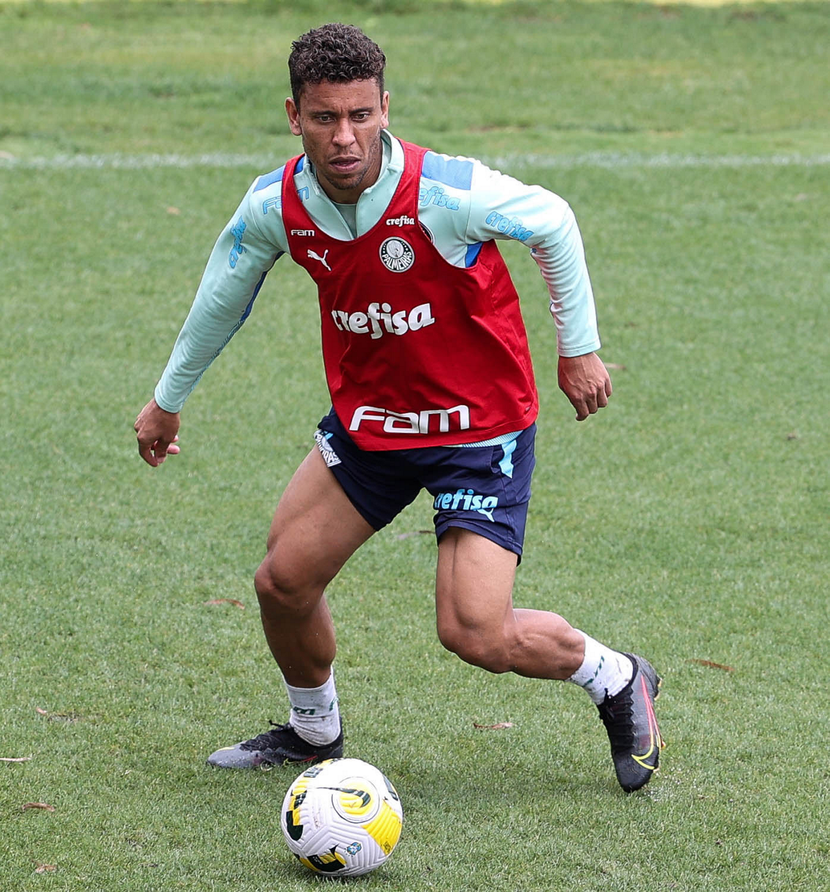 Os jogadores Benjamín Kuscevic, Luan, Joaquín Piquerez, Rafael Navarro, Eduard Atuesta, Marcelo Lomba e Miguel Merentiel (E/D em pé) e Mayke, Dudu, Gabriel Menino, Gustavo Scarpa e Flaco López (E/D agachados), da SE Palmeiras, durante treinamento, na Academia de Futebol. (Foto: Cesar Greco/Palmeiras/by Canon)
