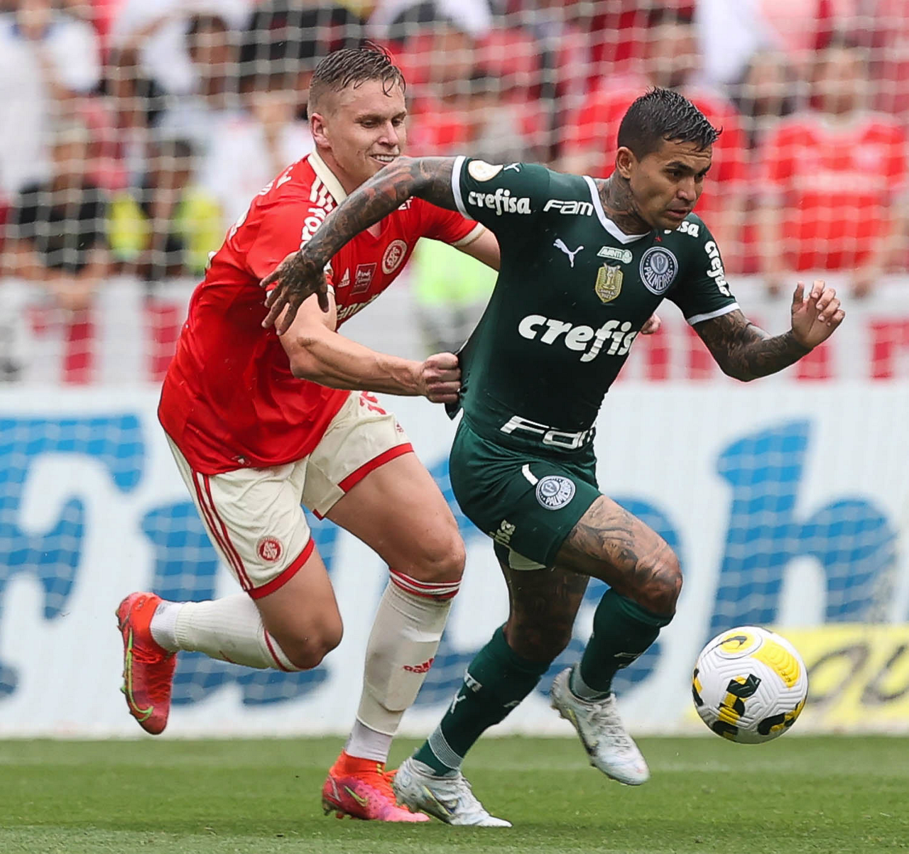 O jogador Dudu, da SE Palmeiras, disputa bola com o jogador, do SC Internacional, durante partida válida pela trigésima oitava rodada, do Campeonato Brasileiro, Série A, no estádio Beira-Rio. (Foto: Cesar Greco/Palmeiras/by Canon)