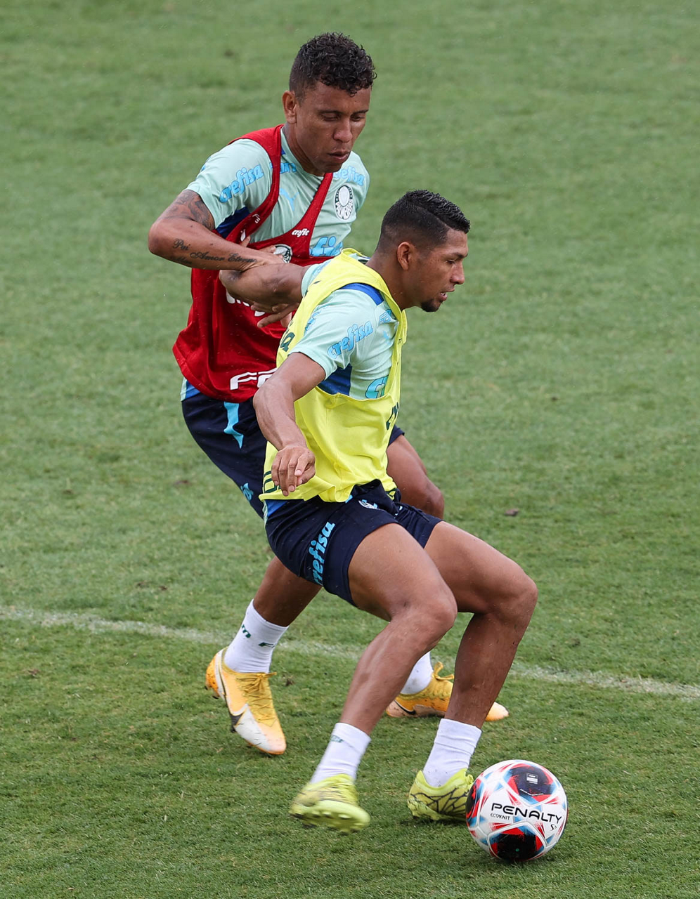 Os jogadores Gustavo Gómez e Miguel Merentiel (D), da SE Palmeiras, durante treinamento, na Academia de Futebol. (Foto: Cesar Greco/Palmeiras/by Canon)
