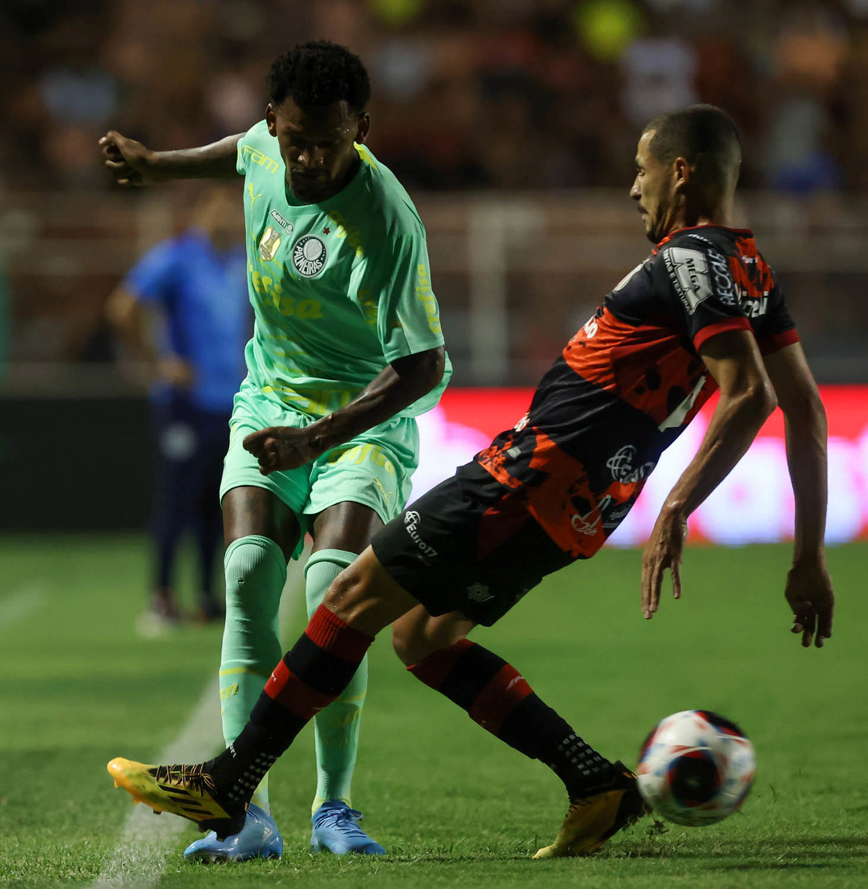 O jogador Miguel Merentiel, da SE Palmeiras, disputa bola com o jogador Lucas Siqueira, do Ituano FC, durante partida válida pela quarta rodada, do Campeonato Paulista, Série A1, no Estádio Municipal Dr Novelli Junior. (Foto: Cesar Greco/Palmeiras/by Canon)
