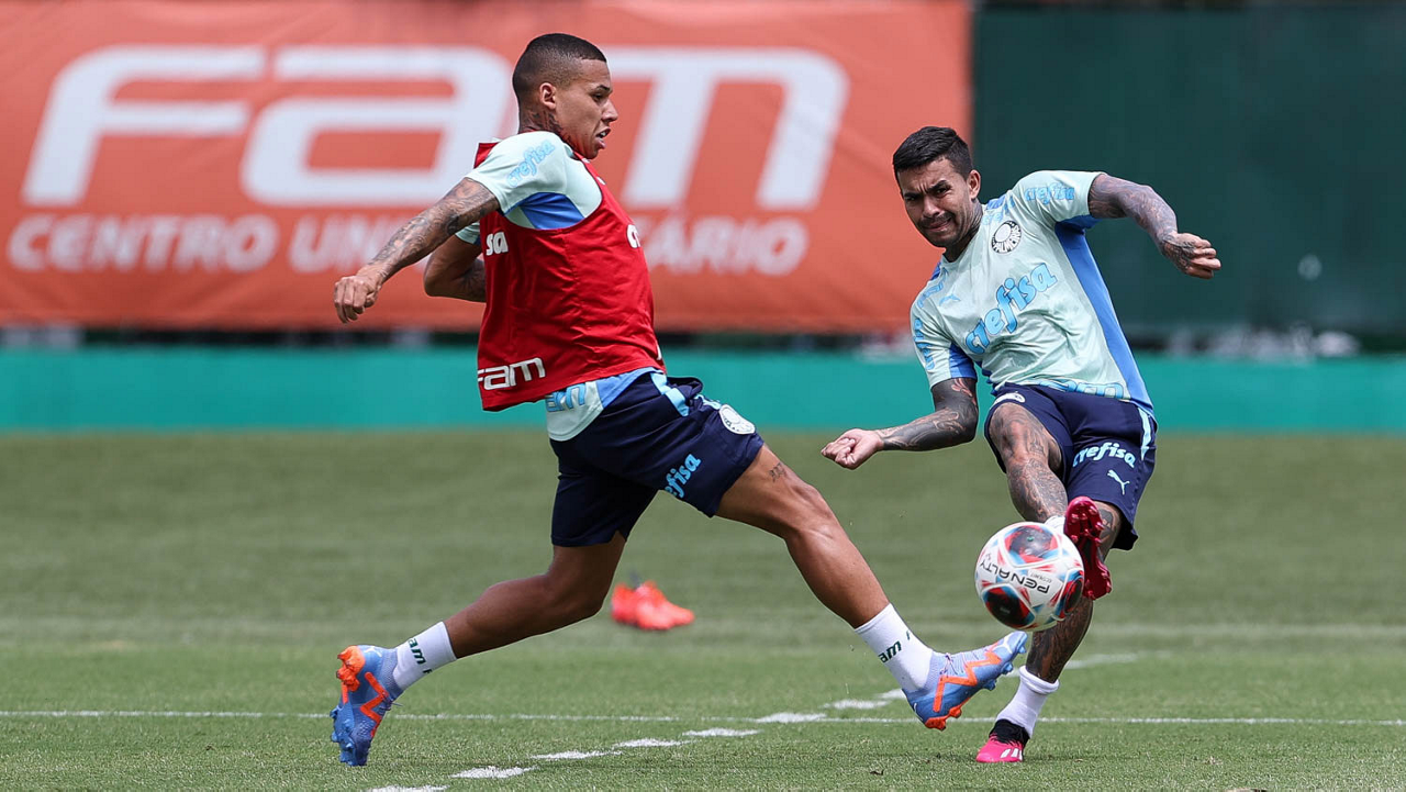 Os jogadores Raphael Veiga e Zé Rafael (D), da SE Palmeiras, durante treinamento, na Academia de Futebol. (Foto: Cesar Greco/Palmeiras/by Canon)