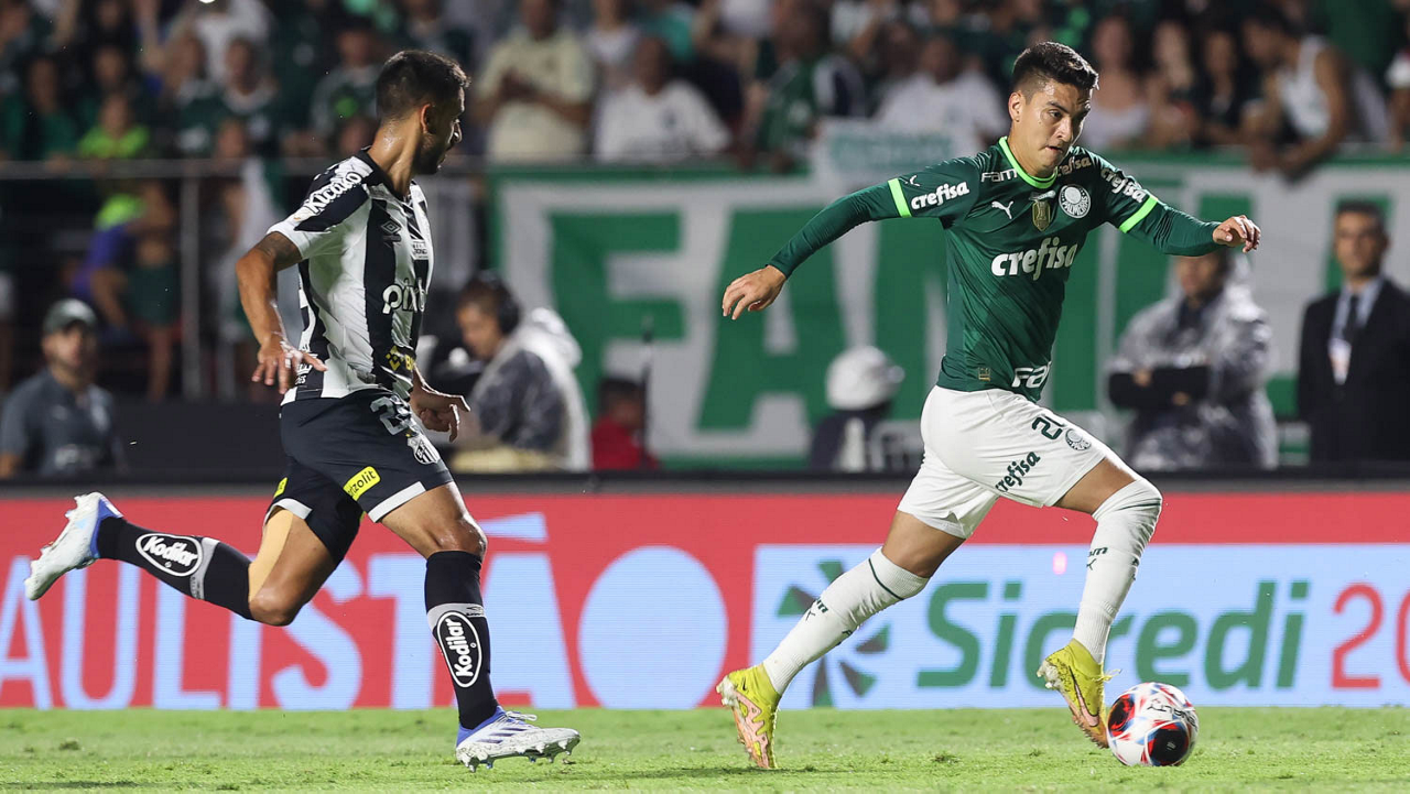 O jogador Joaquín Piquerez, da SE Palmeiras, disputa bola com o jogador do Santos FC, durante partida válida pela sexta rodada, do Campeonato Paulista, Série A1, no Estádio do Morumbi. (Foto: Cesar Greco/Palmeiras/by Canon)