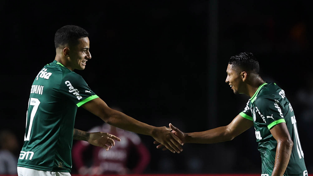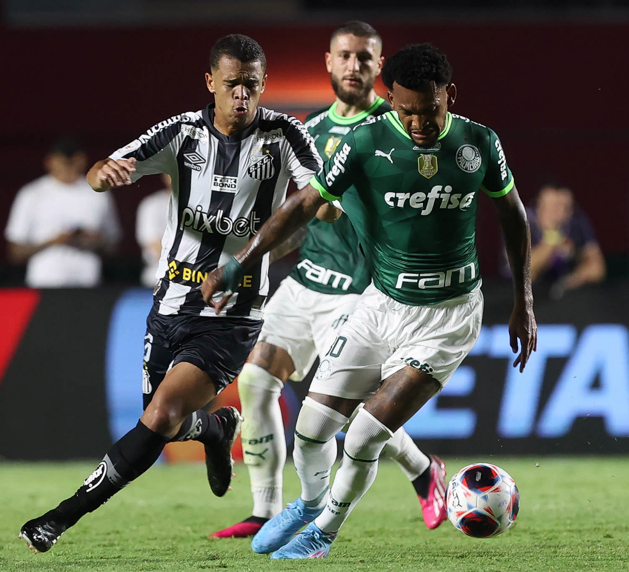 Os jogadores Gabriel Menino e Raphael Veiga (D), da SE Palmeiras, disputam bola com o jogador do Santos FC, durante partida válida pela sexta rodada, do Campeonato Paulista, Série A1, no Estádio do Morumbi. (Foto: Cesar Greco/Palmeiras/by Canon)