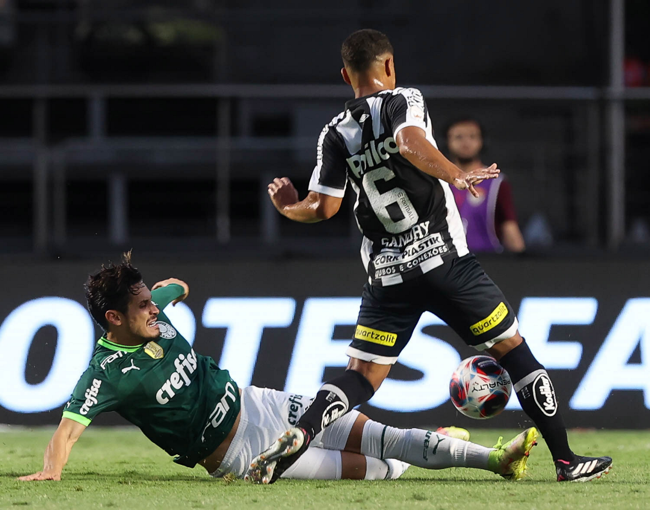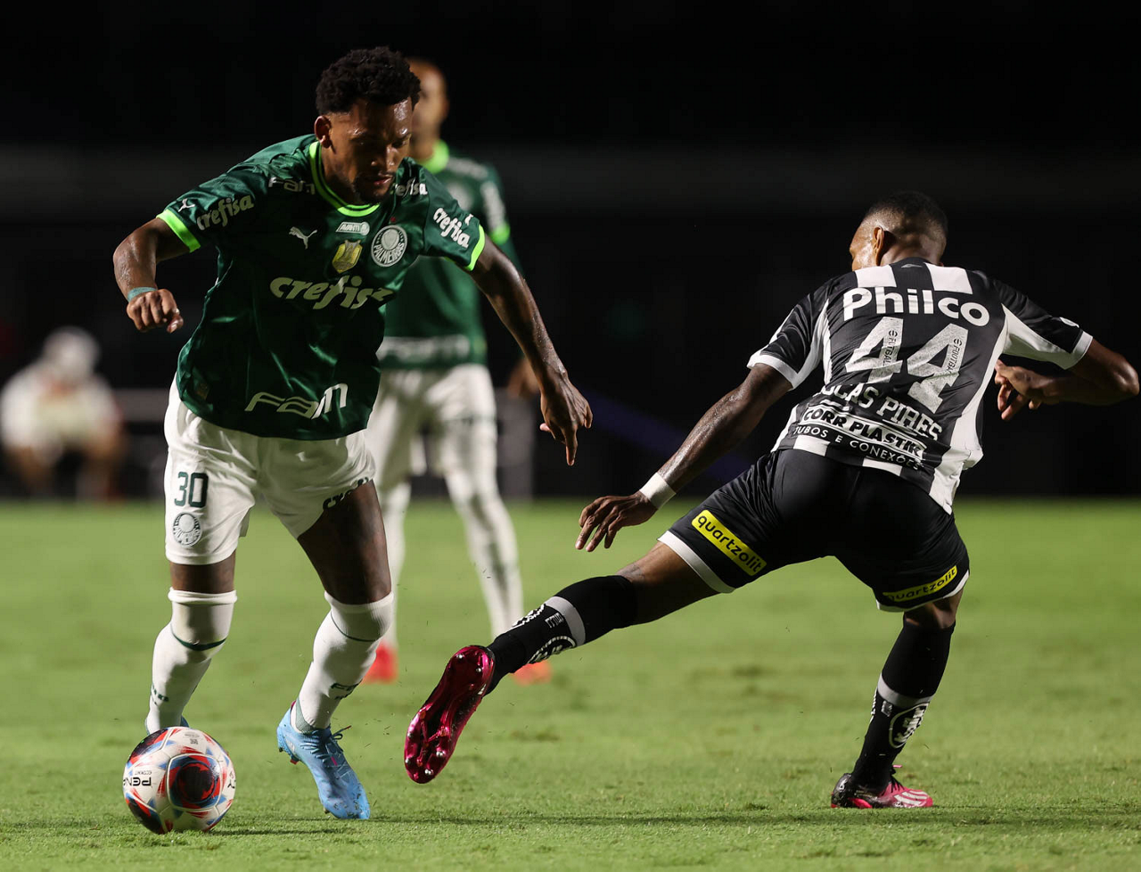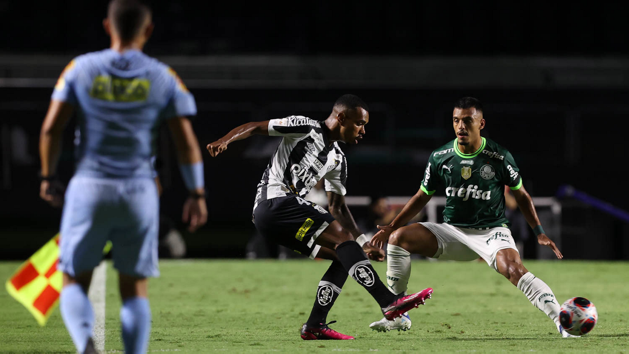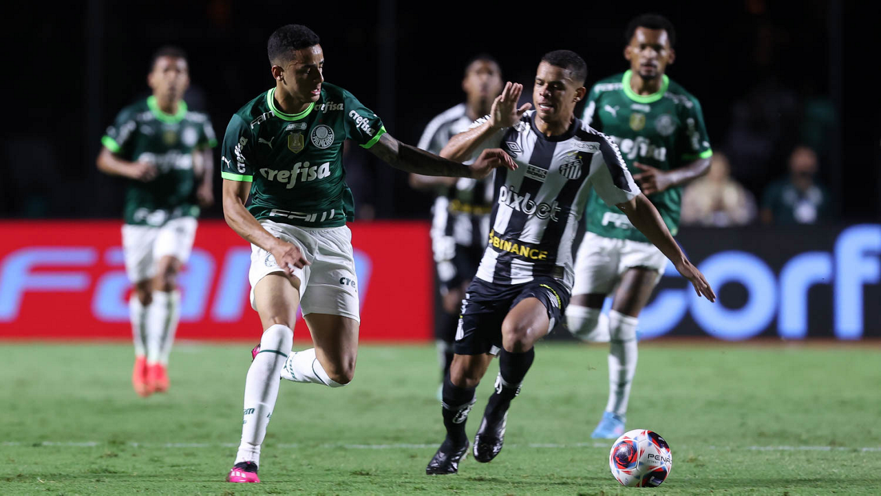 O jogador Gabriel Menino, da SE Palmeiras, disputa bola com o jogador Bauermann, do Santos FC, durante partida válida pela sexta rodada, do Campeonato Paulista, Série A1, no Estádio do Morumbi. (Foto: Cesar Greco/Palmeiras/by Canon)