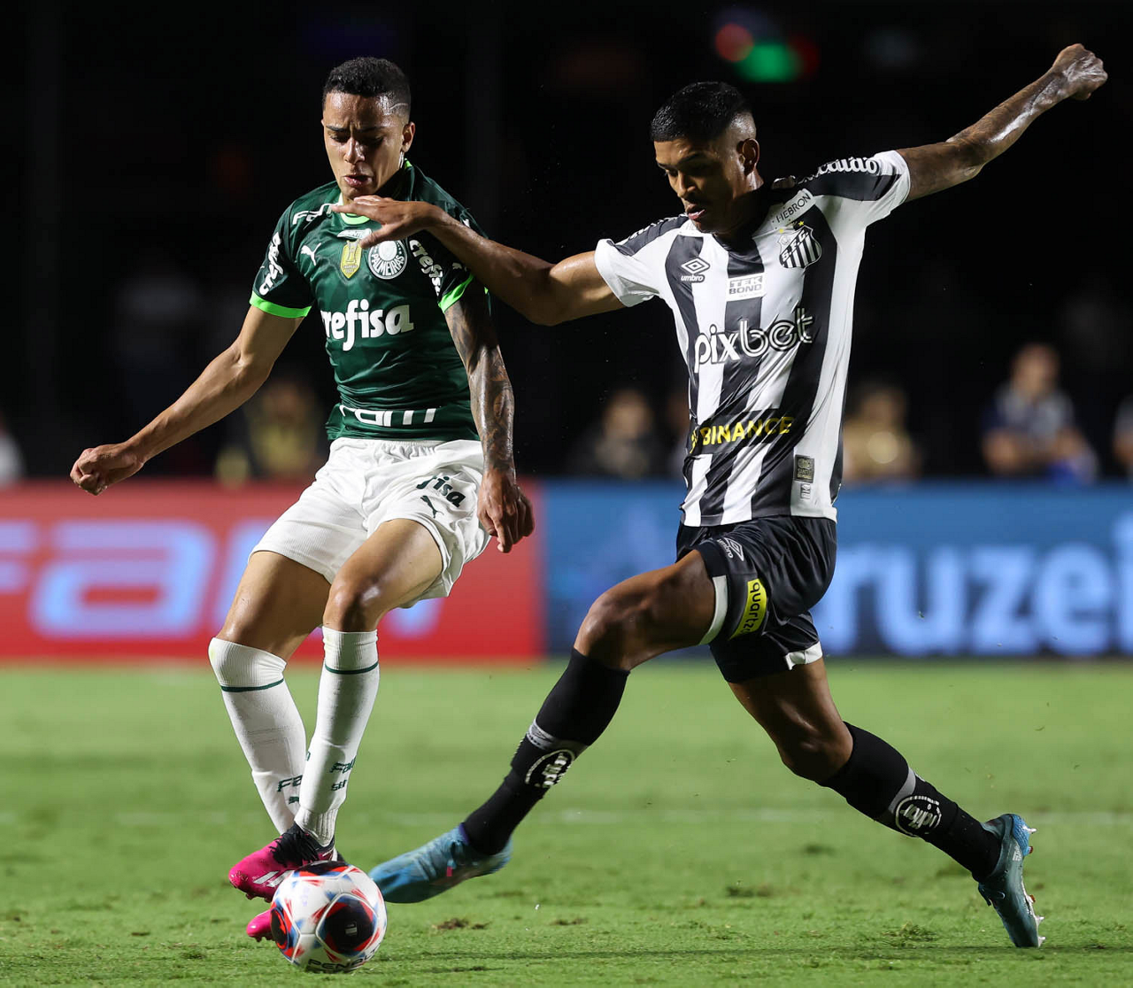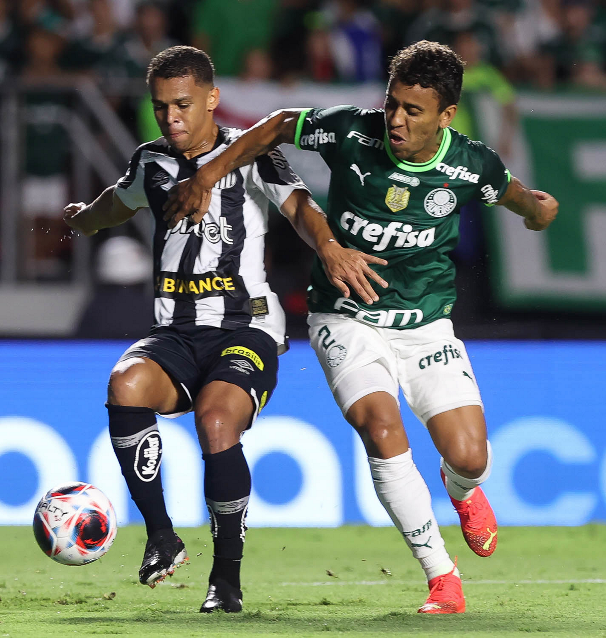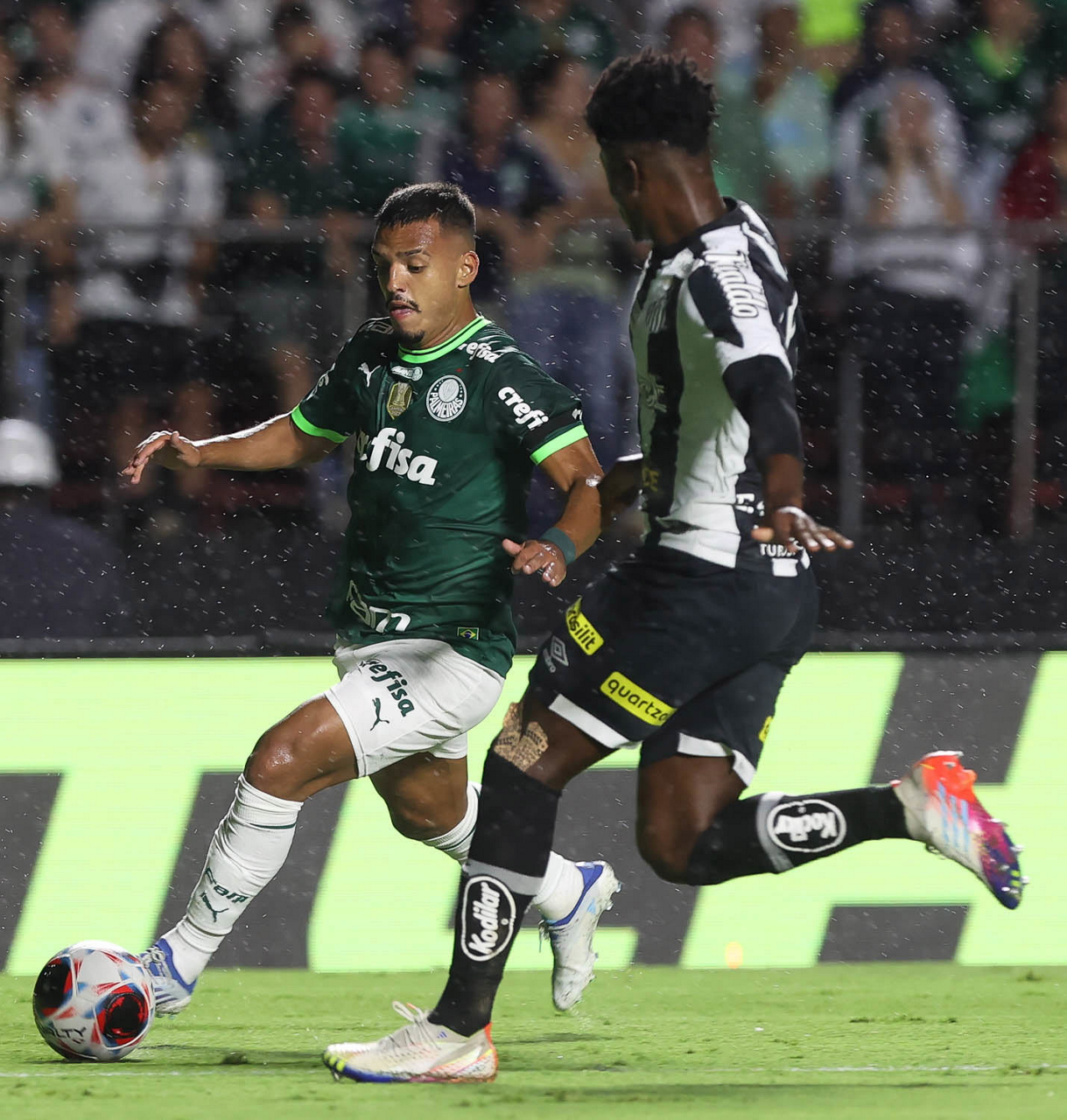 O jogador Gabriel Menino, da SE Palmeiras, disputa bola com o jogador Bauermann, do Santos FC, durante partida válida pela sexta rodada, do Campeonato Paulista, Série A1, no Estádio do Morumbi. (Foto: Cesar Greco/Palmeiras/by Canon)